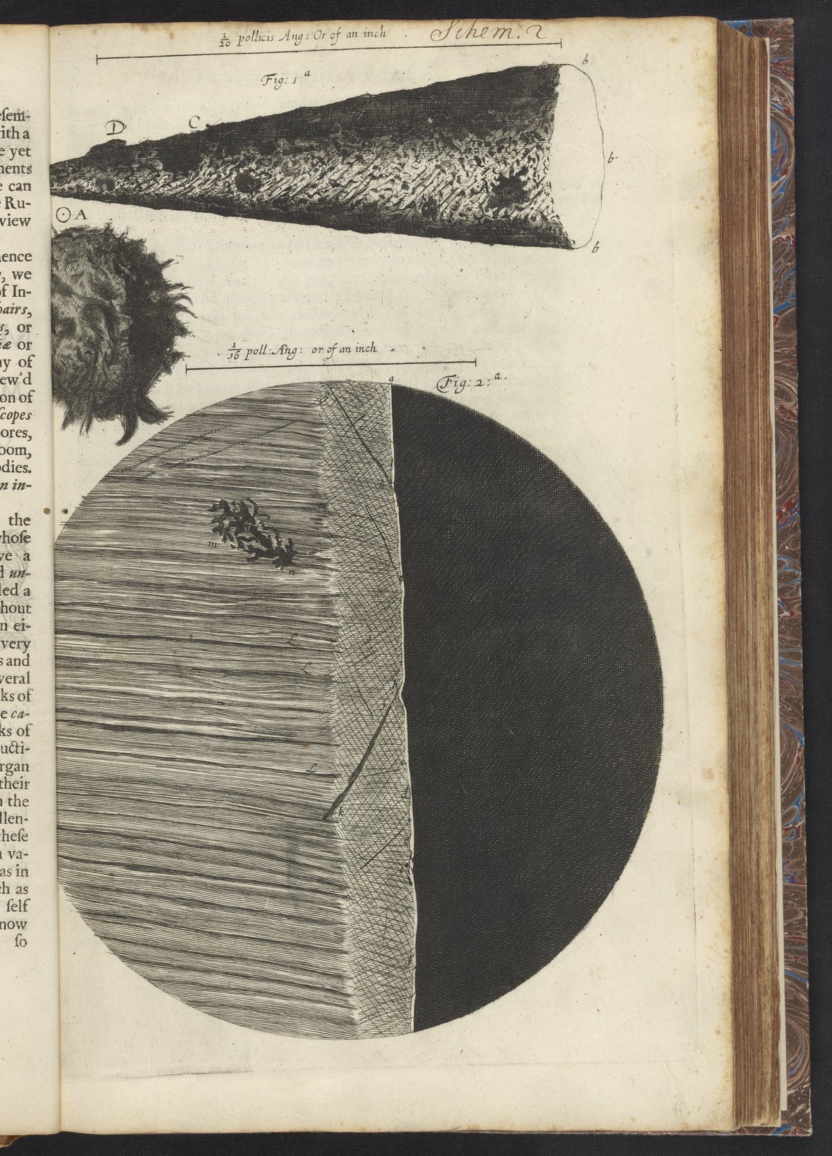 Engravings from Schem. 2 of the first edition of Robert Hooke's seminal volume, Micrographia : or, Some physiological descriptions of minute bodies made by magnifying glasses. With observations and inquiries thereupon. Figure 1 depicts the point of a sharp small needle. Figure 2 depicts the edge of a razor.