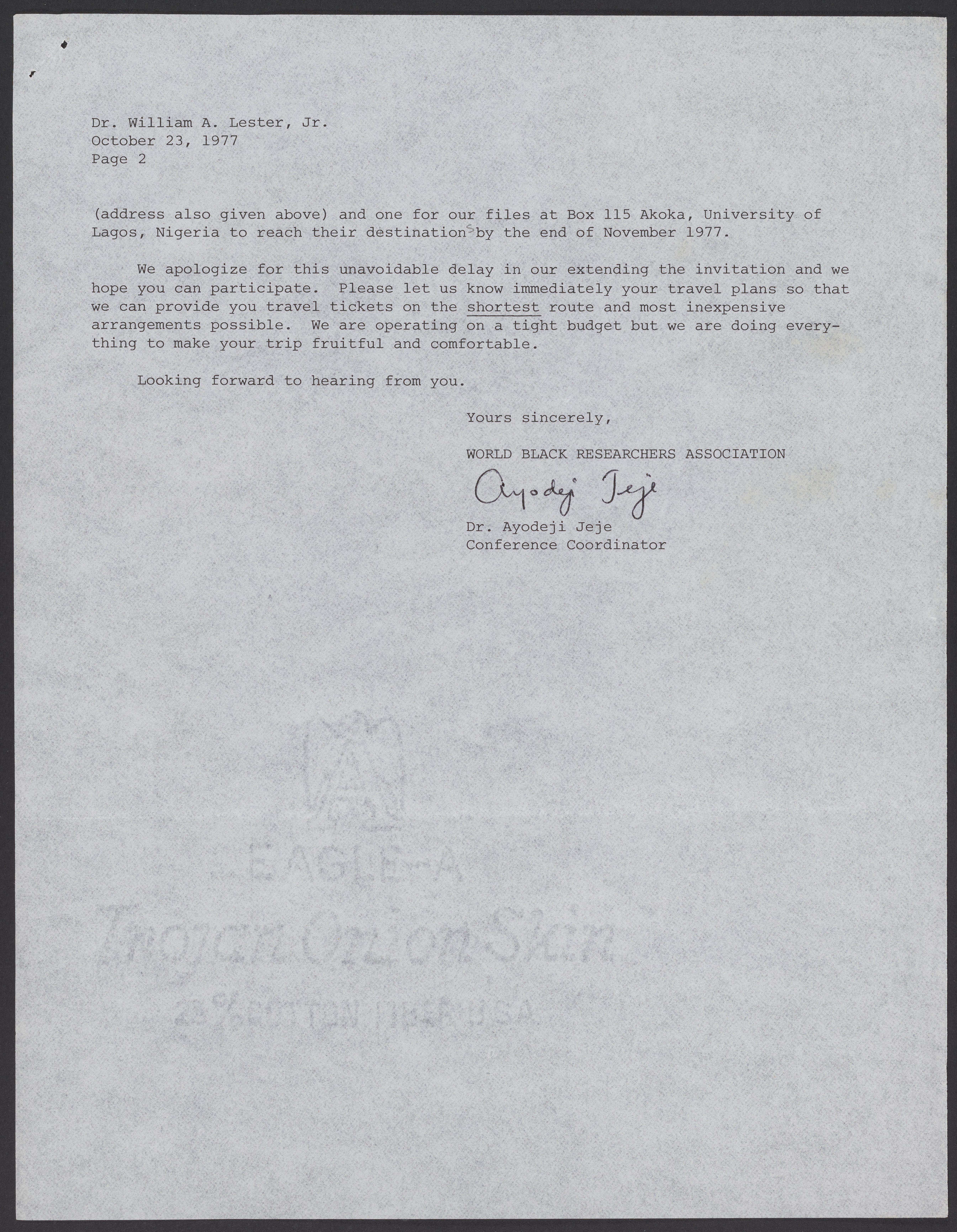 Letter from Ayodeji Jeje to William A. Lester, Jr. (1937-) inviting him to a conference in Lagos, Nigeria sponsored by the World Black Researchers Association (WBRA). Themed "Survival," the conference was about the widening gap between "developed" and "undeveloped" nations.
