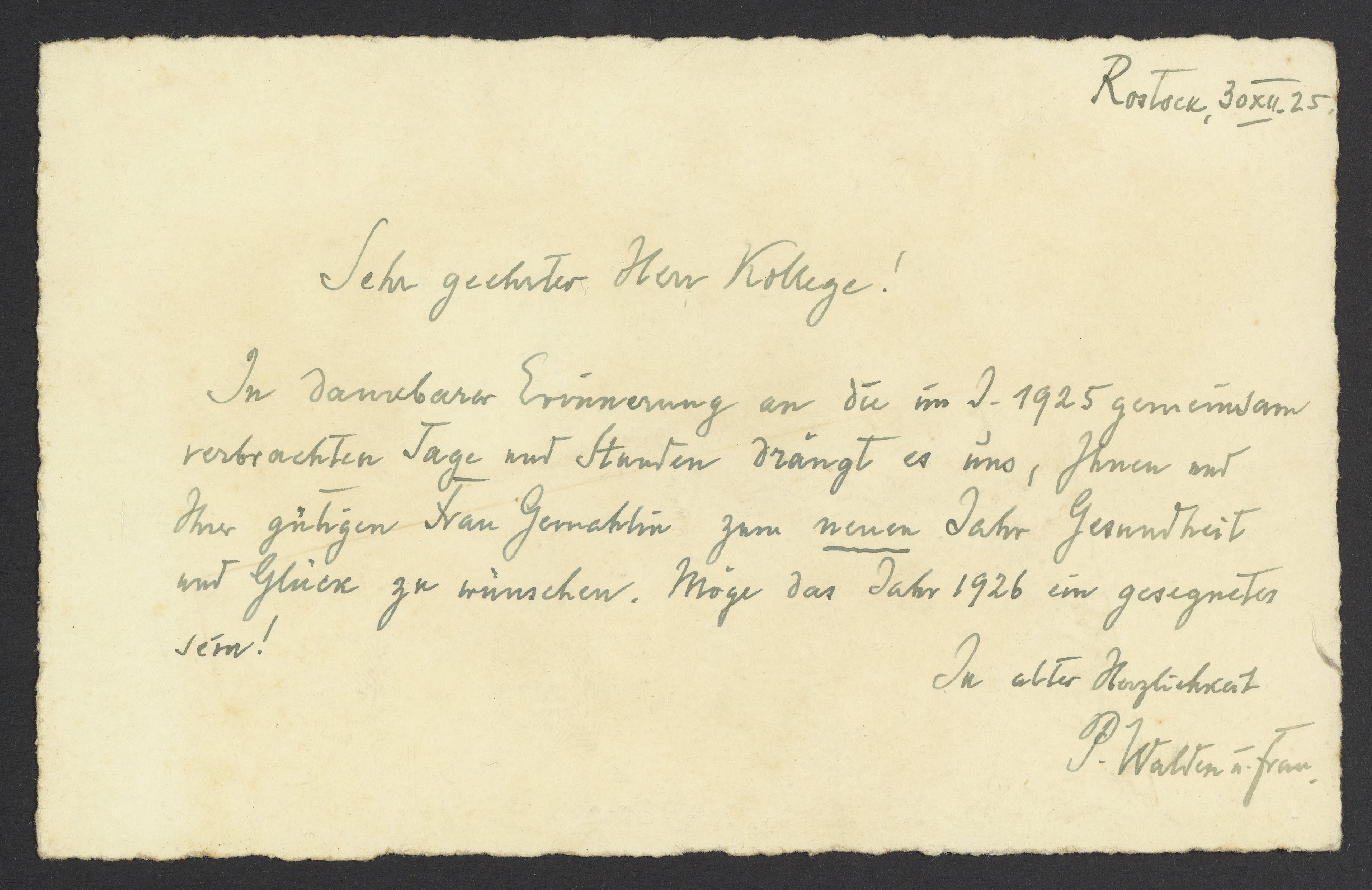 Walden, Paul. “Letter from Paul Walden to Georg Bredig, 1925,” December 30, 1925. Papers of Georg and Max Bredig, Box 22. Science History Institute. Philadelphia. https://digital.sciencehistory.org/works/tkb5kju.