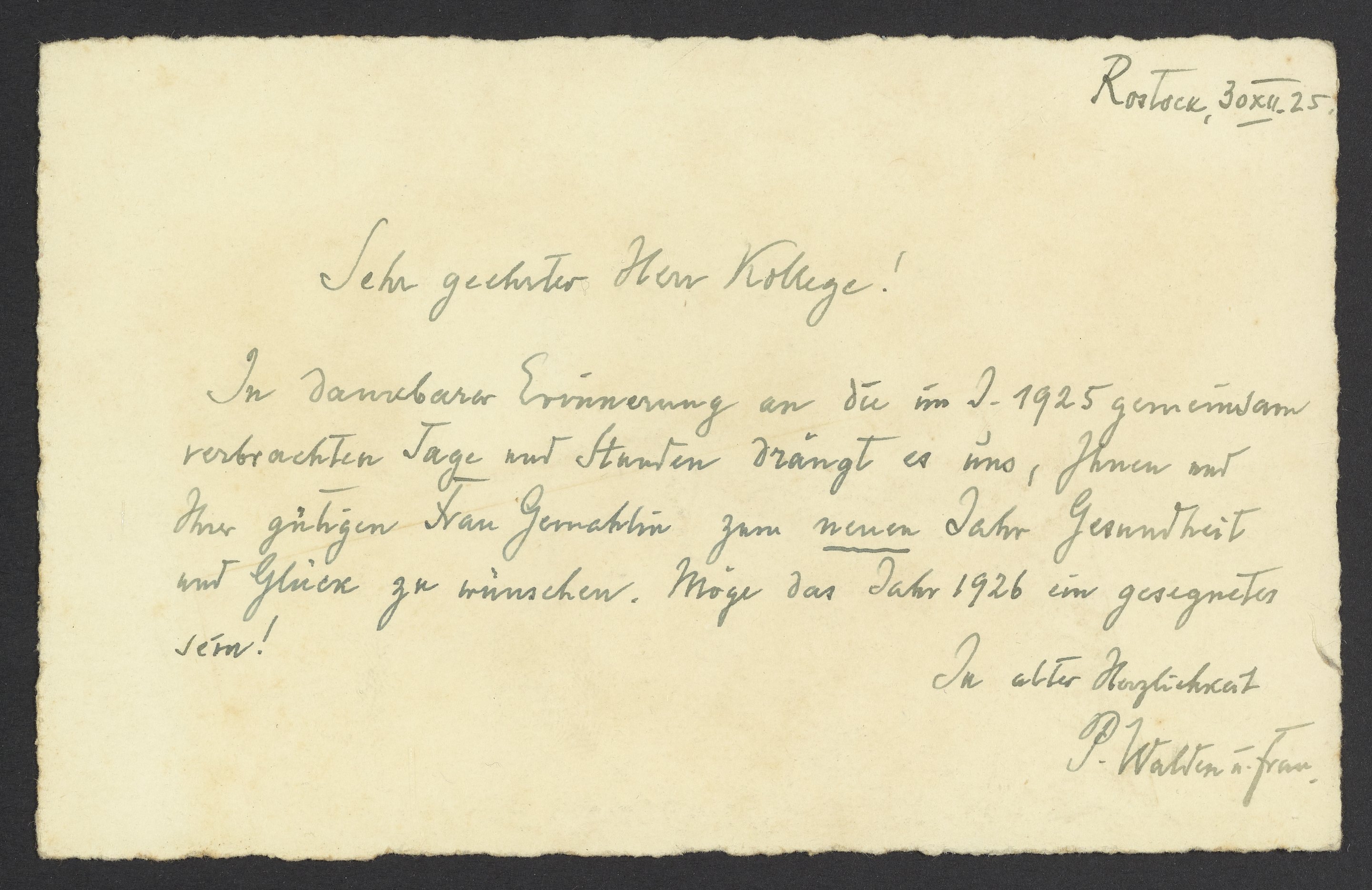 In dankbarer Erinnerung an die im J. 1925 gemeinsam verbrachten Tage und Stunden drängt es uns, Ihnen und Ihrer gnädigen Frau Gemahlin zum neuen Jahr Gesundheit und Glück zu wünschen. Möge das Jahr 1926 ein gesegnetes sein!