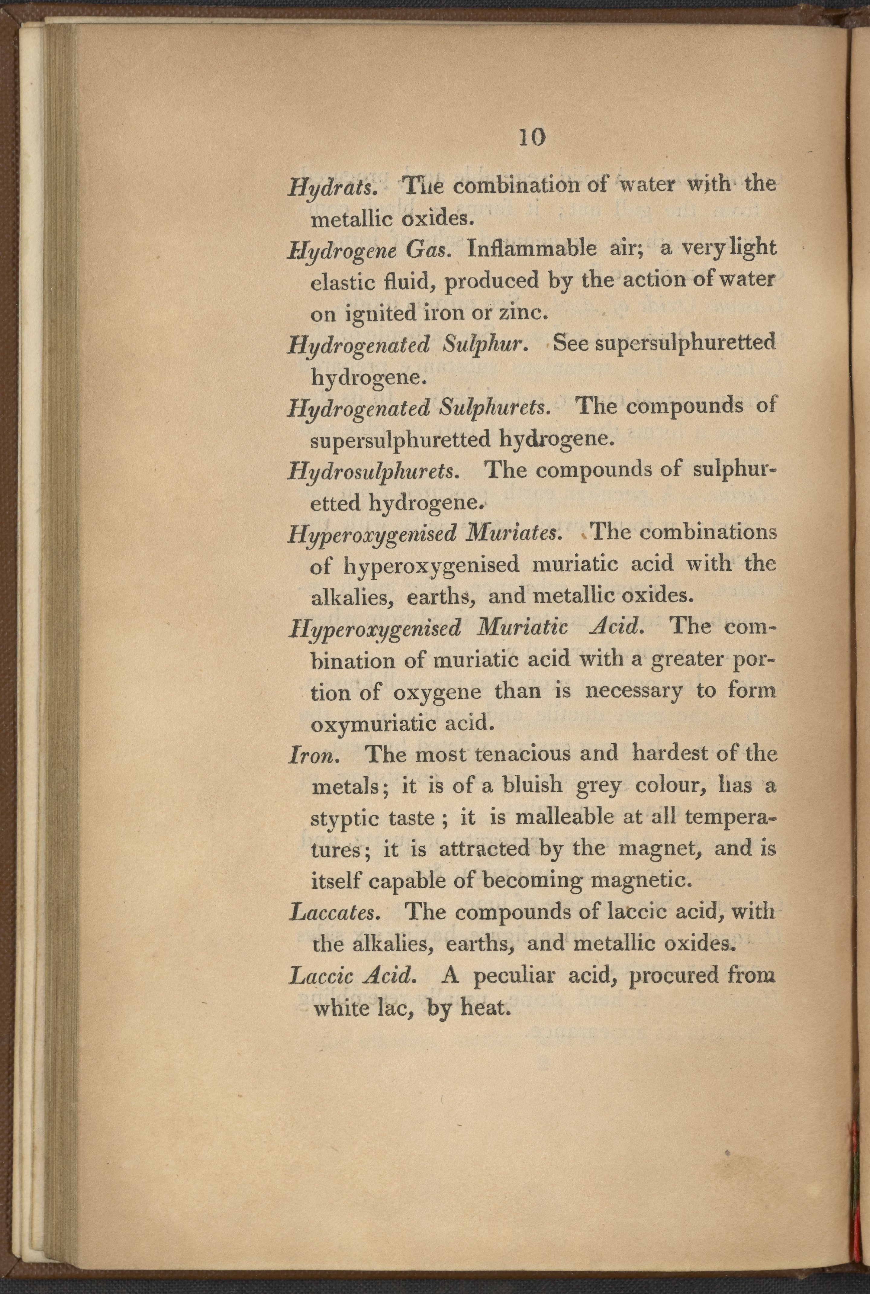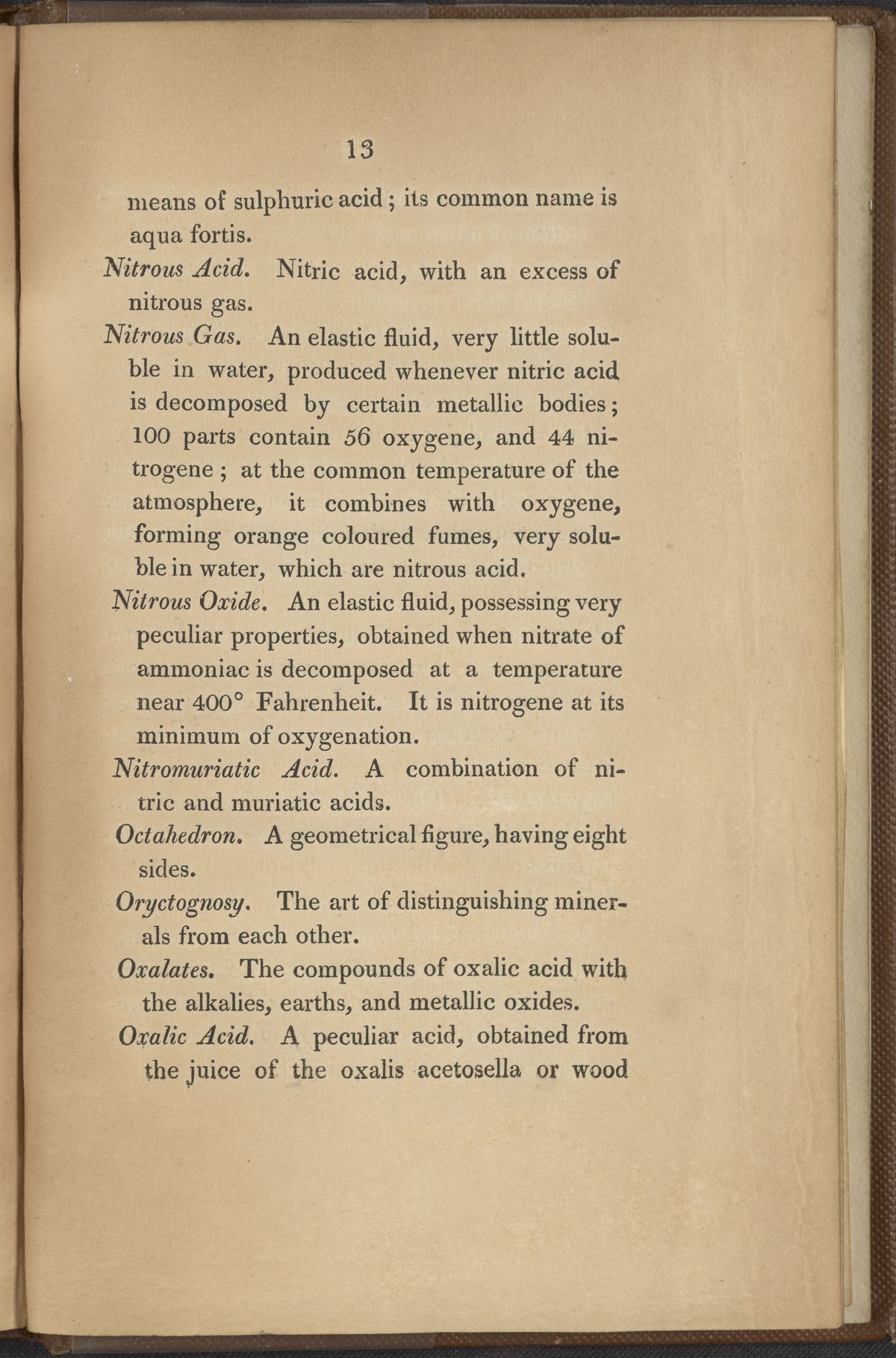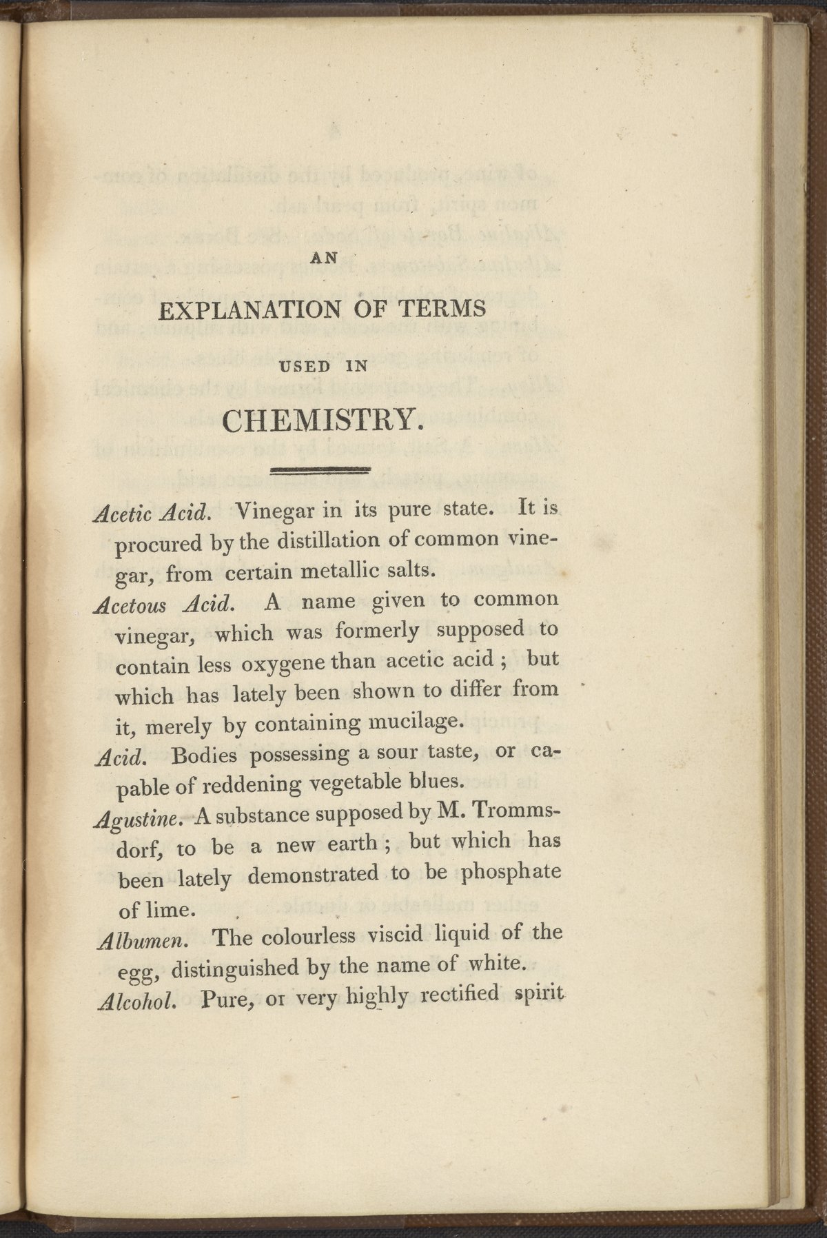 Small JPG1200 x 1918px — 272 KBFull-sized JPG2846 x 4550px — 1.5 MBOriginal fileTIFF — 2846 x 4550px — 37.1 MBJohn Sadler (1779-1838) was a British chemist and metallurgist. Sadler worked as a chemical assistant at the Royal Institution, London, assisting chemist Humphry Davy (1778-1829) until 1804, when he published An Explanation of Terms Used in Chemistry. The publication, written in dictionary format, contains 178 entries of chemical terminology beginning with Acetic Acid and ending with Zoonic Acid. This item is bound with the work Outlines of a Course of Lectures on Chemical Philosophy by Humphry Davy, also published in 1804. The booklet was designed to be issued with Davy’s Course of Lectures, but it was also sold separately as an independent work. It is digitized in its entirety.