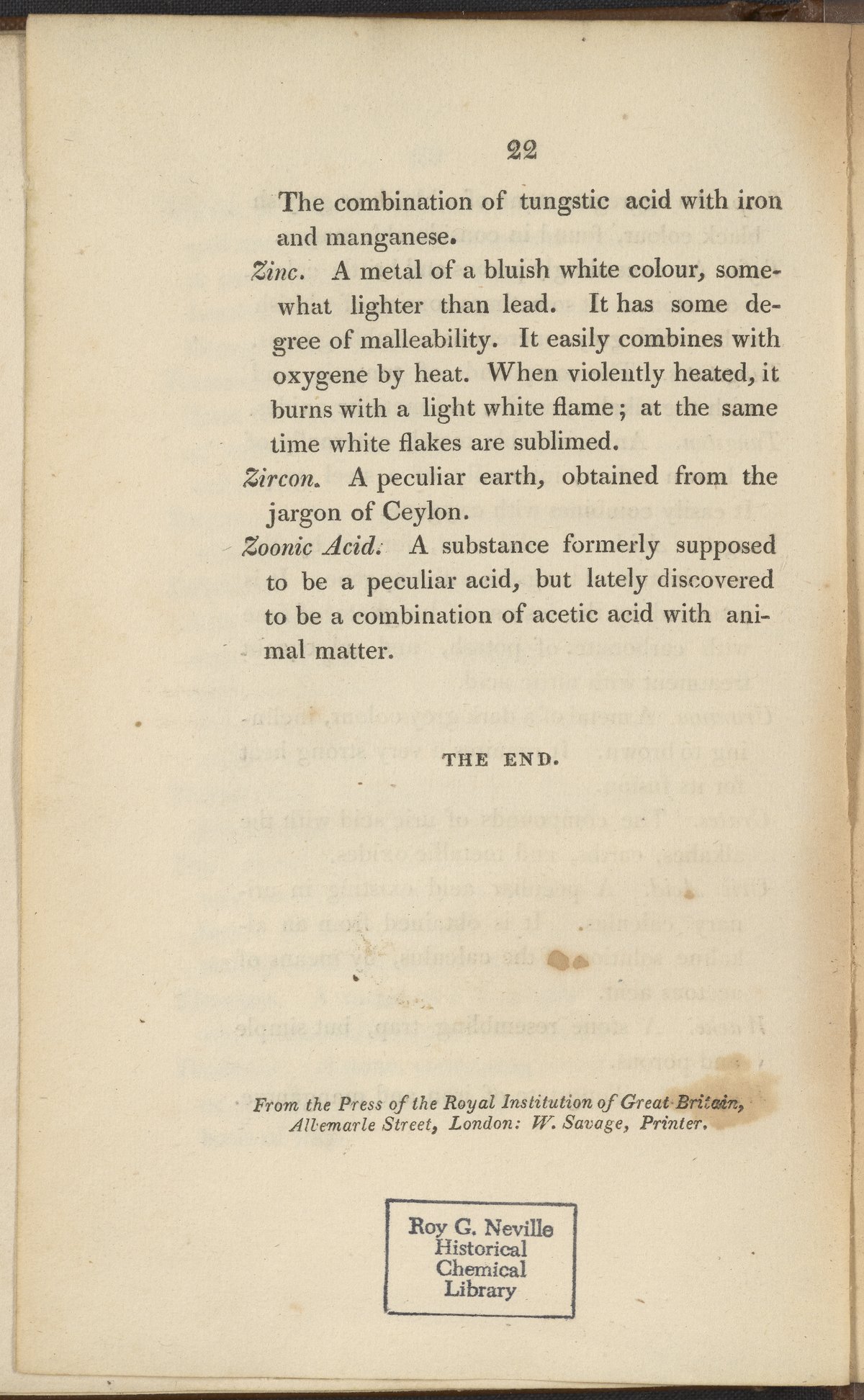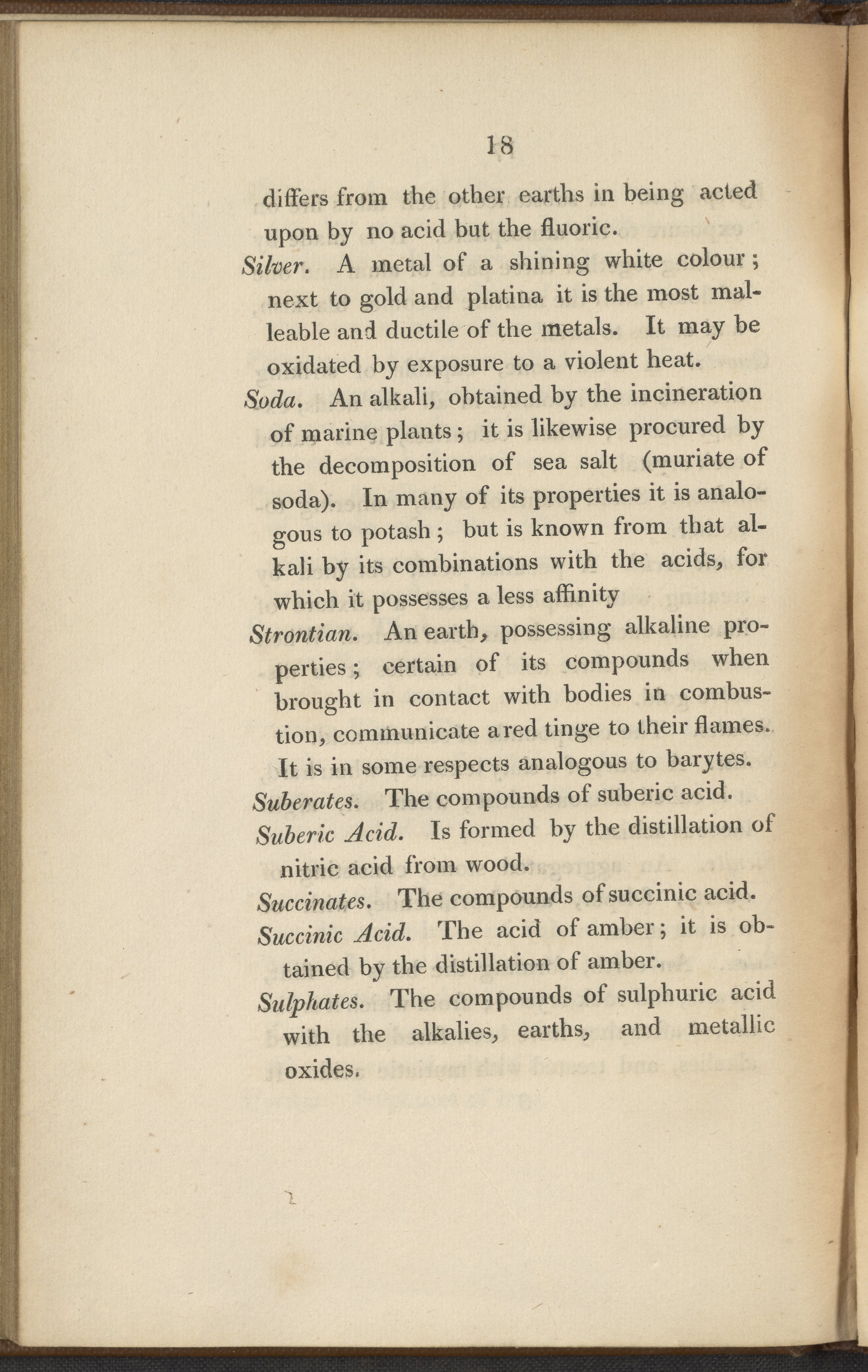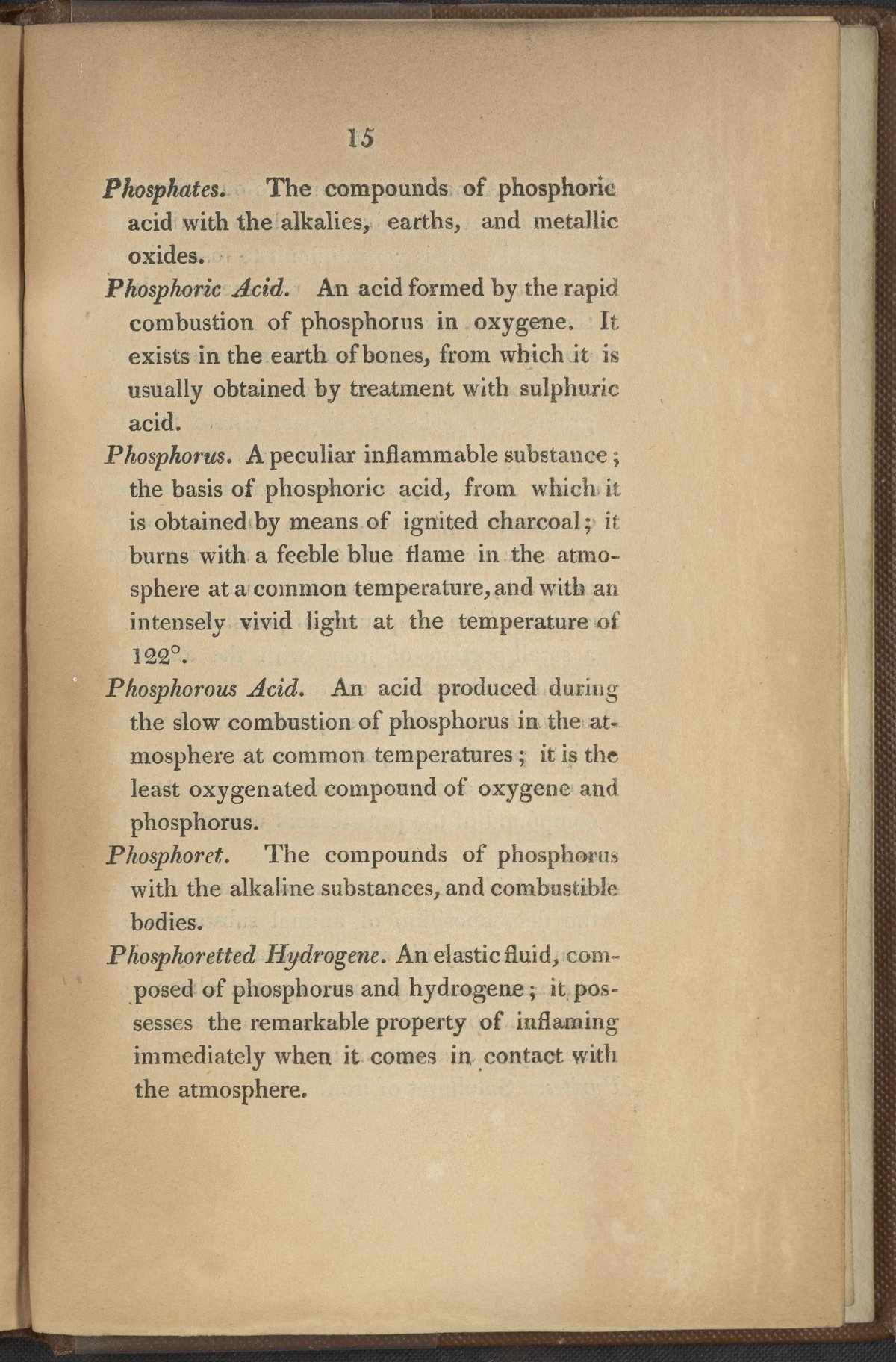 Small JPG1200 x 1918px — 272 KBFull-sized JPG2846 x 4550px — 1.5 MBOriginal fileTIFF — 2846 x 4550px — 37.1 MBJohn Sadler (1779-1838) was a British chemist and metallurgist. Sadler worked as a chemical assistant at the Royal Institution, London, assisting chemist Humphry Davy (1778-1829) until 1804, when he published An Explanation of Terms Used in Chemistry. The publication, written in dictionary format, contains 178 entries of chemical terminology beginning with Acetic Acid and ending with Zoonic Acid. This item is bound with the work Outlines of a Course of Lectures on Chemical Philosophy by Humphry Davy, also published in 1804. The booklet was designed to be issued with Davy’s Course of Lectures, but it was also sold separately as an independent work. It is digitized in its entirety.