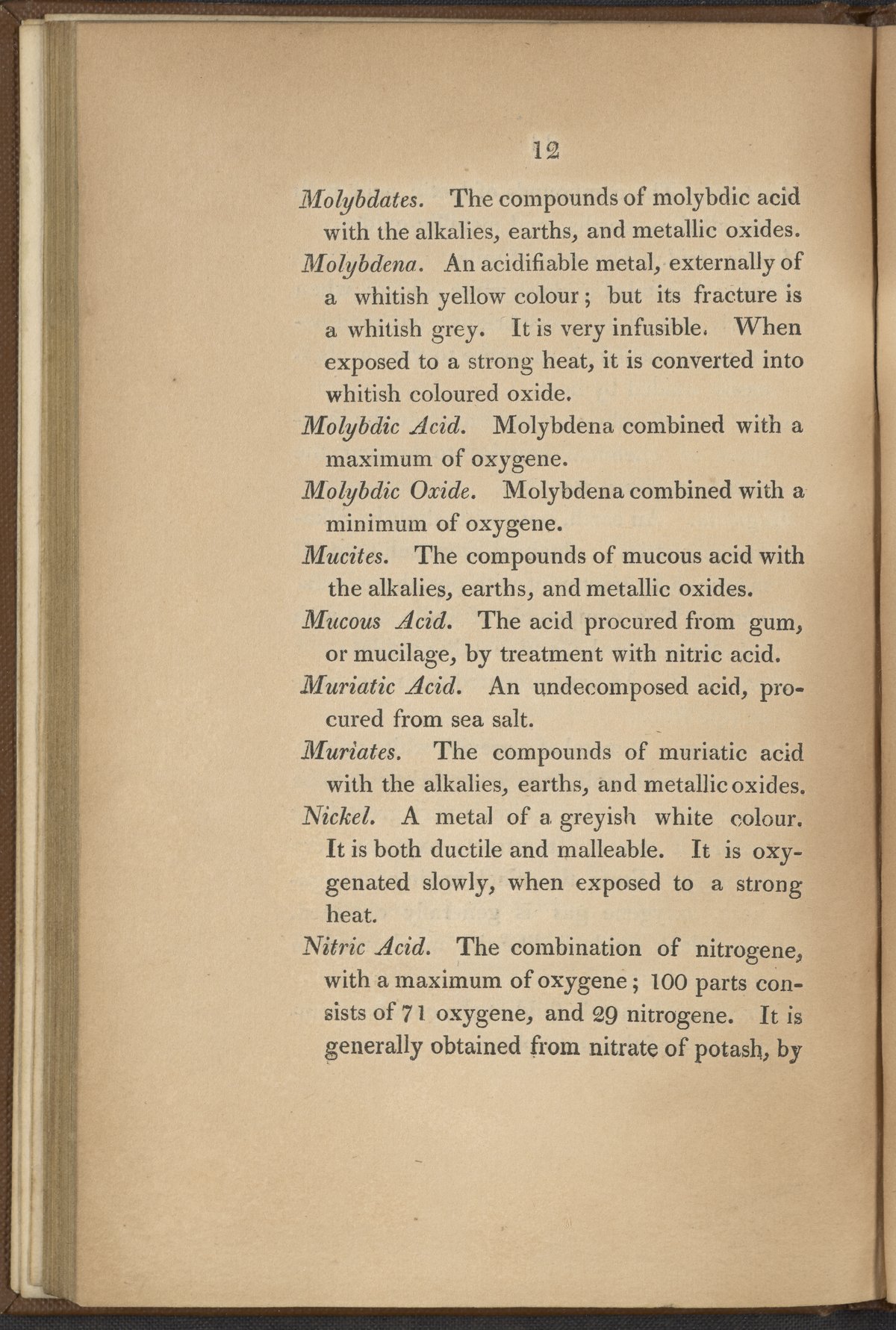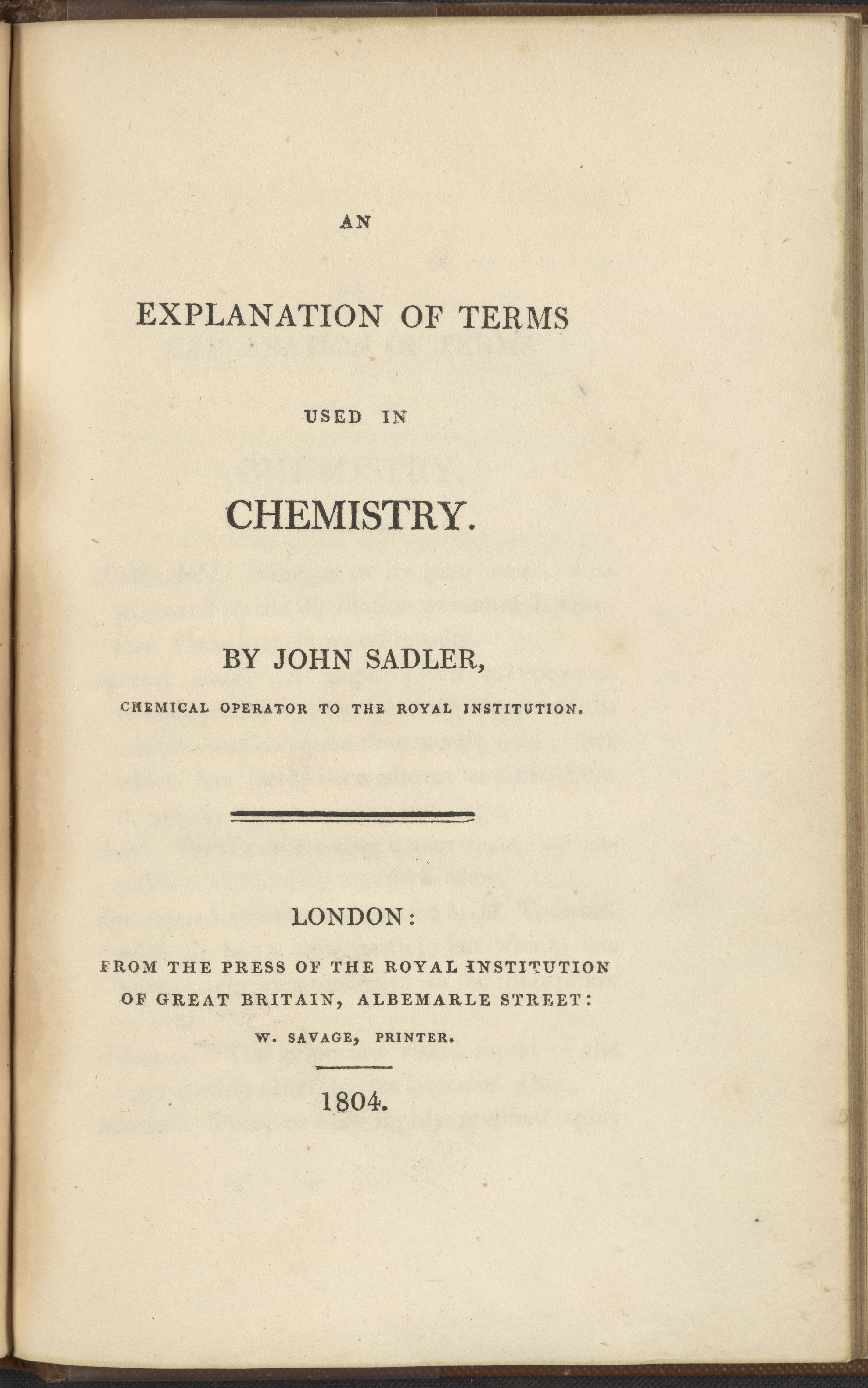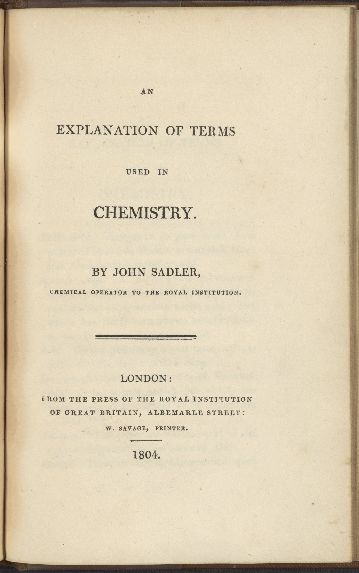 Sadler, John. An Explanation of Terms Used in Chemistry. Royal Institution of Great Britain: Press of the Royal Institution of Great Britain, 1804. https://digital.sciencehistory.org/works/tkowcv7.