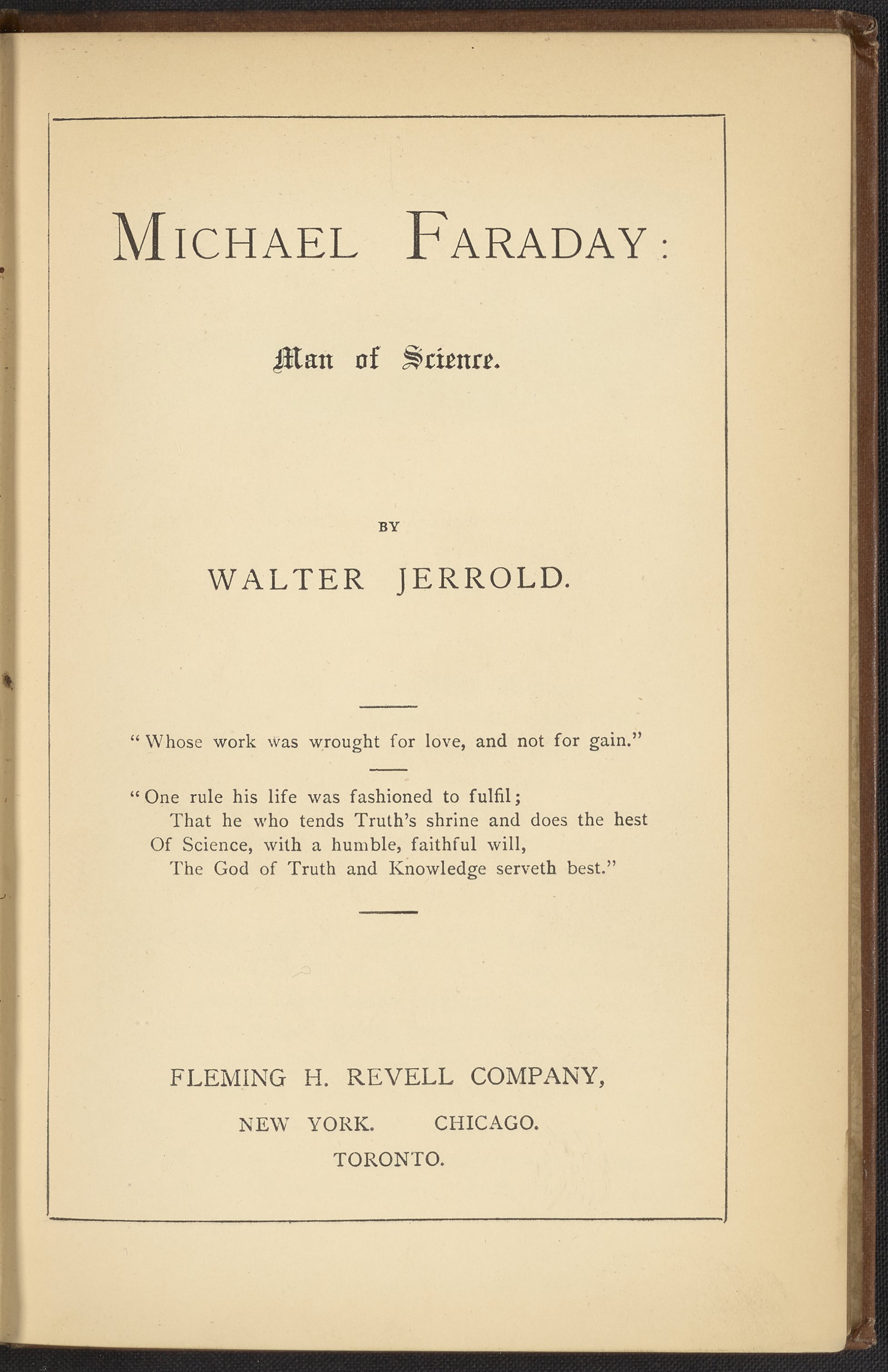 Jerrold, Walter. “Michael Faraday : Man of Science.” New York, New York: Fleming H. Revell, n.d. QC16.F2 J47. Science History Institute. Philadelphia. https://digital.sciencehistory.org/works/tl15hjj.