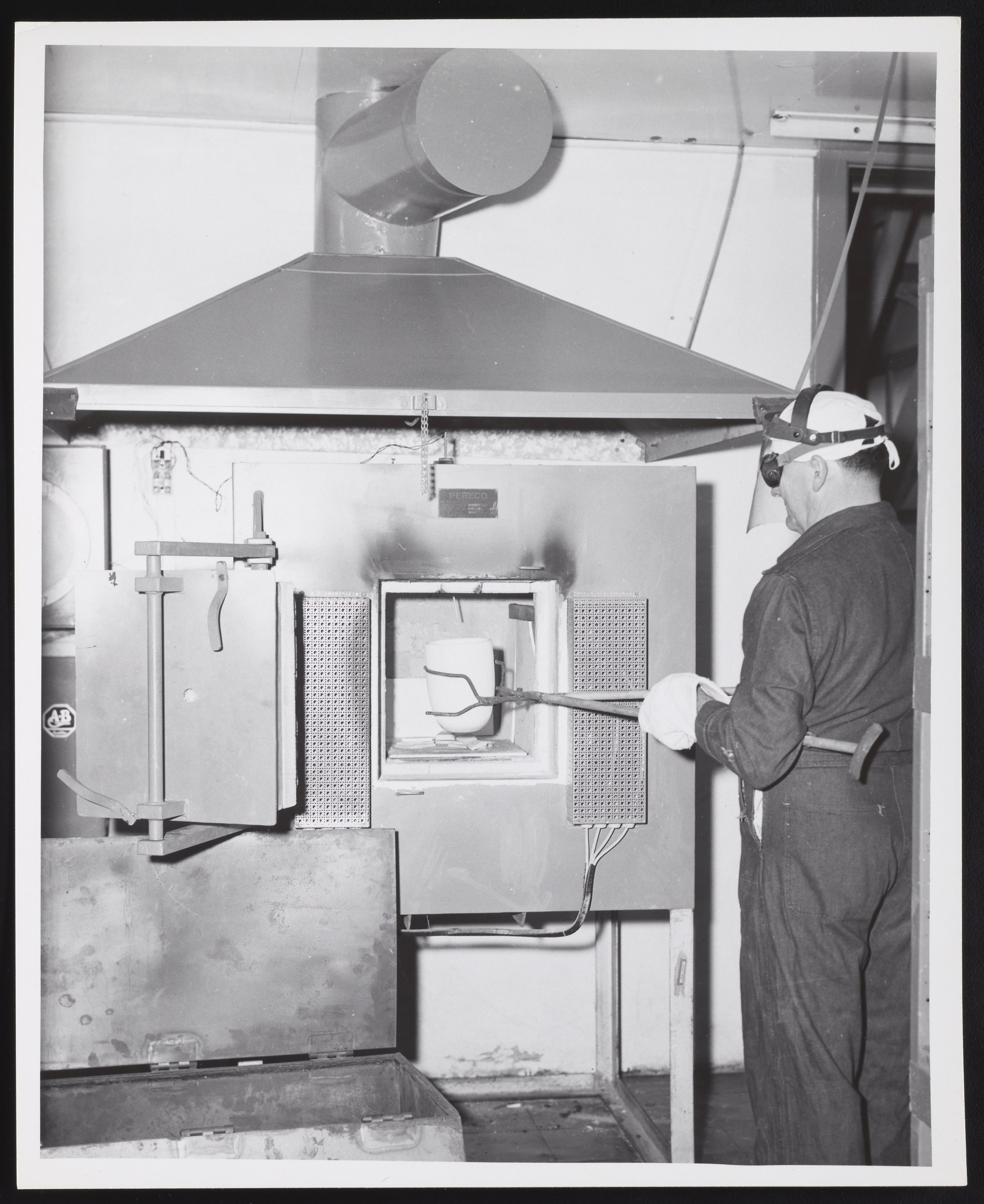 View of chemist George Wieczorek removing a vessel from a Pereco kiln at an unidentified U.S. Department of Agriculture facility.