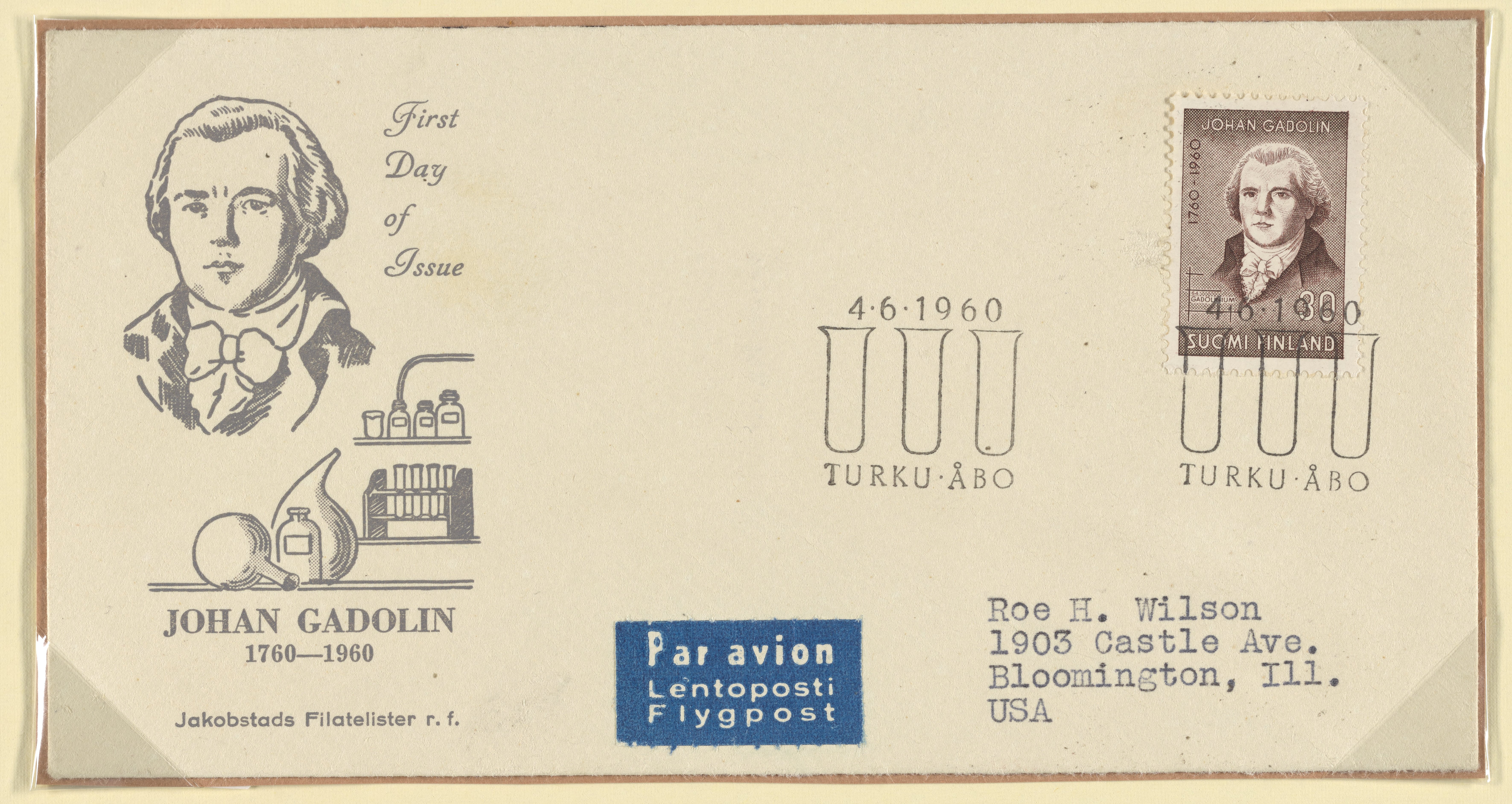 “First Day Cover Commemorating the 200th Birthday of Johan Gadolin.” Finland, June 4, 1960. Witco Stamp Collection, Box 1. Science History Institute. Philadelphia. https://digital.sciencehistory.org/works/tm70mv24n.