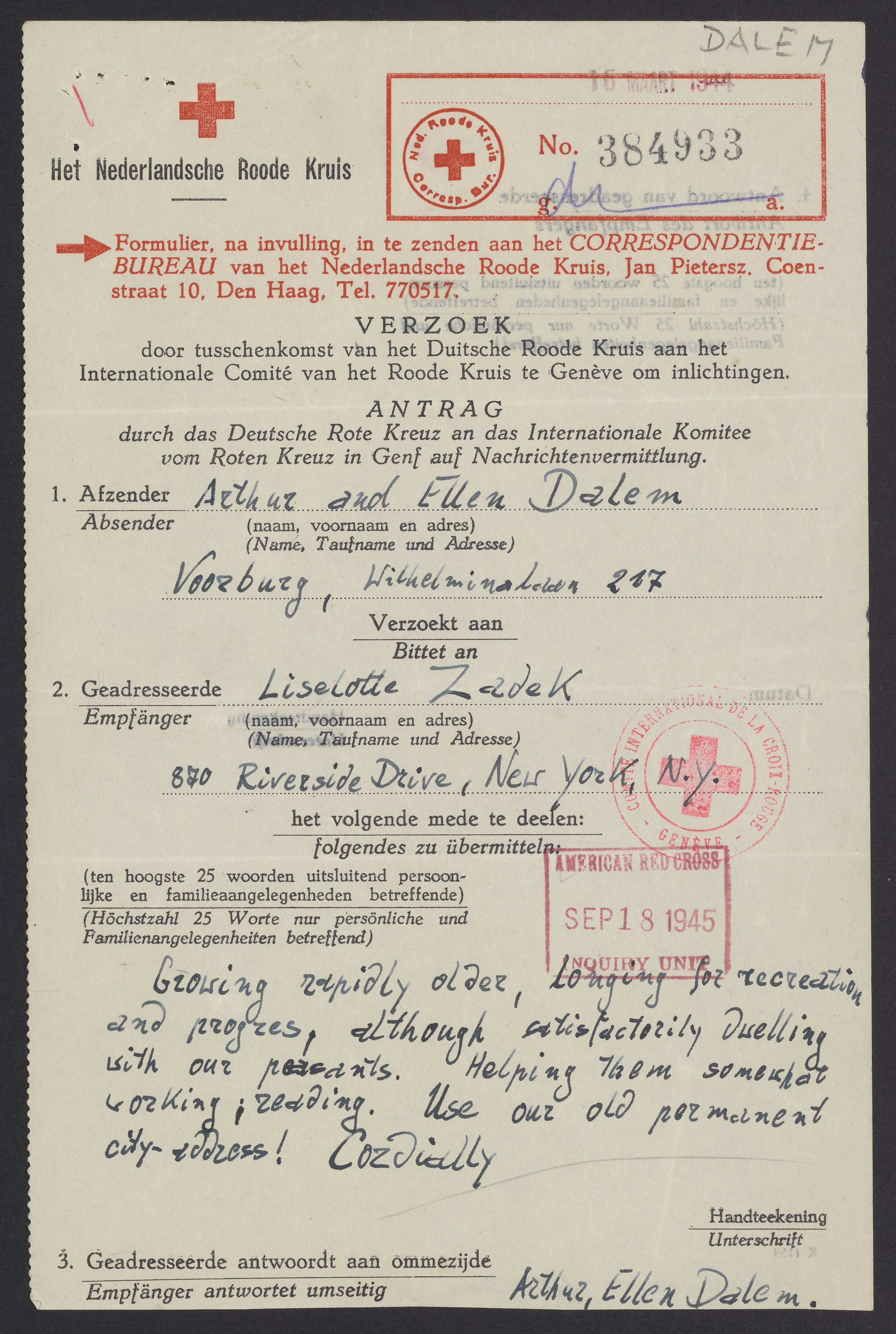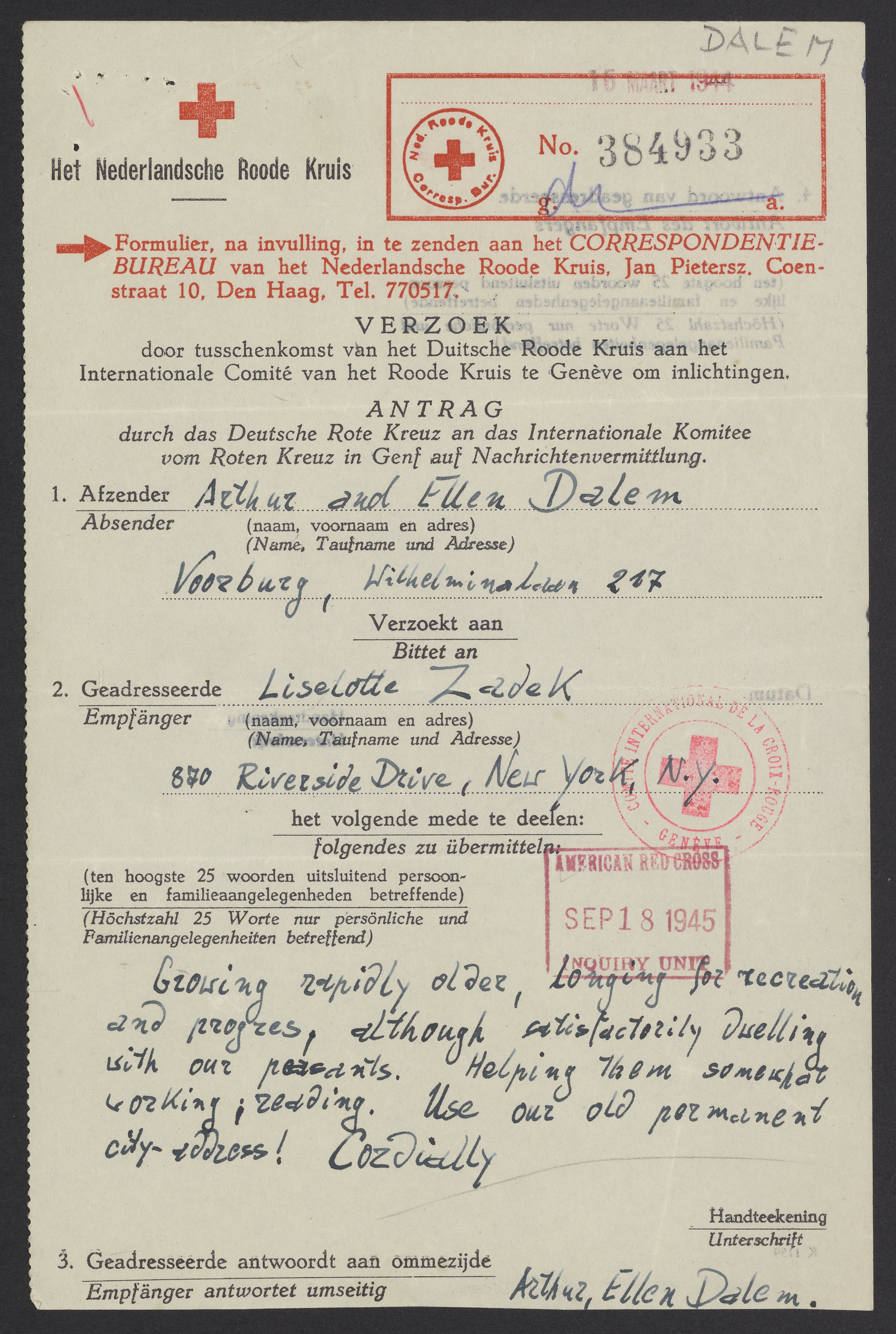 Message from Arthur and Ellen Escaper (Alfred and Eva Schnell) to Mrs. Liselotte Zadek, January 29, 19441944-Jan-29 (sent), 1945-Sep-18 (received)