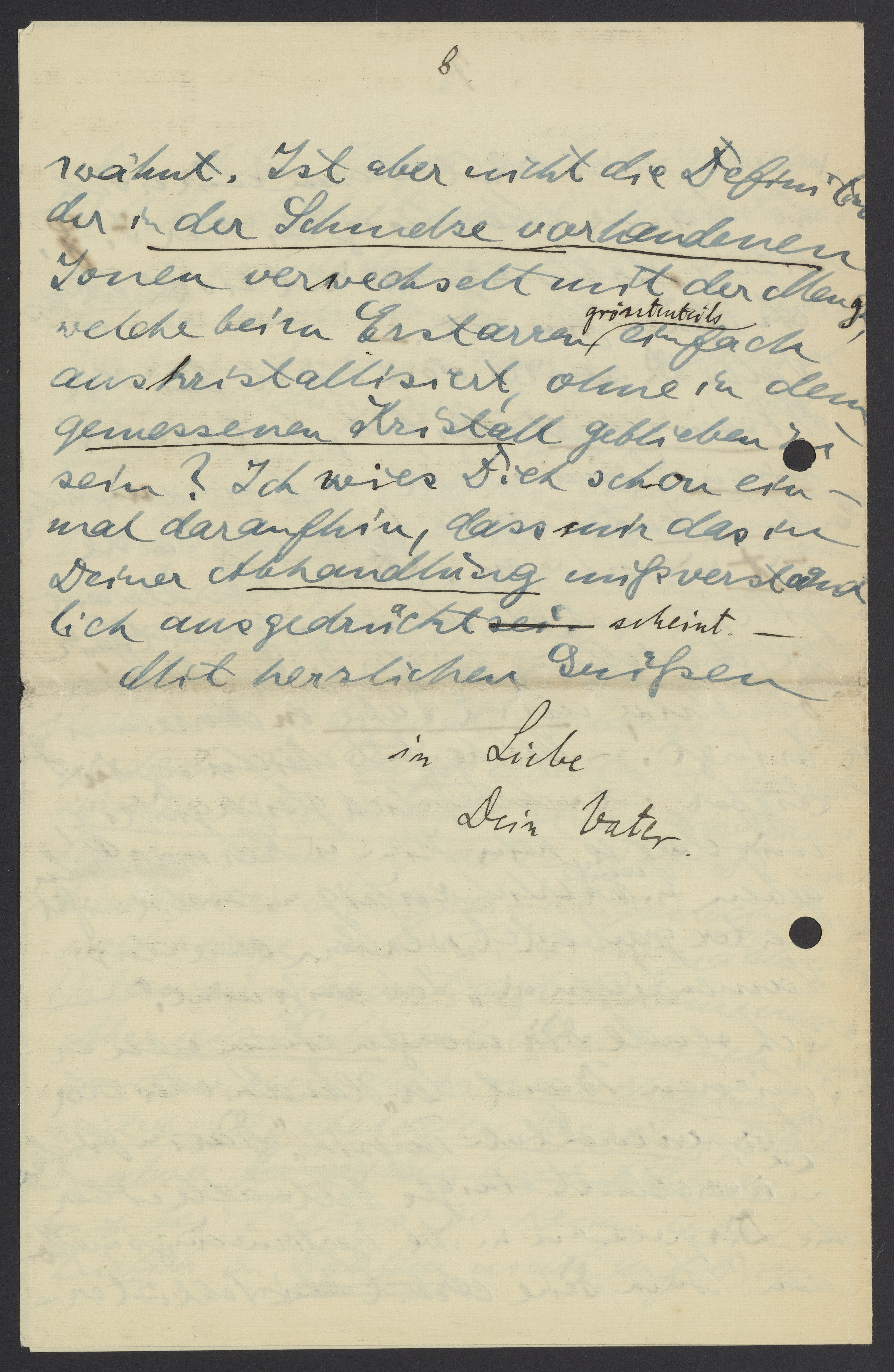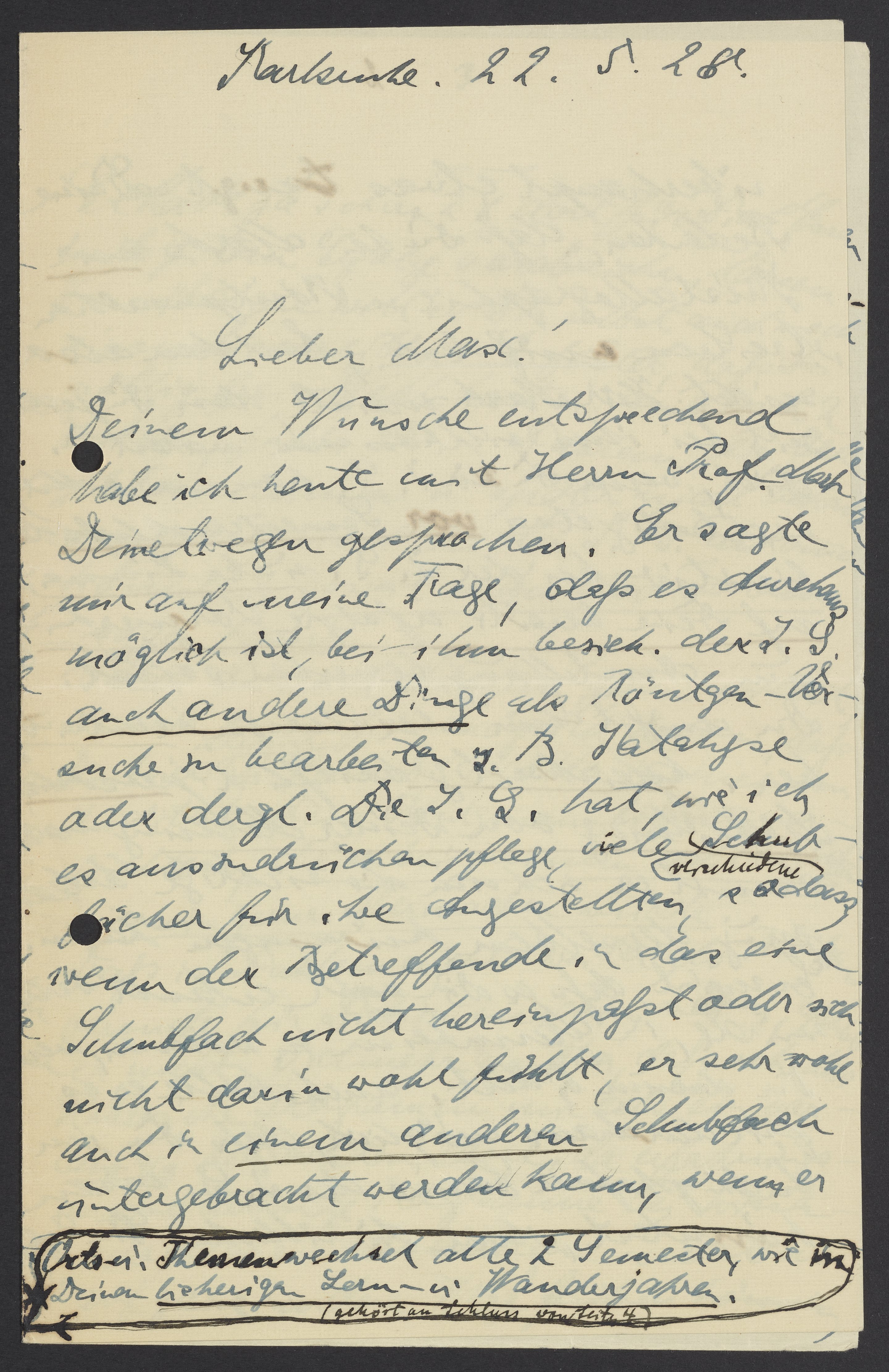 Falls Du nach Dahlem gehen willst, würde er es für möglich halten, daß Du hier in Karlsruhe bei Herrn Dr. Möller in meinem Institute Deine Röntgenausbildung erhieltest, die er bei seinem achttägigen Hiersein gerne überwachen würde. Daß in Dahlem nichts weiter als Röntgenversuche für Dich zu machen wären, glaubt er nicht. Vielmehr glaubt er, daß sich das Habersche Programm nur als ein vorläufiges betrachten lasse, da erfahrungsmäßig derartige Programme bei wissenschaftlichen Forschungen meistens auf ganz andere Wege führen,