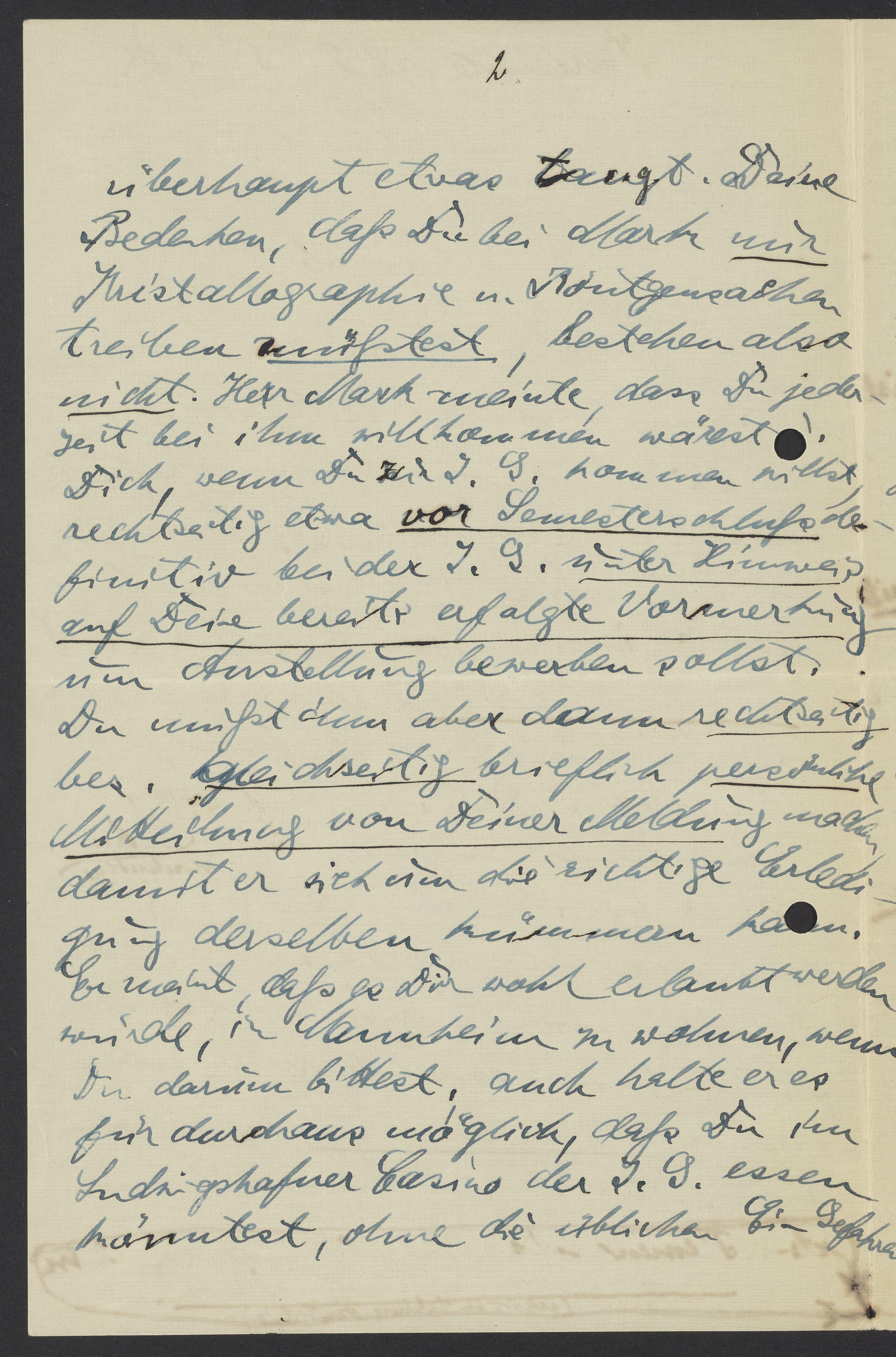 überhaupt etwas taugt. Deine Bedenken, daß du bei Mark nur Kristallographie und Röntgensachen treiben müßtest, bestehen also nicht. Herr Mark meinte, dass Du jederzeit bei ihm willkommen wärest! Dich, wenn Du zur I. G. kommen willst, rechtzeitig etwa vor Semesterschluß definitiv bei der I. G. unter Hinweis auf Deine bereits erfolgte Vormerkung um Anstellung bewerben sollst. Du mußt ihm aber dann rechtzeitig beziehungsweise gleichzeitig brieflich persönliche Mitteilung von Deiner Meldung machen, damit er sich um die richtige Erledigung derselben kümmern kann. Er meint, daß es Dir wohl erlaubt werden würde, in Mannheim zu wohnen, wenn Du darum bittest; auch halte er es für durchaus möglich, daß Du im Ludwigshafner Casino der I. G. essen könntest, ohne die üblichen Ei-Gefahren.