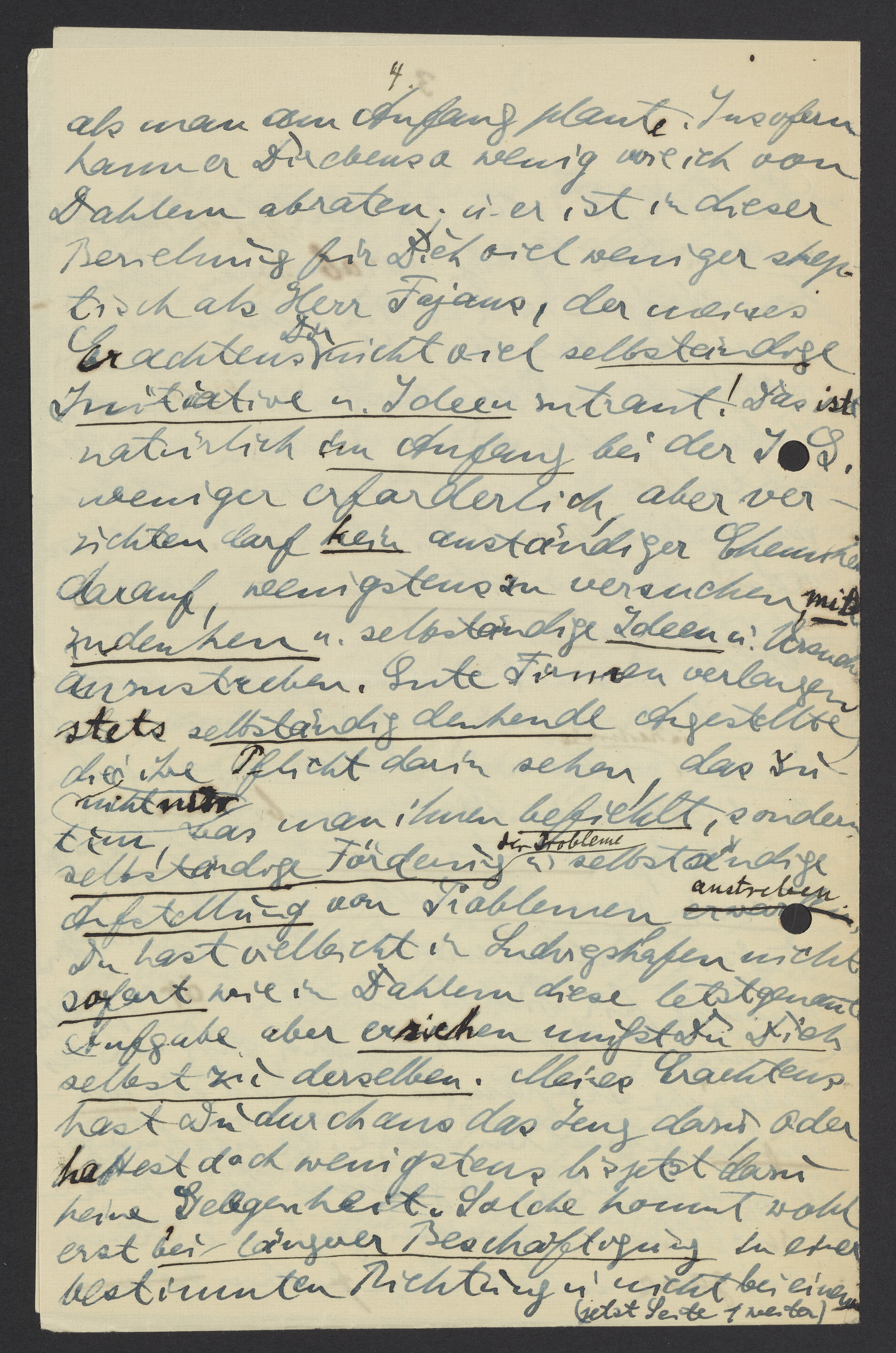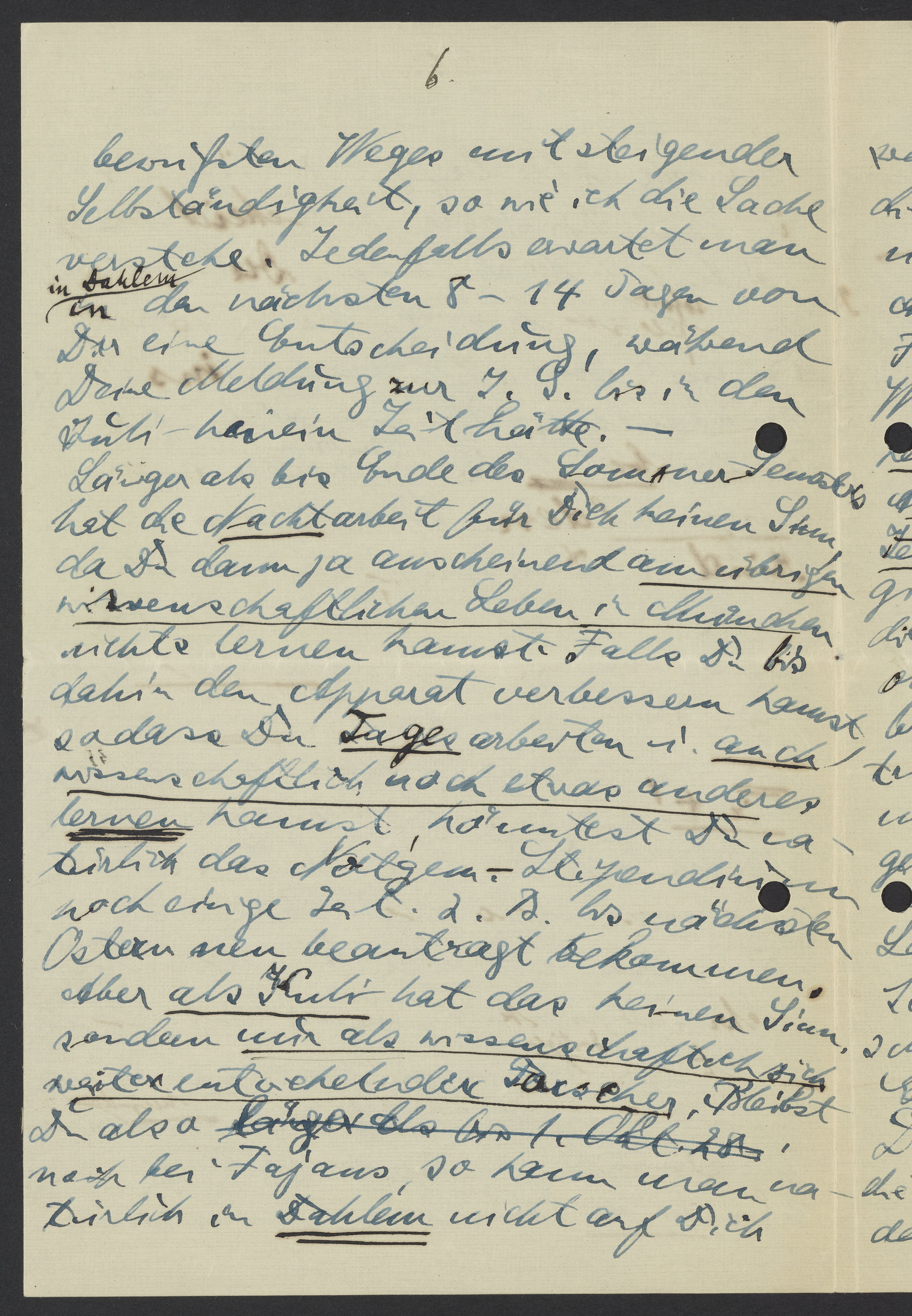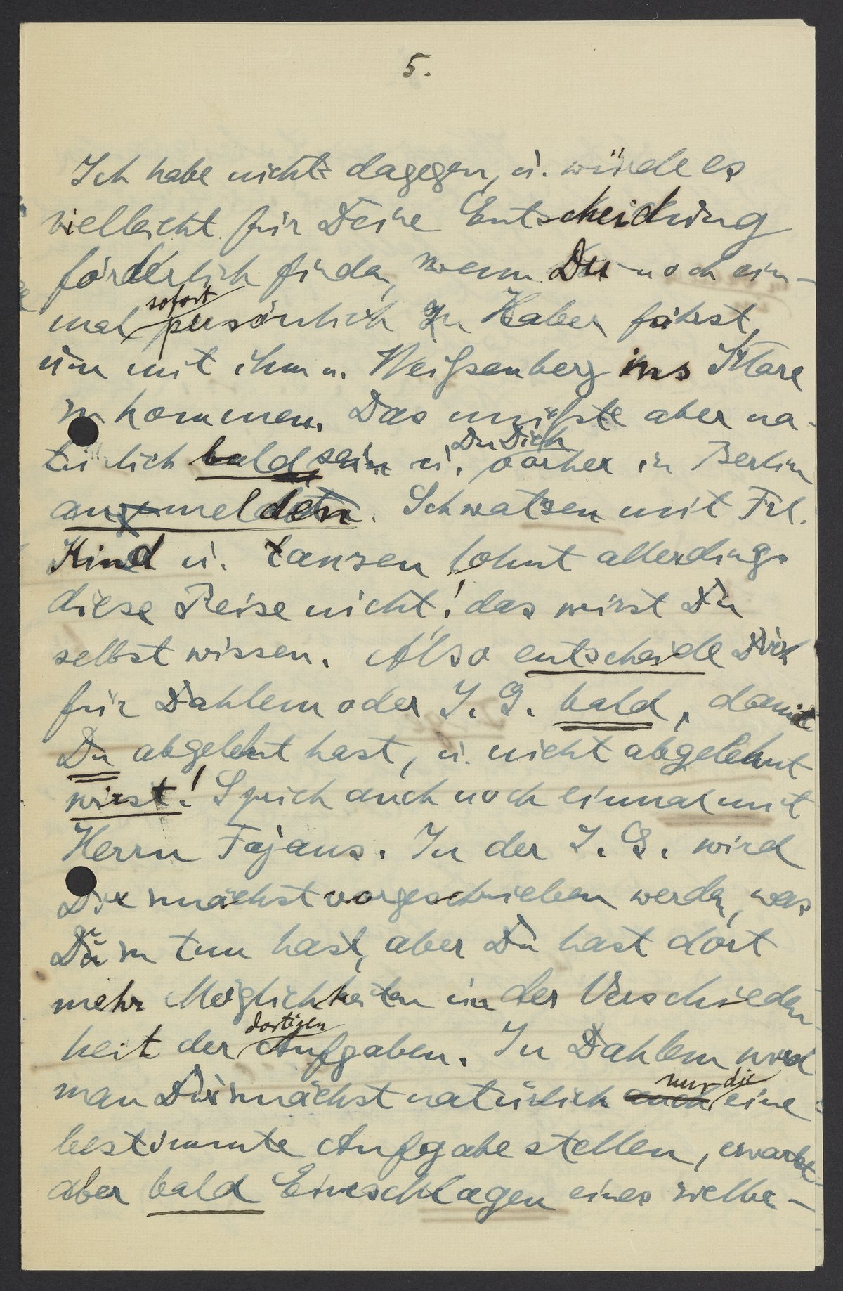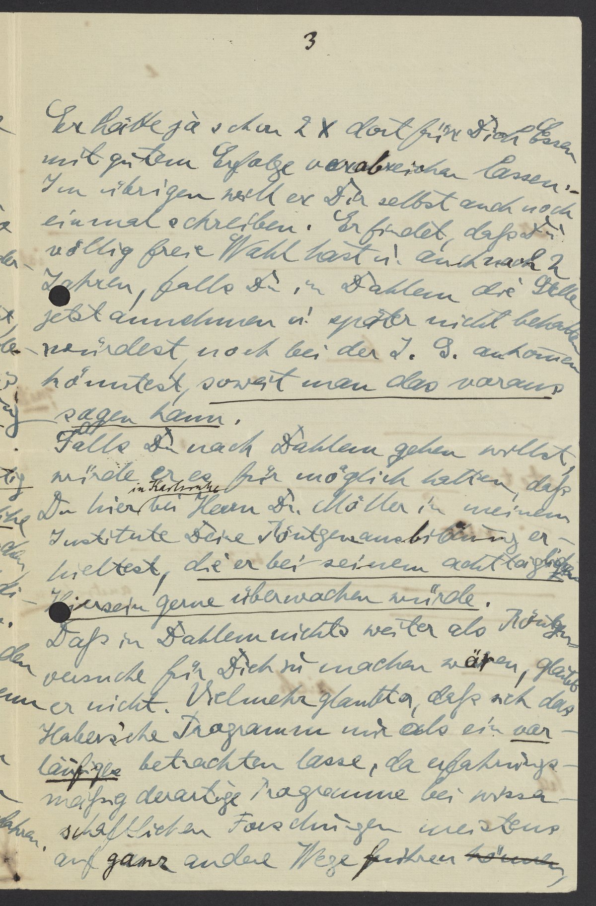 Er hätte ja schon 2 × dort für Dich Essen mit gutem Erfolge verabreichen lassen. Im übrigen will er Dir selbst auch noch einmal schreiben. Er findet, daß Du völlig freie Wahl hast und auch nach 2 Jahren, falls Du in Dahlem die Stelle jetzt annehmen und später nicht behalten würdest, noch bei der I. G. ankommen könntest, soweit man das voraussagen kann.