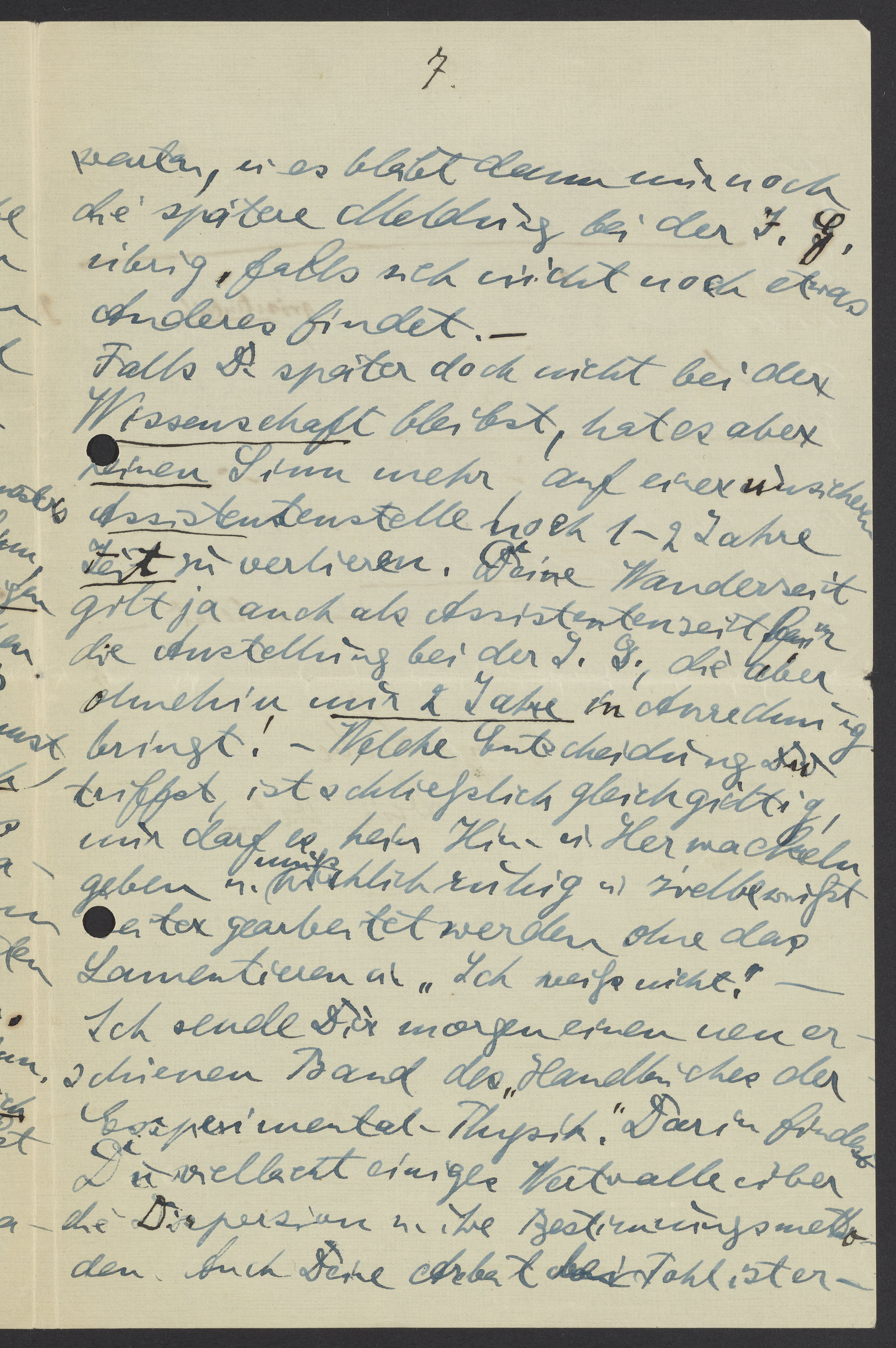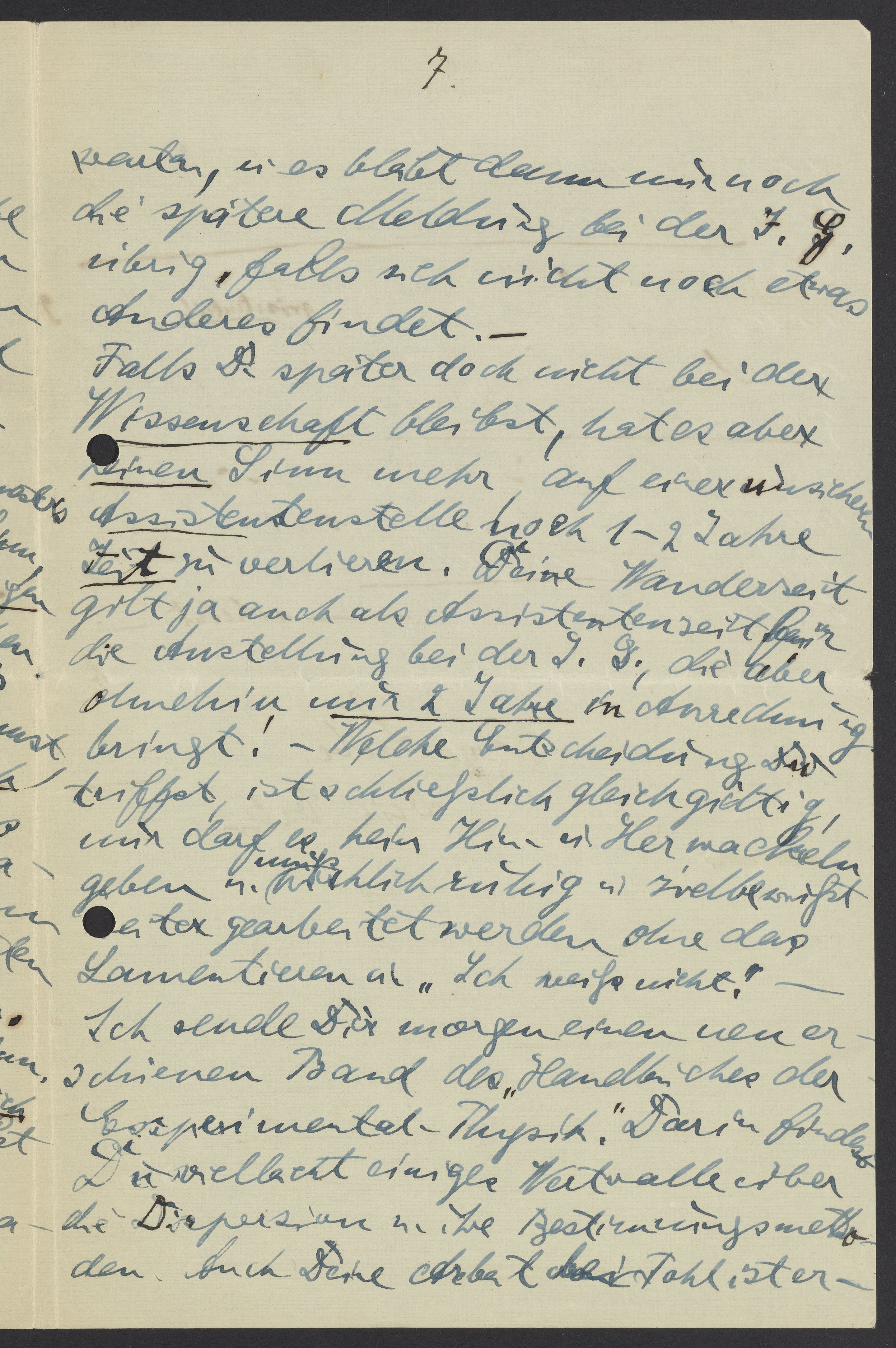 warten, und es bleibt dann nur noch die spätere Meldung bei der I. G. übrig, falls sich nicht noch etwas Anderes findet. – Falls Du später doch nicht bei der Wissenschaft bleibst, hat es aber keinen Sinn mehr, auf einer unsicheren Assistentenstelle noch 1-2 Jahre Zeit zu verlieren. Deine Wanderzeit gilt ja auch als Assistentenzeit für die Anstellung bei der I. G., die aber ohnehin nur 2 Jahre in Anrechnung bringt! – Welche Entscheidung Du triffst, ist schließlich gleichgültig, nur darf es kein Hin- und Herwackeln geben, es muß wirklich ruhig und zielbewußt weiter gearbeitet werden, ohne das Lamentieren und „Ich weiß nicht.“ –