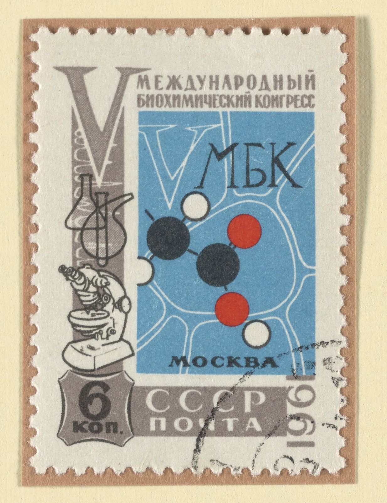 “Soviet Postage Stamp Commemorating the 5th International Biochemical Congress, Moscow.” Soviet Union, 1961. Witco Stamp Collection, Box 1. Science History Institute. Philadelphia. https://digital.sciencehistory.org/works/tq57nr23w.