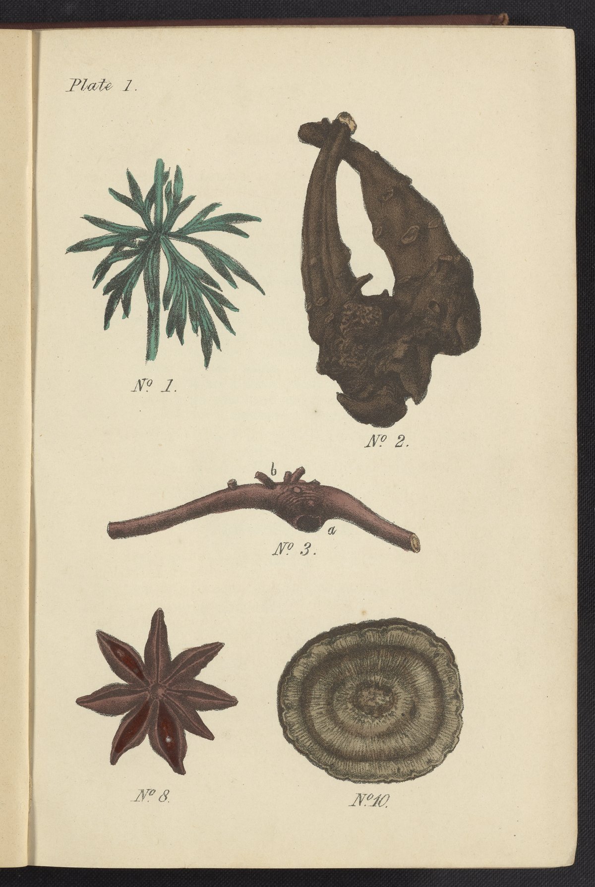 Wills, George S. V. “Illustration of Aconite Leaves and Root, American May Apple, Star-Anise Root and Calumba Root.” A Manual of Vegetable Materia Medica. London, England: Marshall Simpkin, 1886. https://digital.sciencehistory.org/works/tt44pn92j.