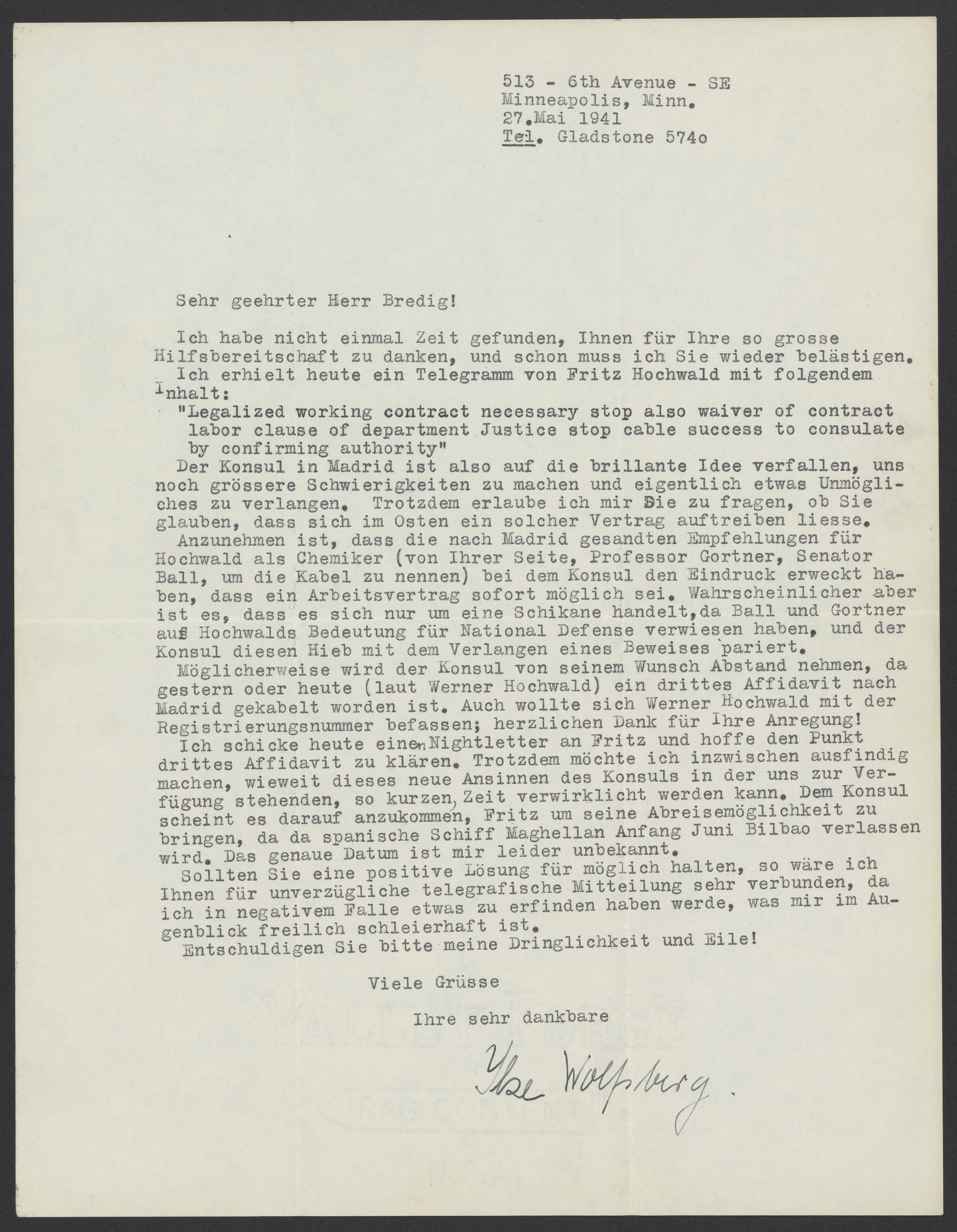 Letter from Ilse Wolfsberg to Max Bredig, May 15, 19411941-May-15 (sent), 1941-May-20 (received)