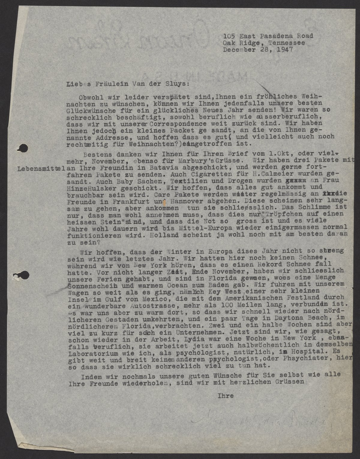 Letter from Max Bredig to Anny van der Sluys, December 28, 1947