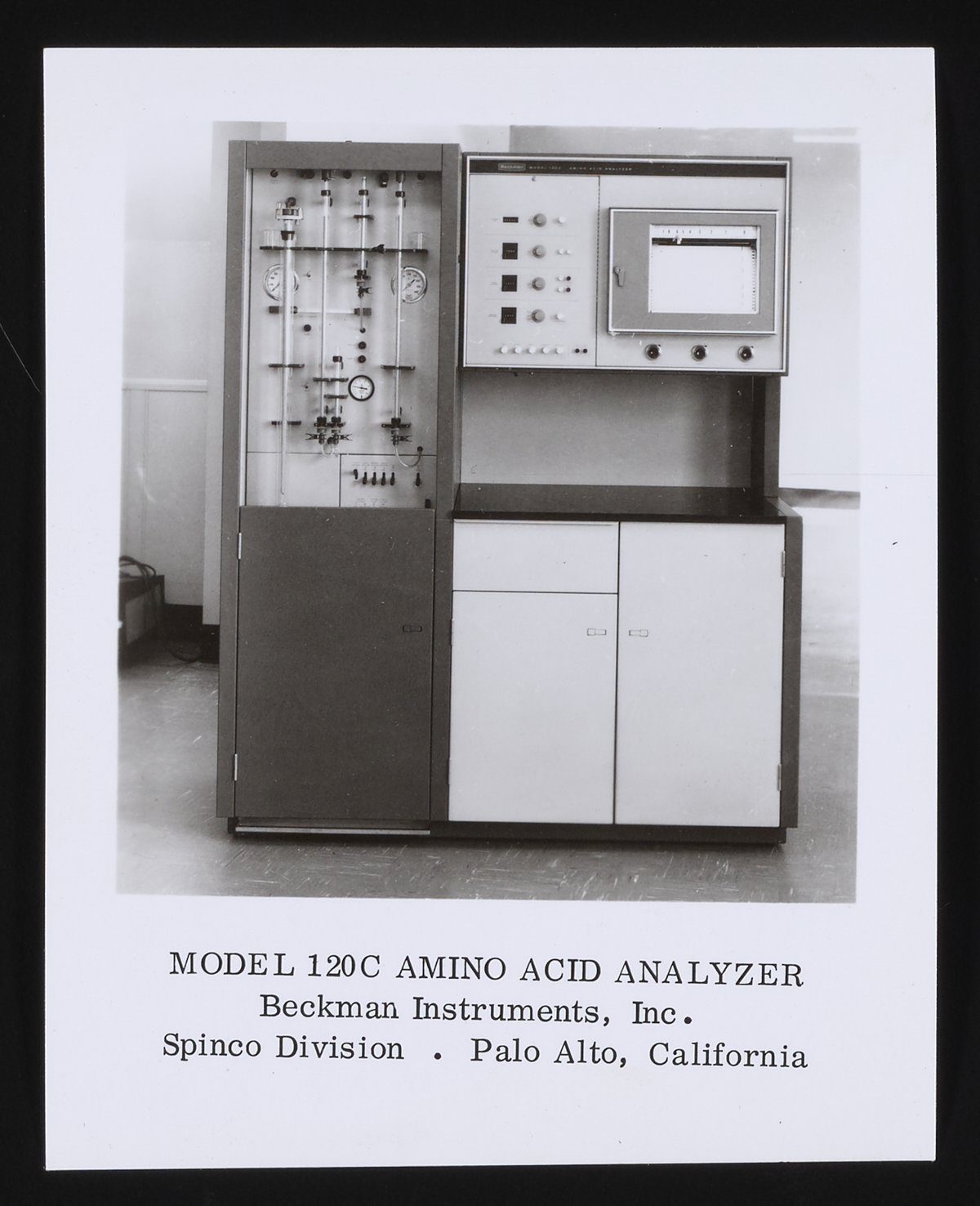 “Beckman Model 120C Amino Acid Analyzer,” 1960–1969. Beckman Historical Collection, Box 78. Science History Institute. Philadelphia. https://digital.sciencehistory.org/works/tx31qh766.