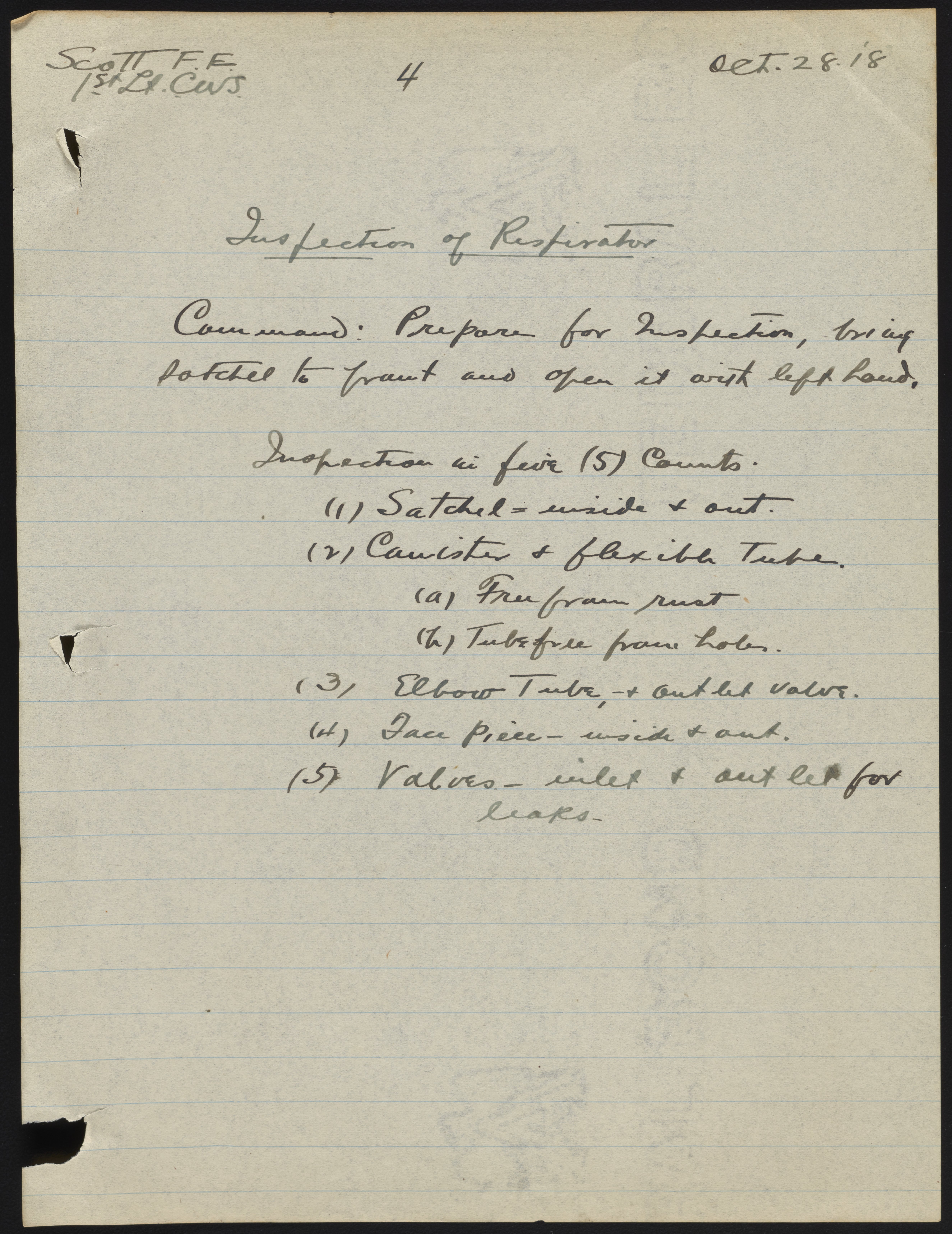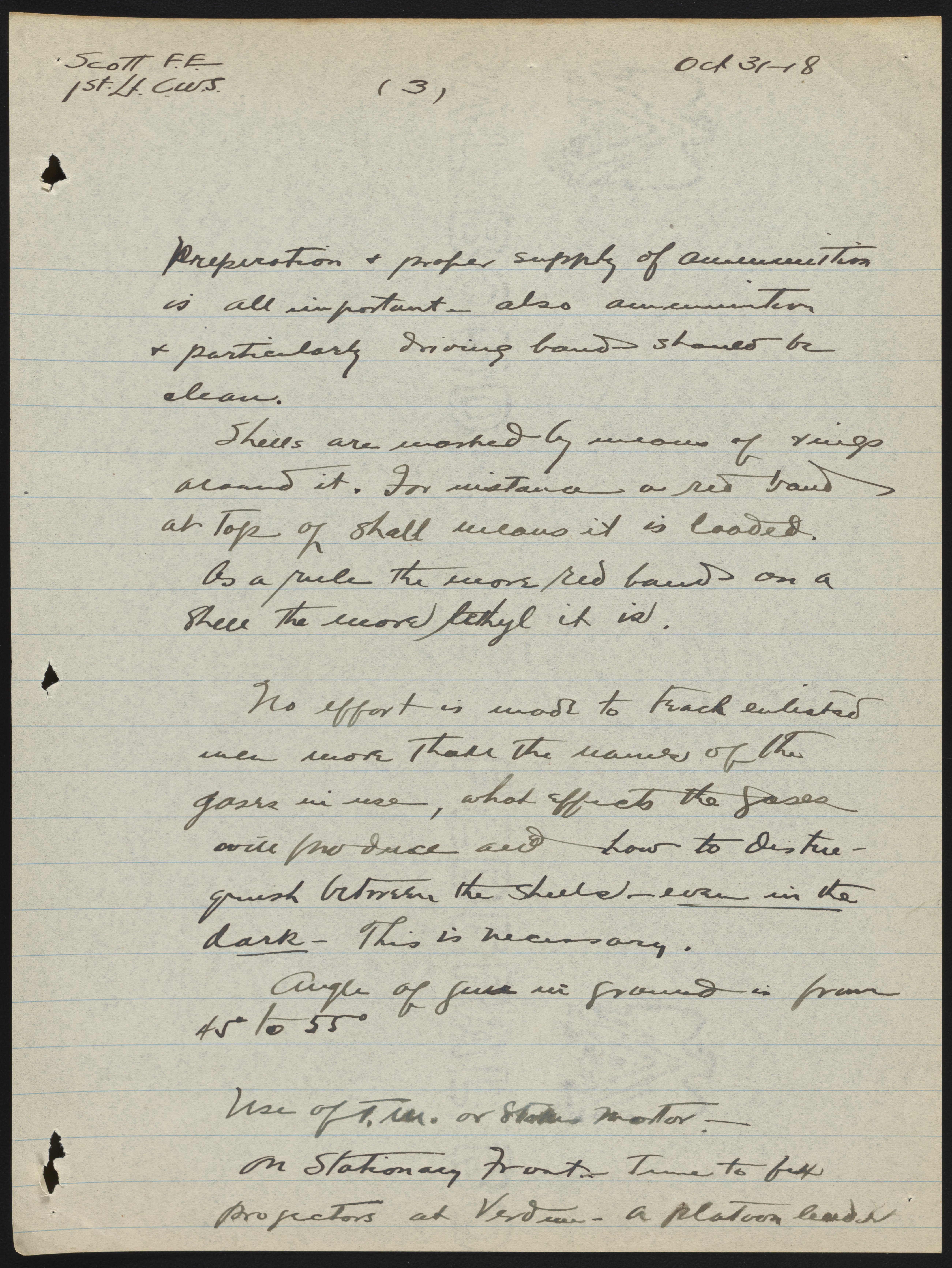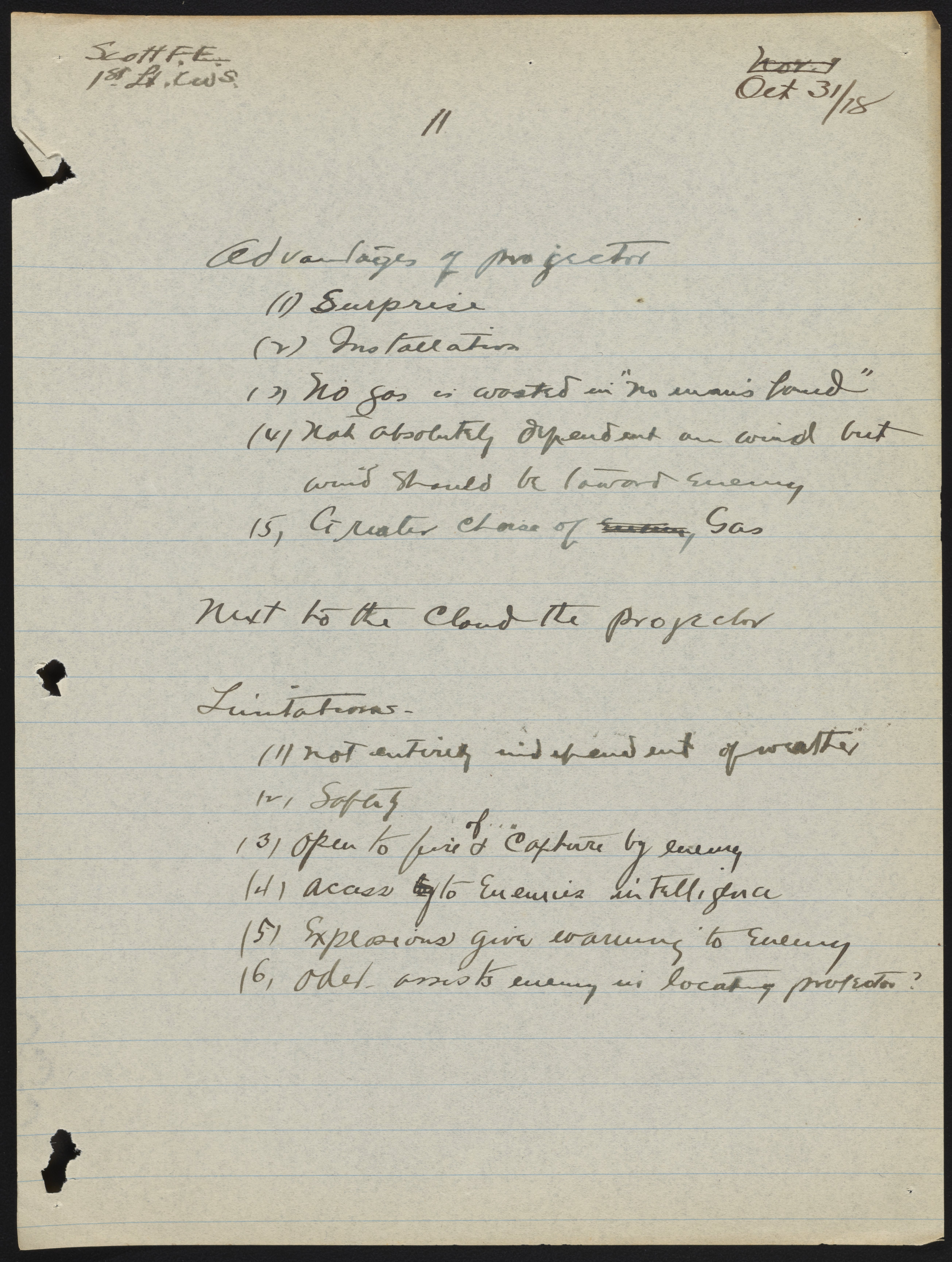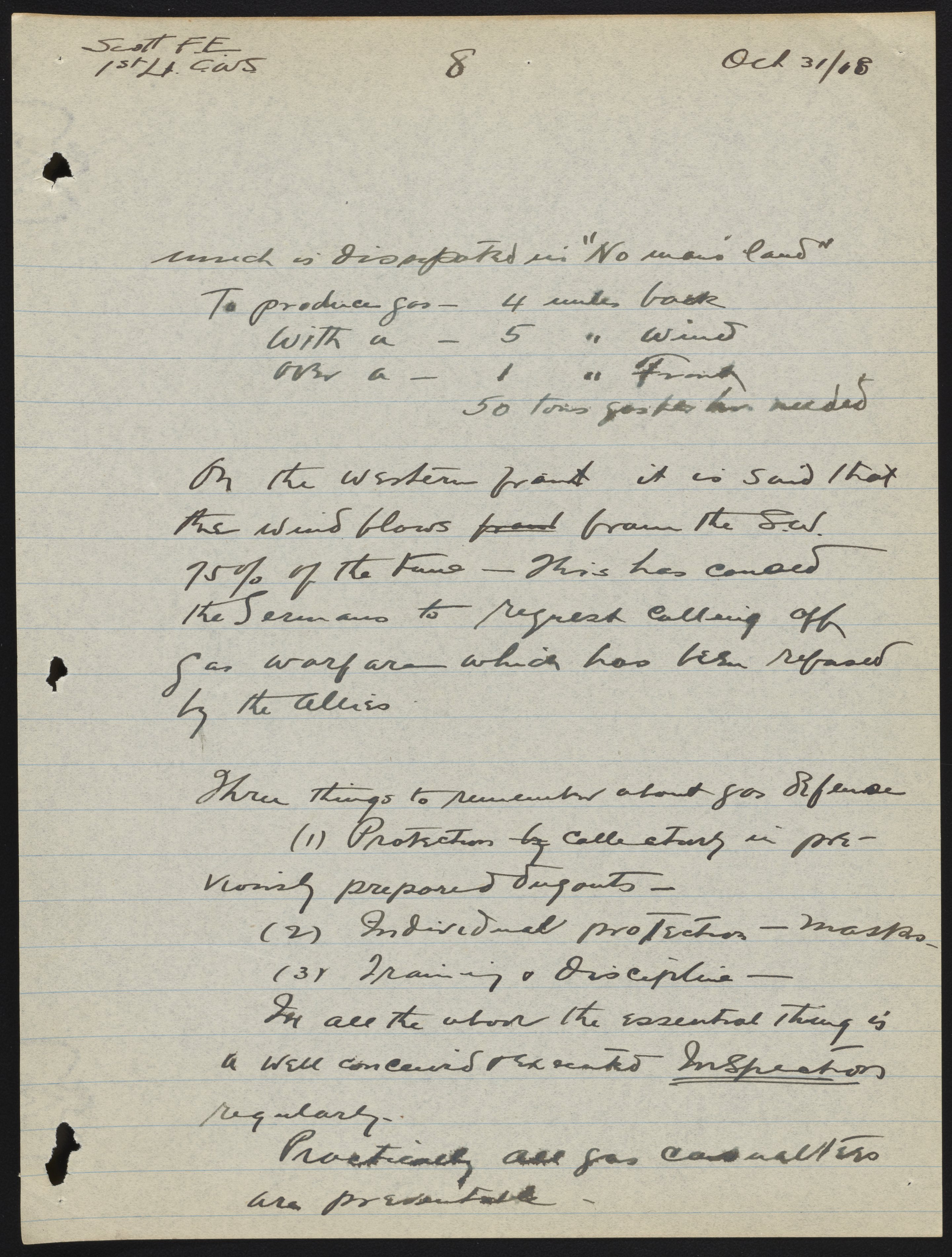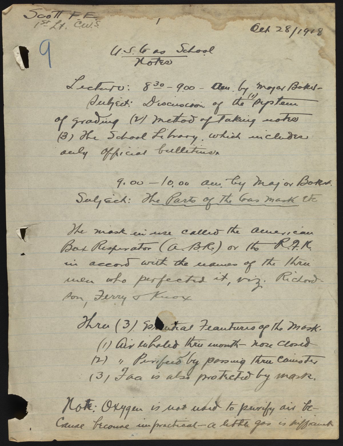 Small JPG1200 x 1562px — 345 KBLarge JPG2880 x 3748px — 1.7 MBFull-sized JPG5302 x 6900px — 4.7 MBOriginal fileTIFF — 5302 x 6900px — 105 MBNotebook consists of handwritten notes taken by Francis E. Scott at the U.S. Army Gas School at Camp Kendrick, New Jersey, on the use of gas in warfare. The notes include teaching aids and a circular letter from Brigadier General Amos A. Fries, Chief of the Chemical Warfare Service, in which he discusses use of gas in trench warfare in France. Scott held the rank of 1st Lieutenant in the Army's Chemical Warfare Service during World War I.