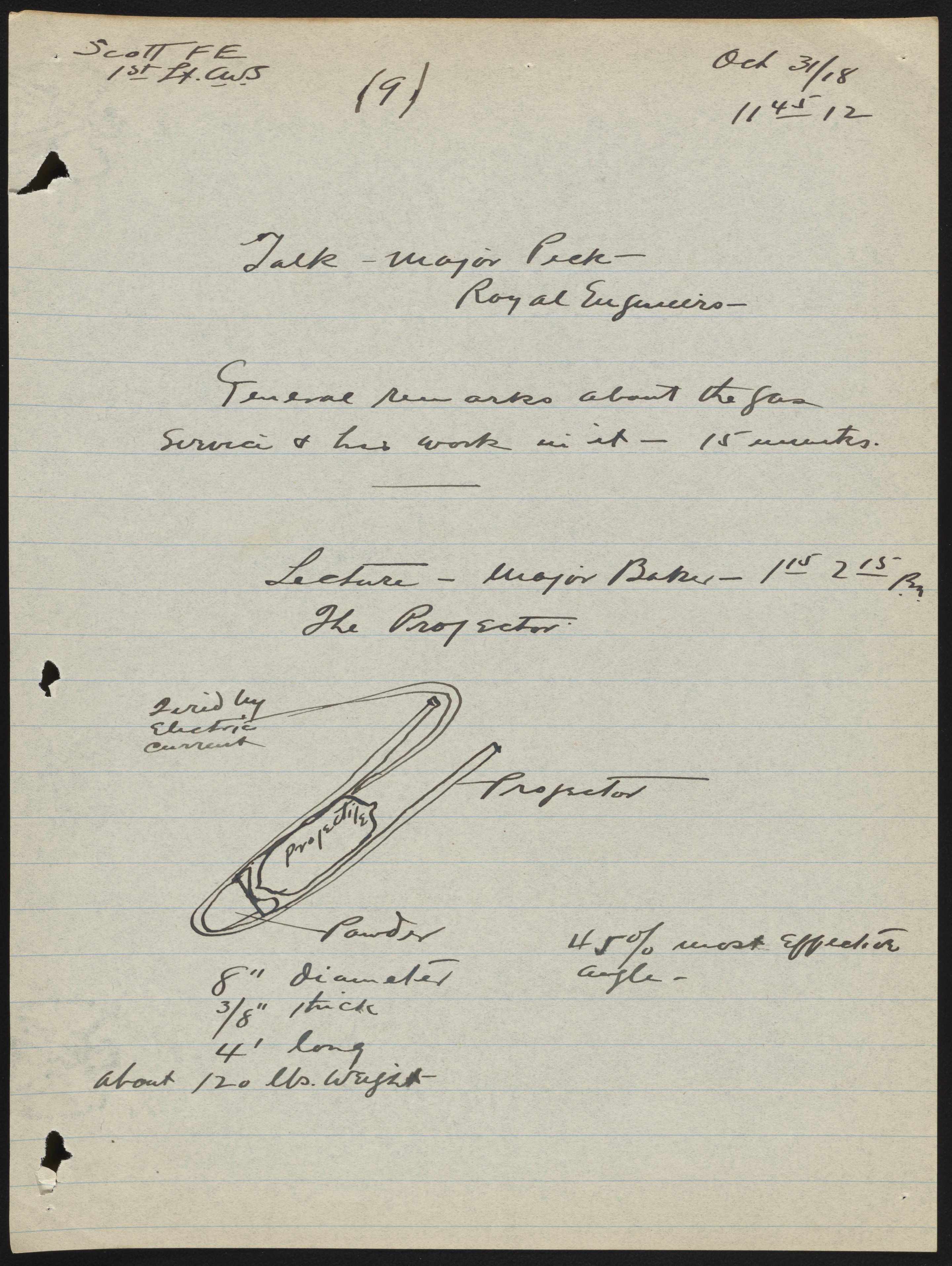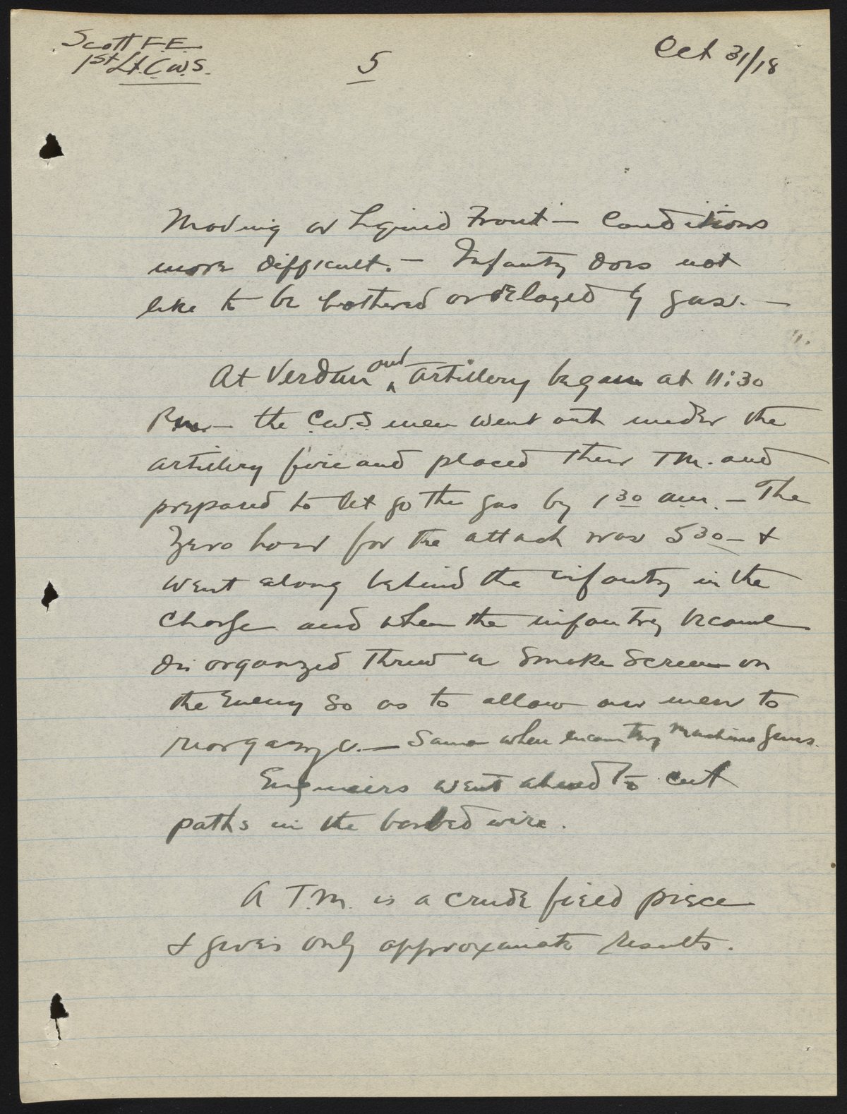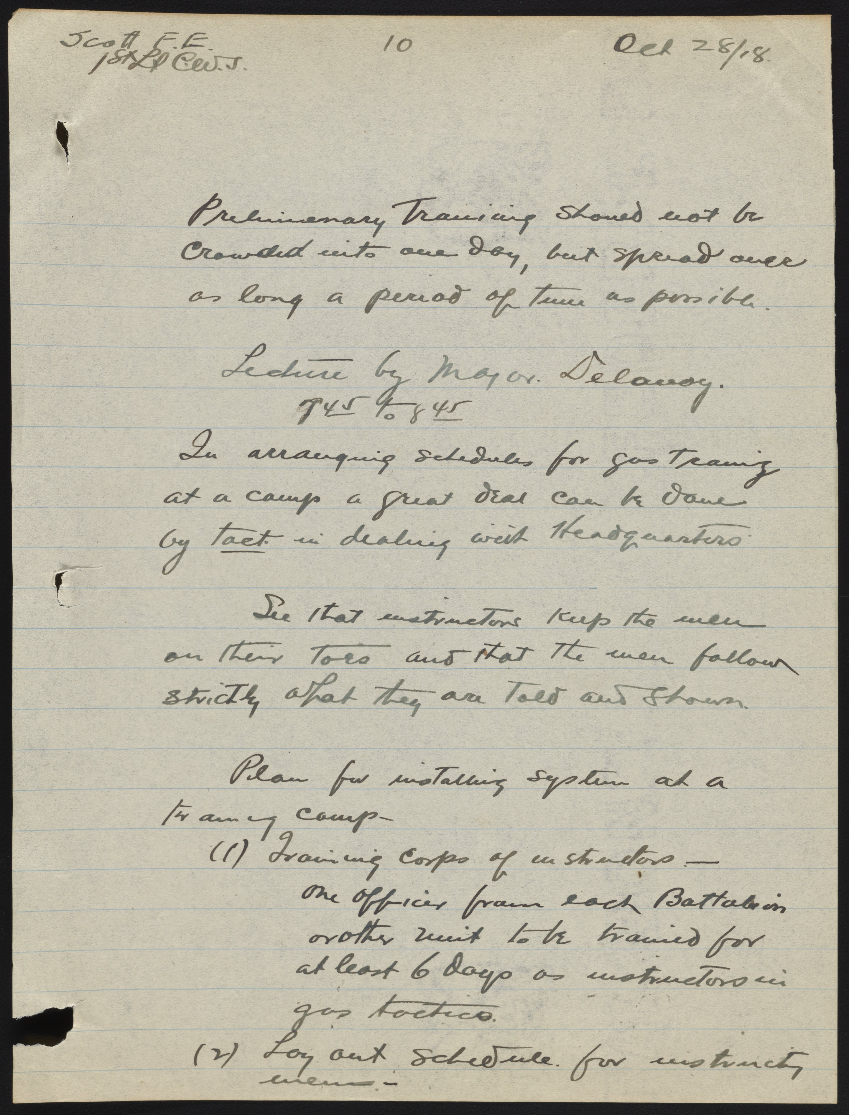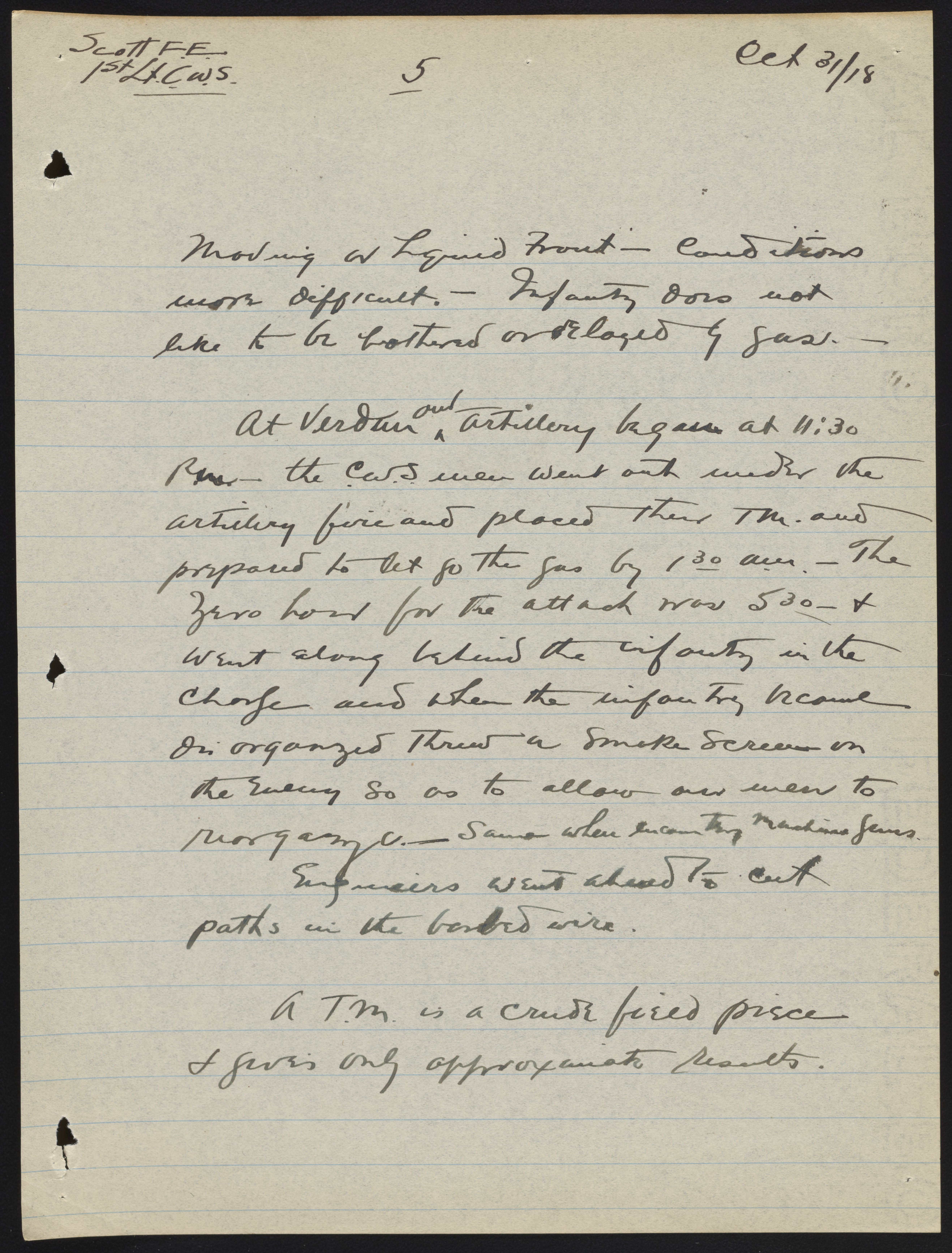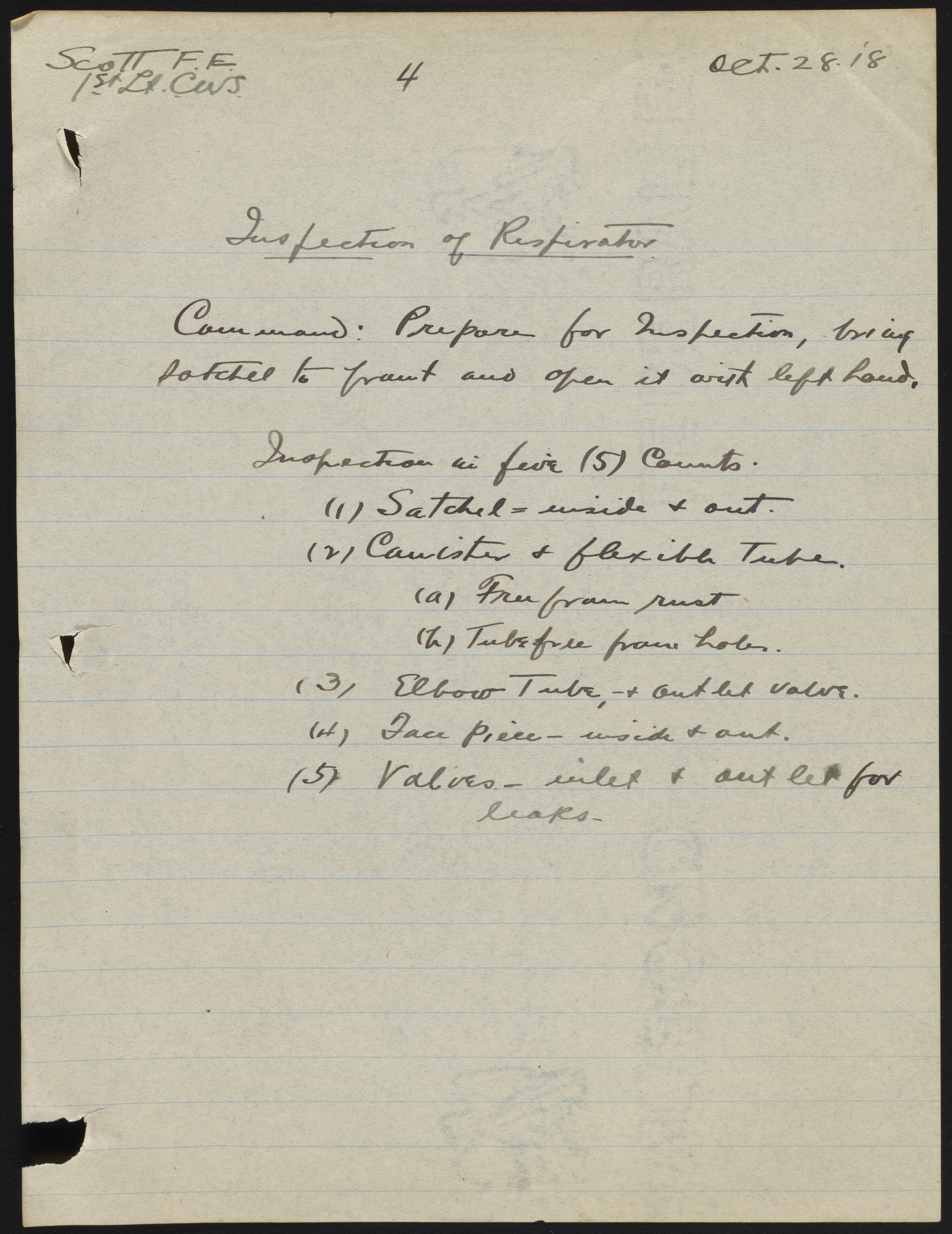 Small JPG1200 x 1562px — 345 KBLarge JPG2880 x 3748px — 1.7 MBFull-sized JPG5302 x 6900px — 4.7 MBOriginal fileTIFF — 5302 x 6900px — 105 MBNotebook consists of handwritten notes taken by Francis E. Scott at the U.S. Army Gas School at Camp Kendrick, New Jersey, on the use of gas in warfare. The notes include teaching aids and a circular letter from Brigadier General Amos A. Fries, Chief of the Chemical Warfare Service, in which he discusses use of gas in trench warfare in France. Scott held the rank of 1st Lieutenant in the Army's Chemical Warfare Service during World War I.