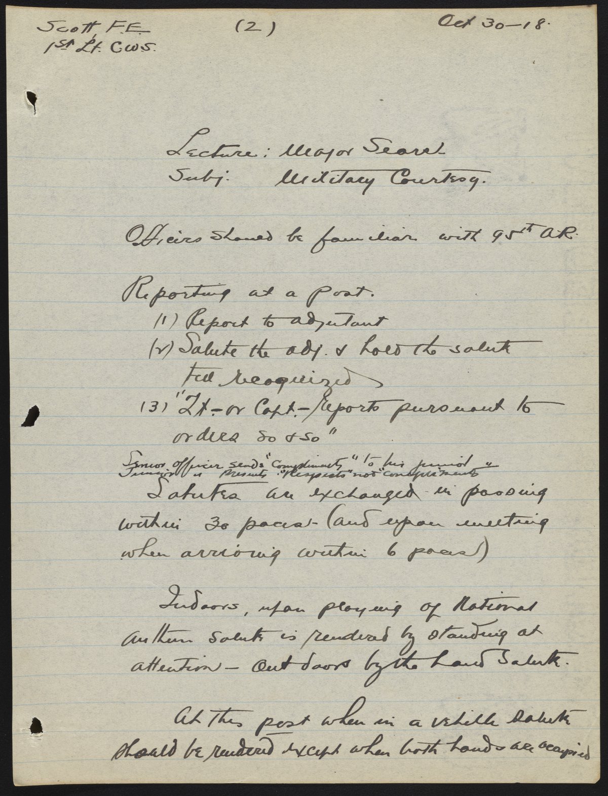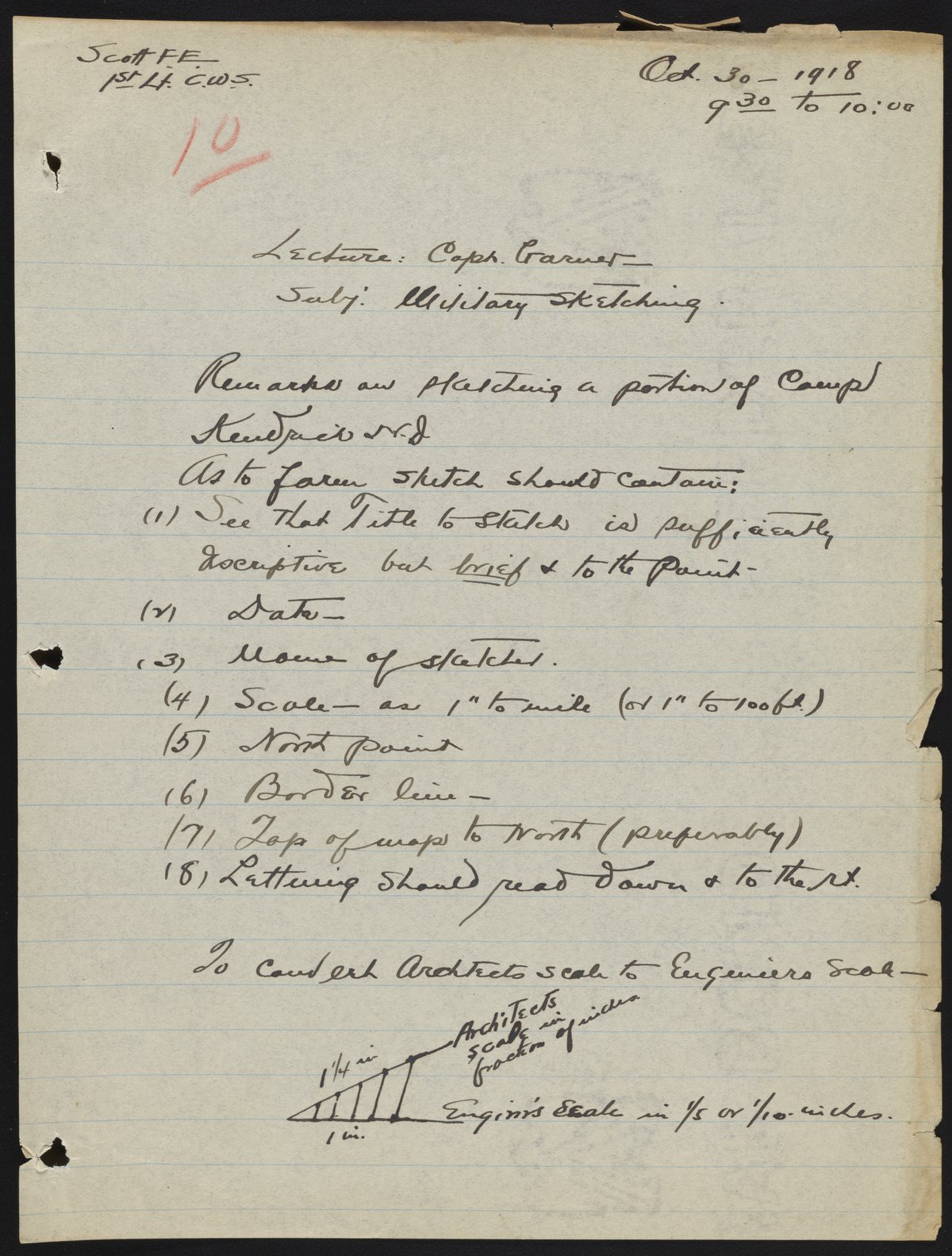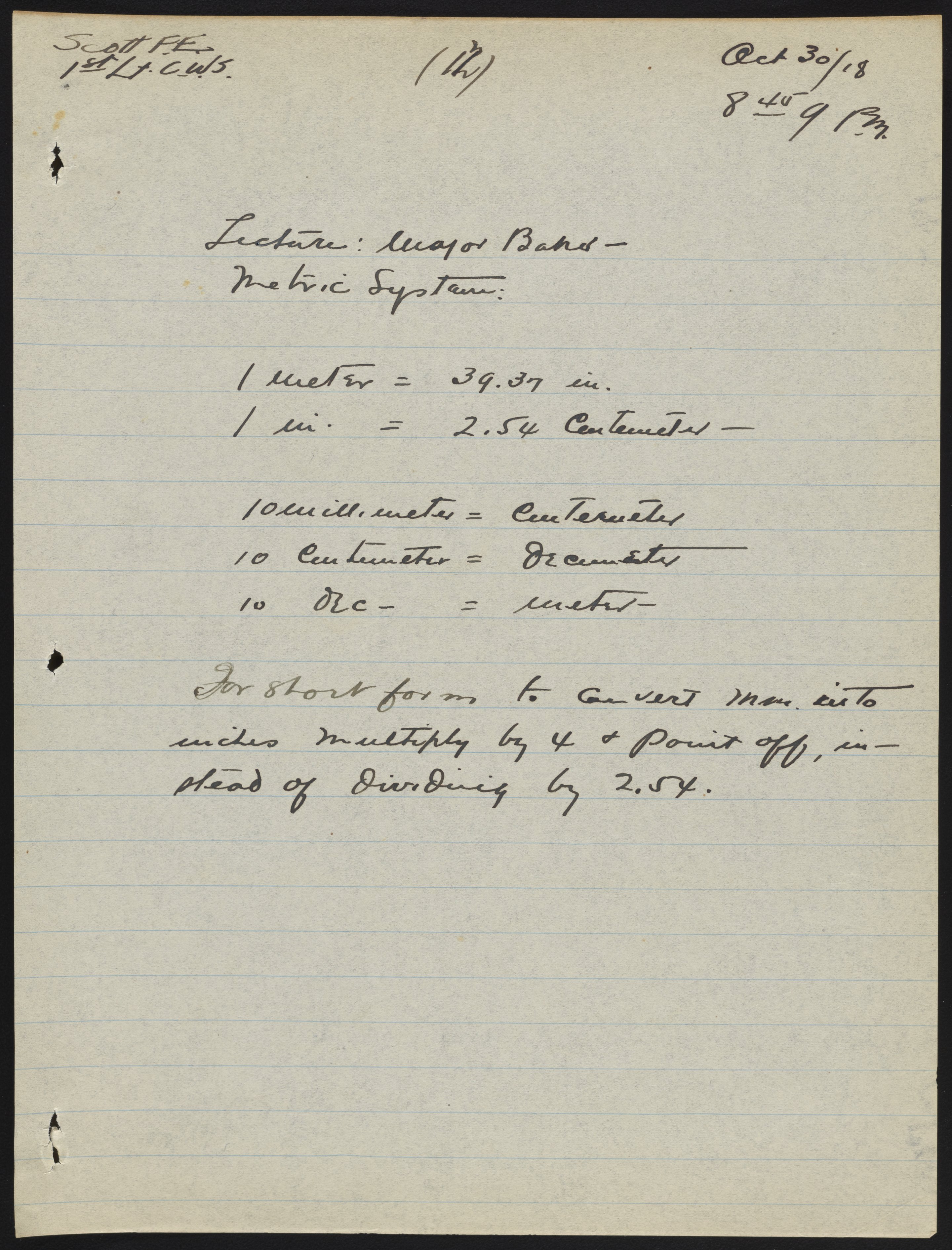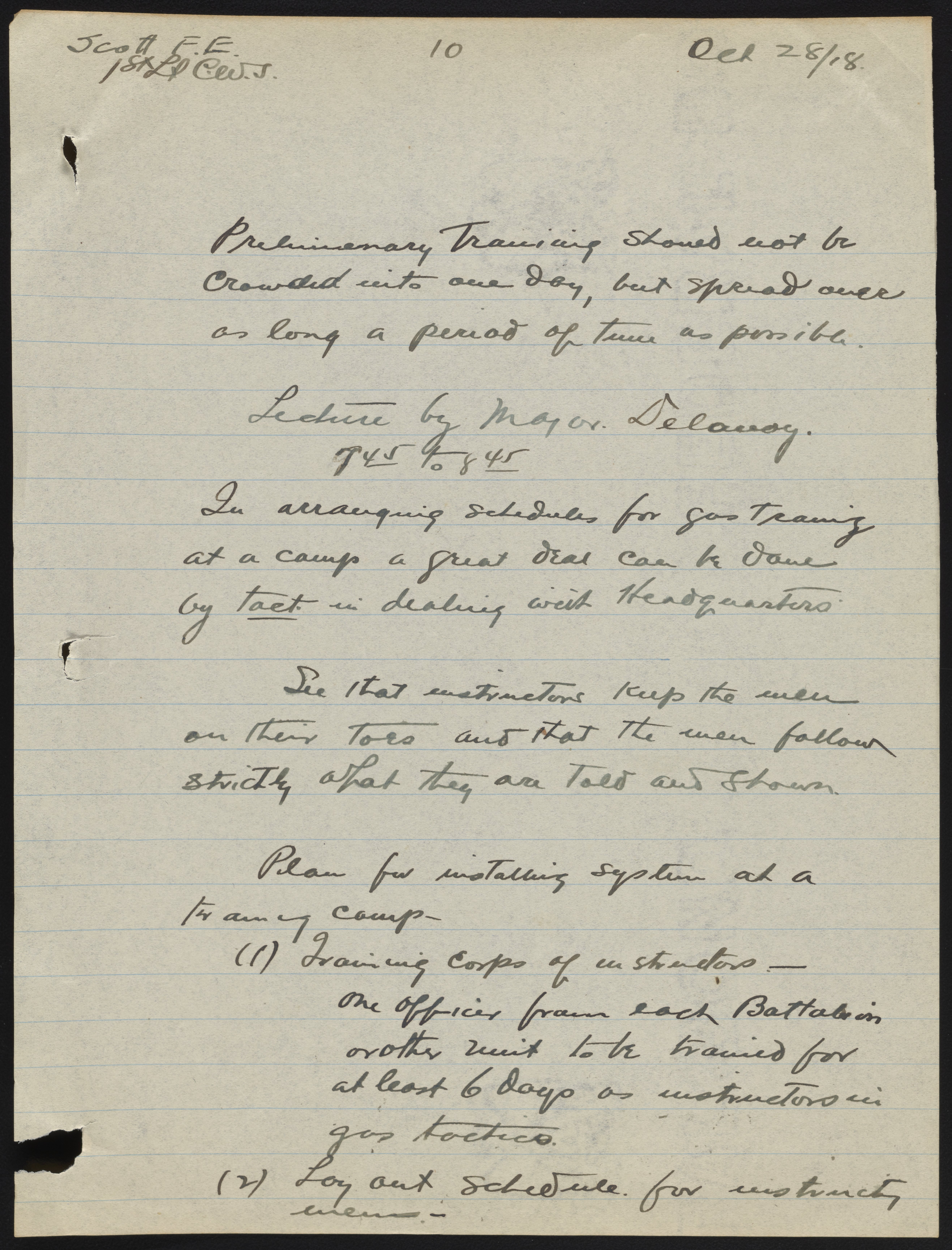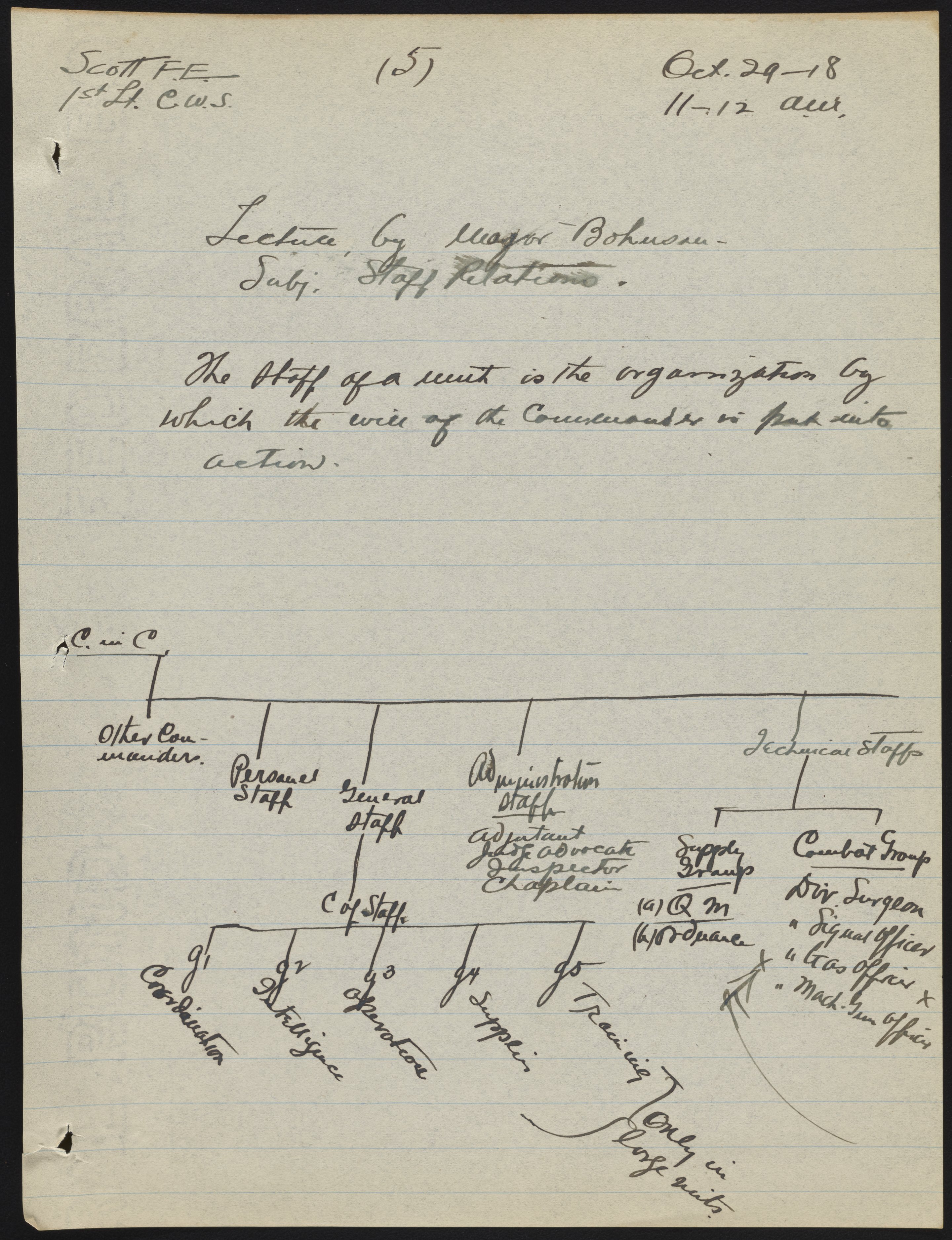 Small JPG1200 x 1562px — 345 KBLarge JPG2880 x 3748px — 1.7 MBFull-sized JPG5302 x 6900px — 4.7 MBOriginal fileTIFF — 5302 x 6900px — 105 MBNotebook consists of handwritten notes taken by Francis E. Scott at the U.S. Army Gas School at Camp Kendrick, New Jersey, on the use of gas in warfare. The notes include teaching aids and a circular letter from Brigadier General Amos A. Fries, Chief of the Chemical Warfare Service, in which he discusses use of gas in trench warfare in France. Scott held the rank of 1st Lieutenant in the Army's Chemical Warfare Service during World War I.