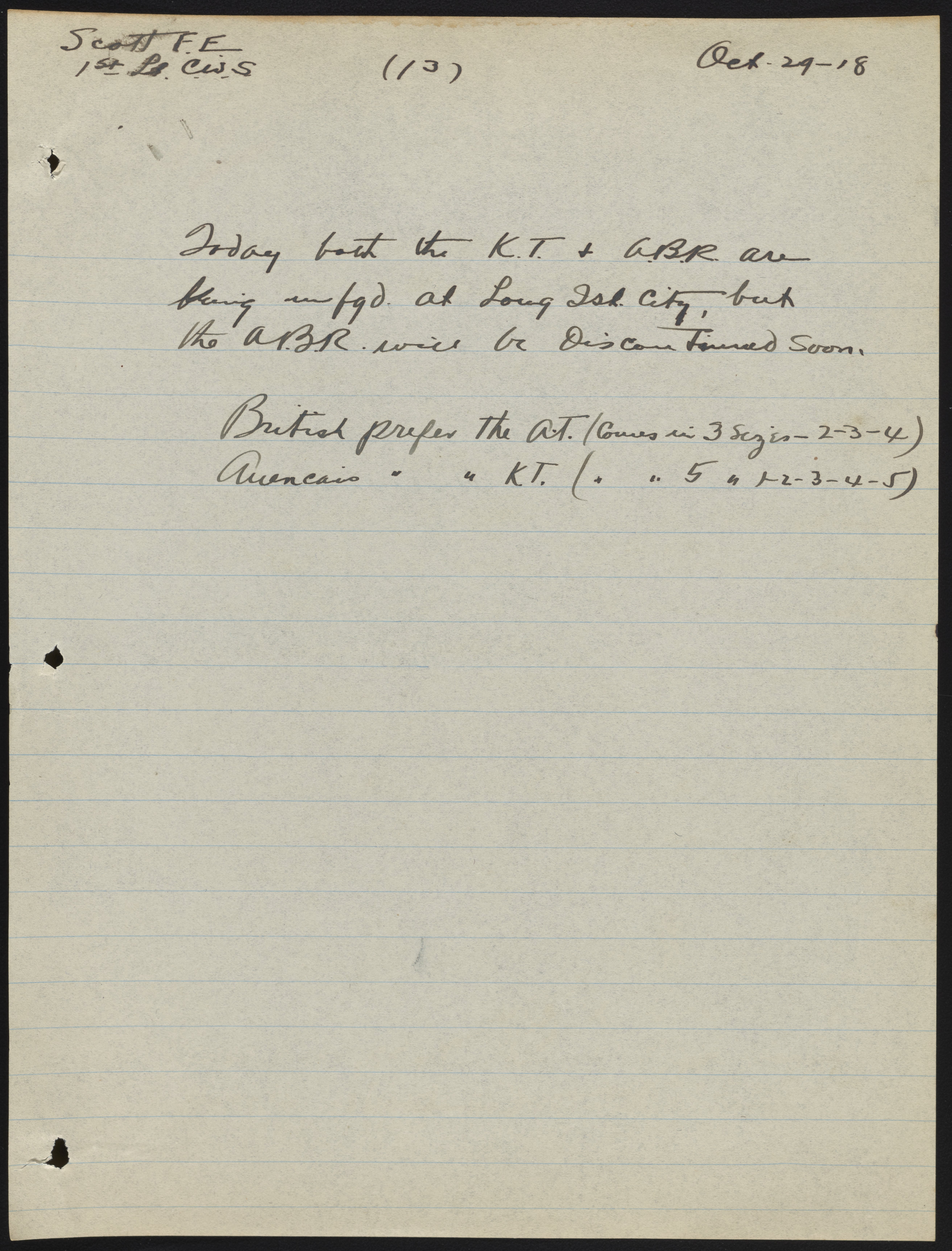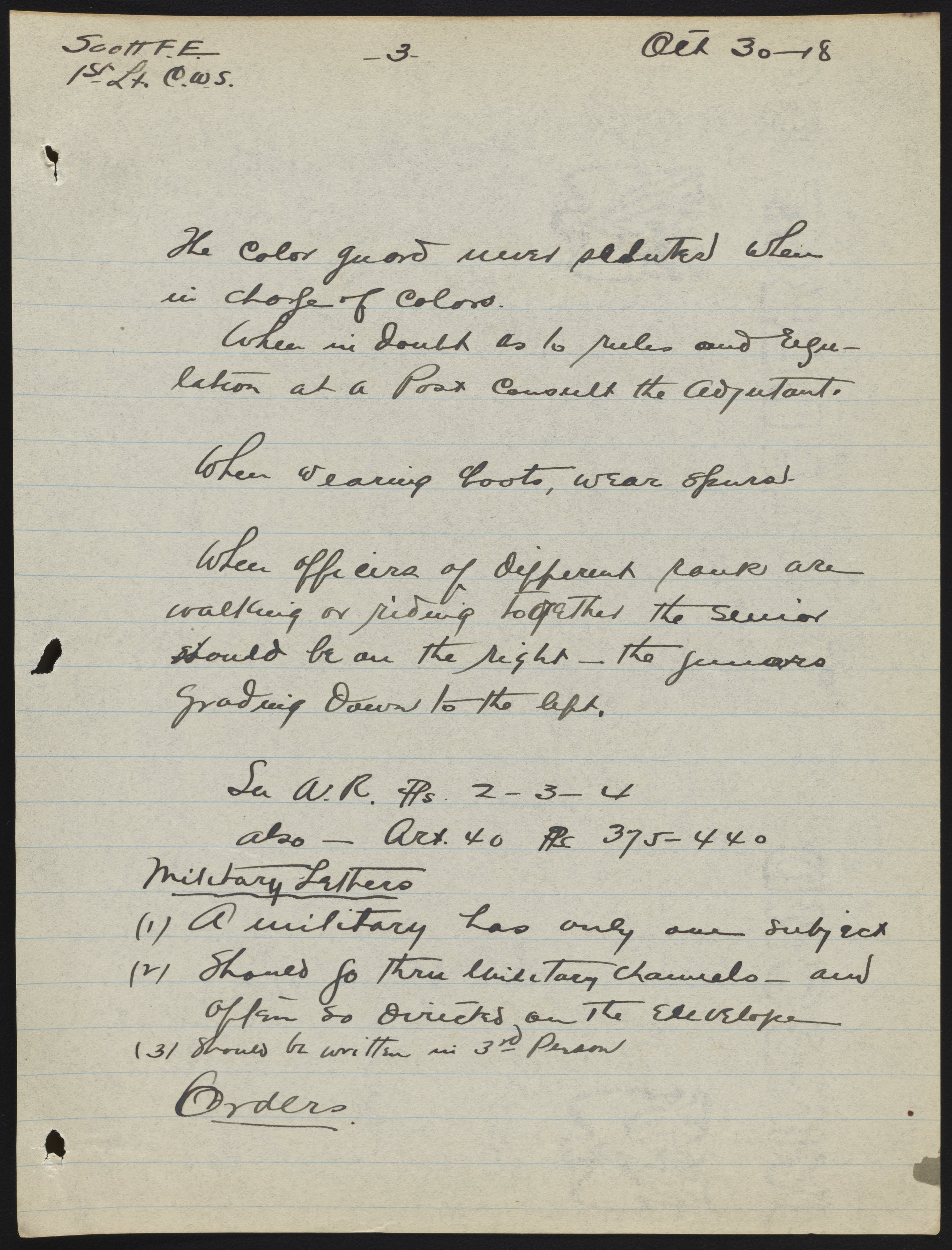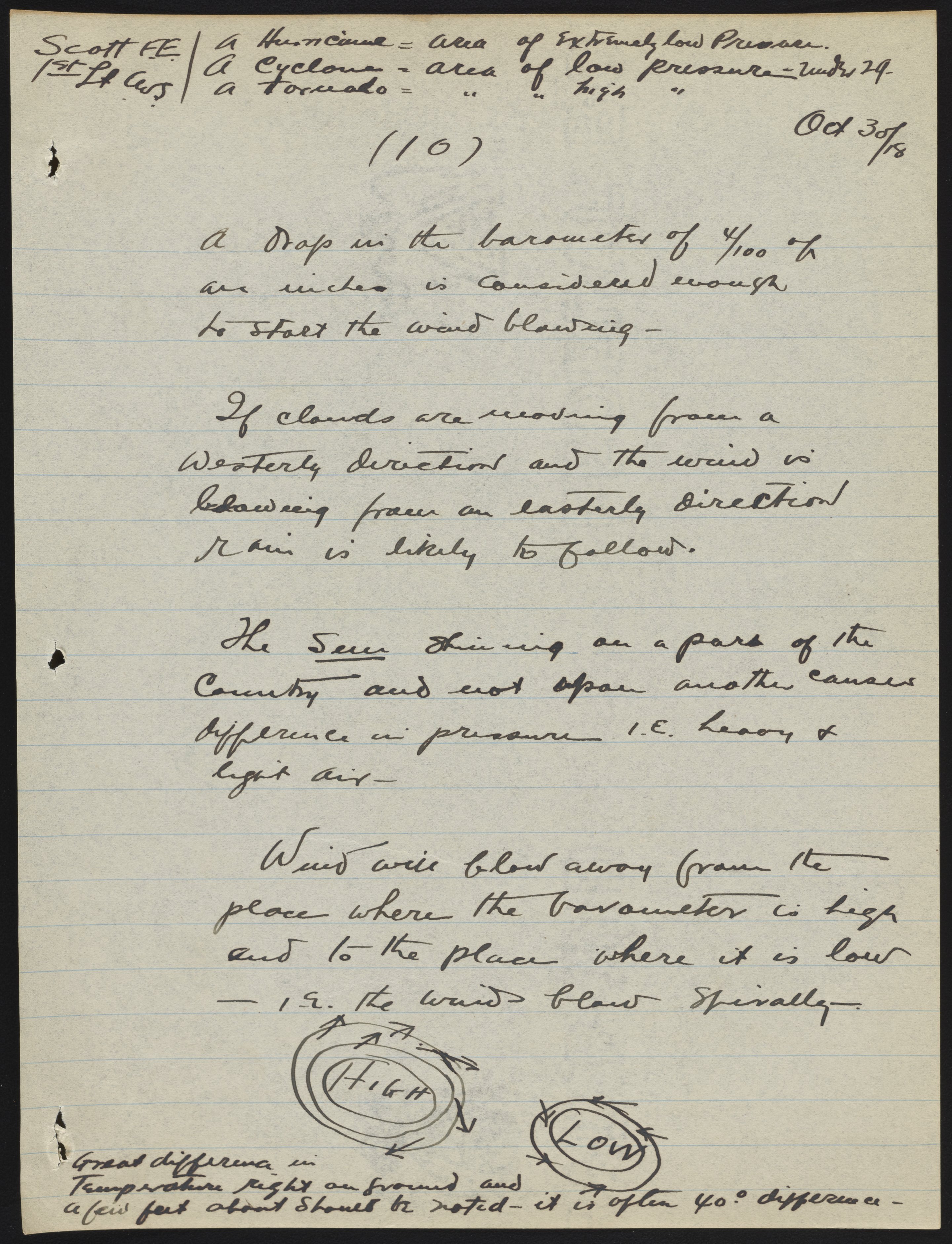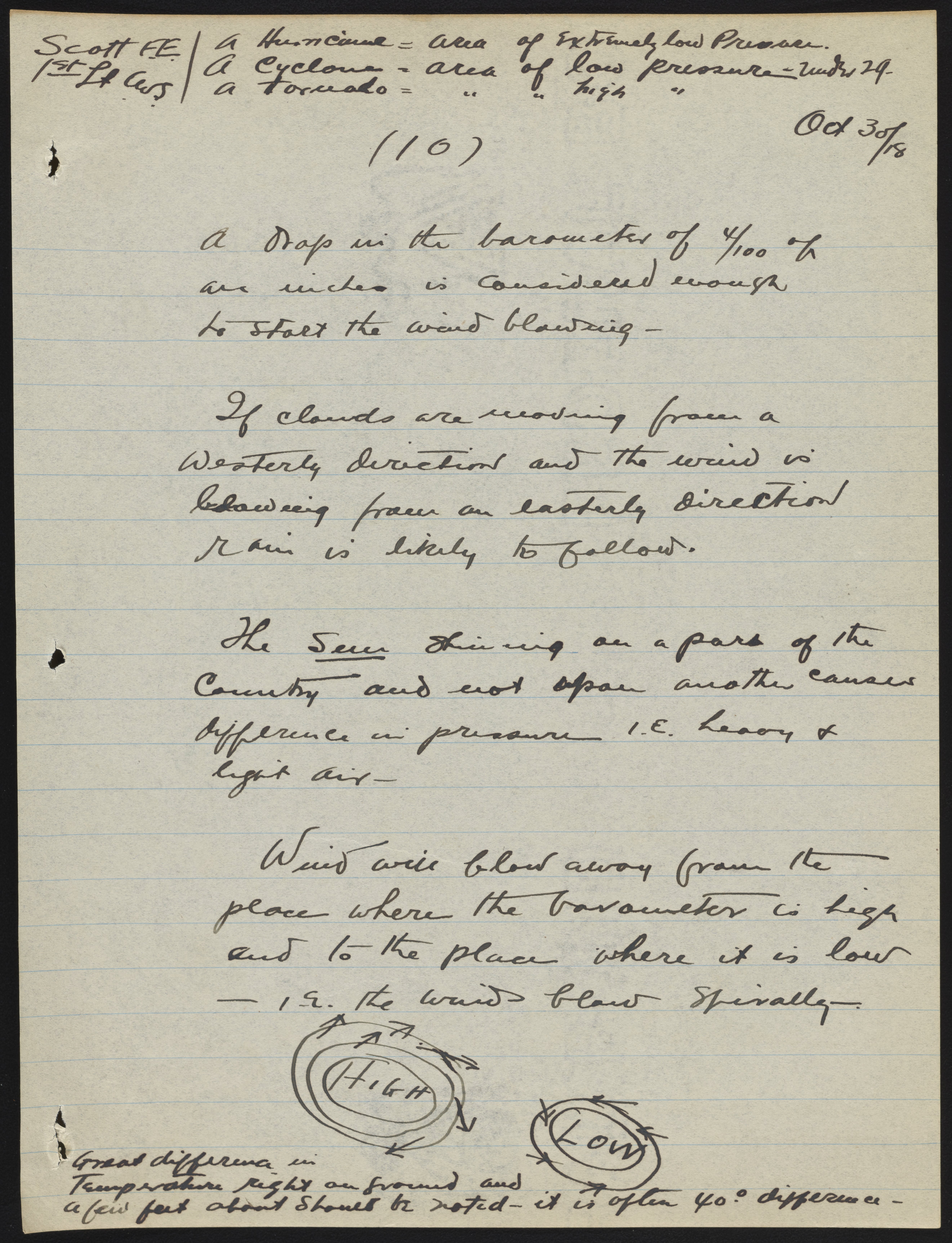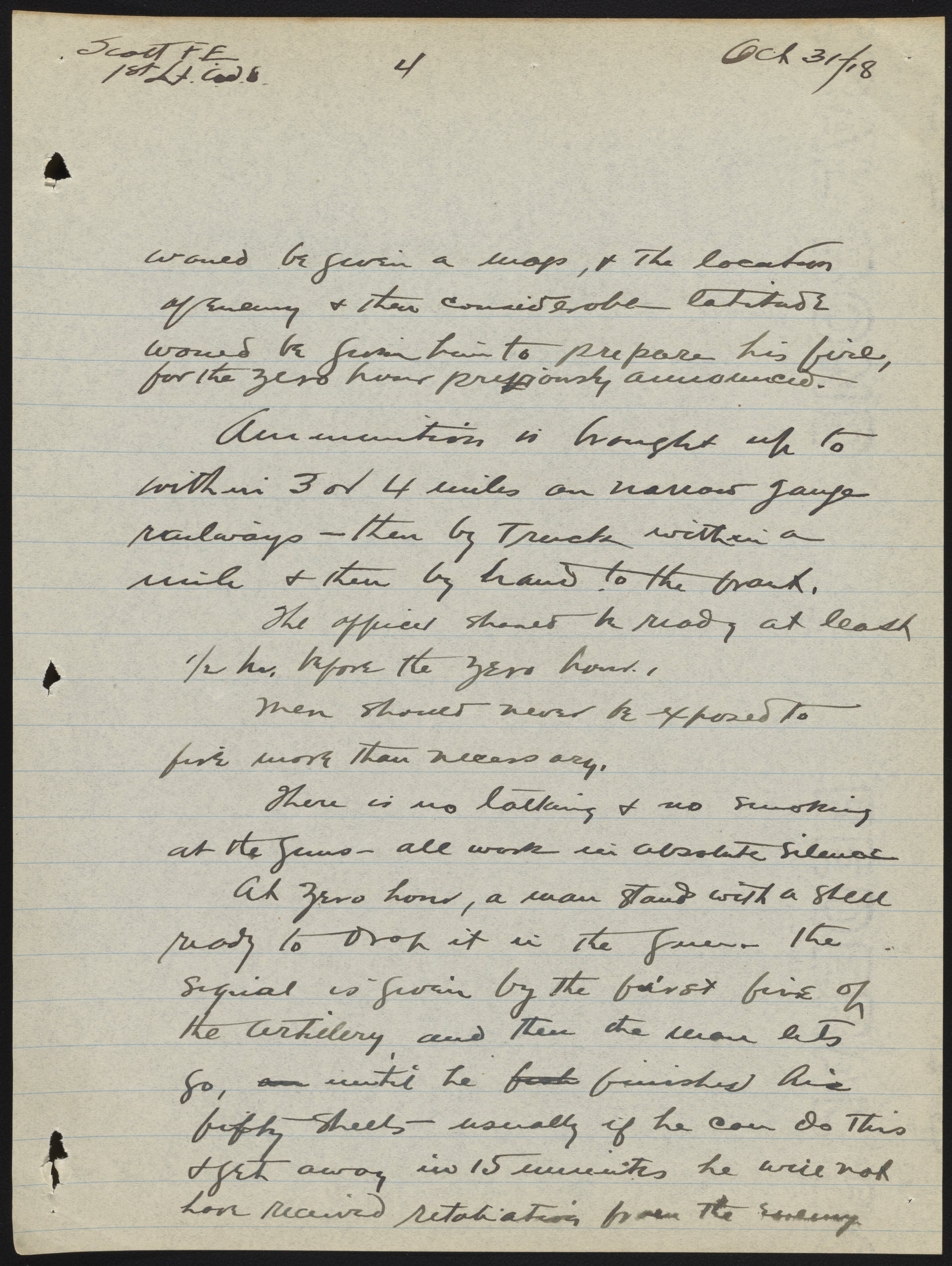 Small JPG1200 x 1562px — 345 KBLarge JPG2880 x 3748px — 1.7 MBFull-sized JPG5302 x 6900px — 4.7 MBOriginal fileTIFF — 5302 x 6900px — 105 MBNotebook consists of handwritten notes taken by Francis E. Scott at the U.S. Army Gas School at Camp Kendrick, New Jersey, on the use of gas in warfare. The notes include teaching aids and a circular letter from Brigadier General Amos A. Fries, Chief of the Chemical Warfare Service, in which he discusses use of gas in trench warfare in France. Scott held the rank of 1st Lieutenant in the Army's Chemical Warfare Service during World War I.