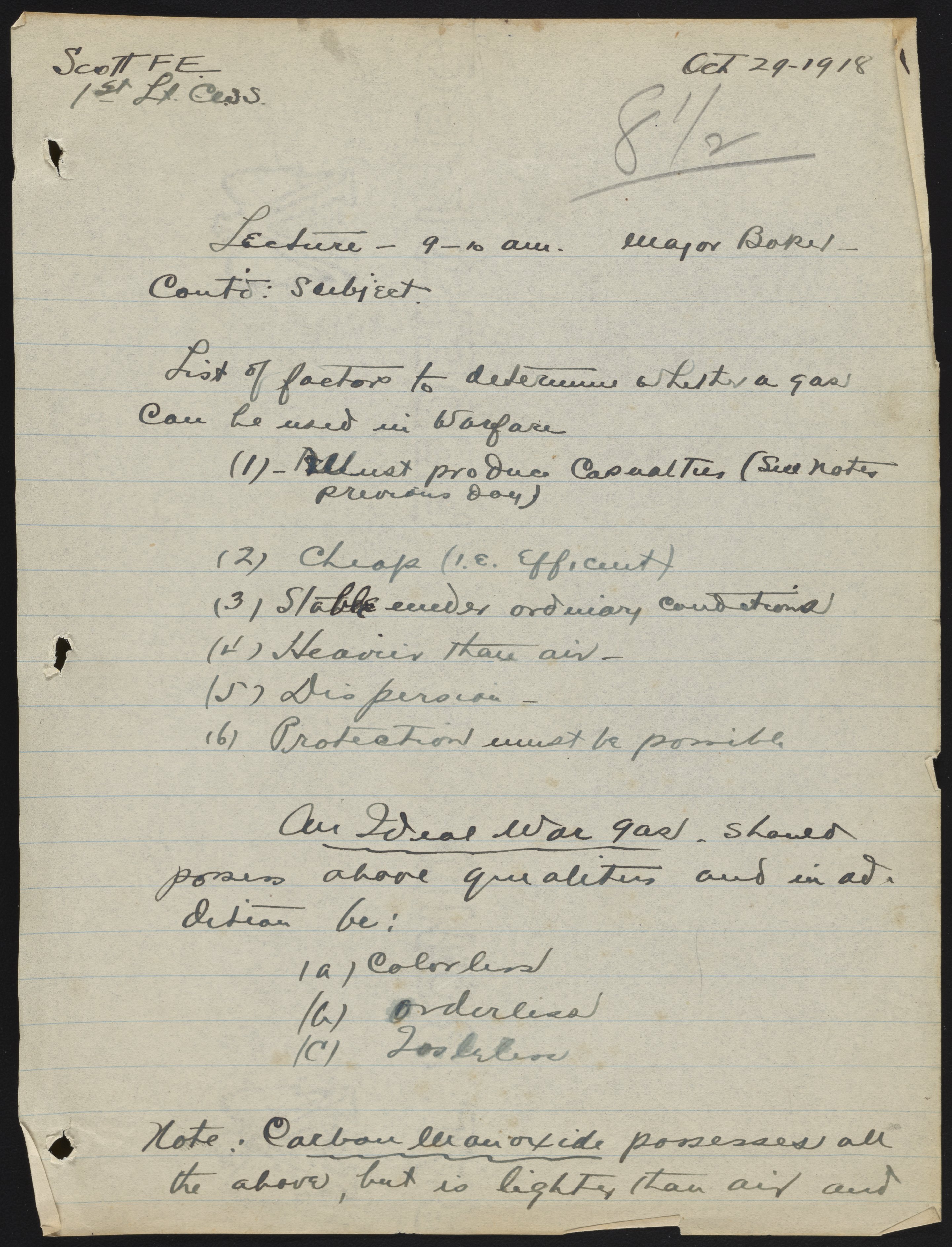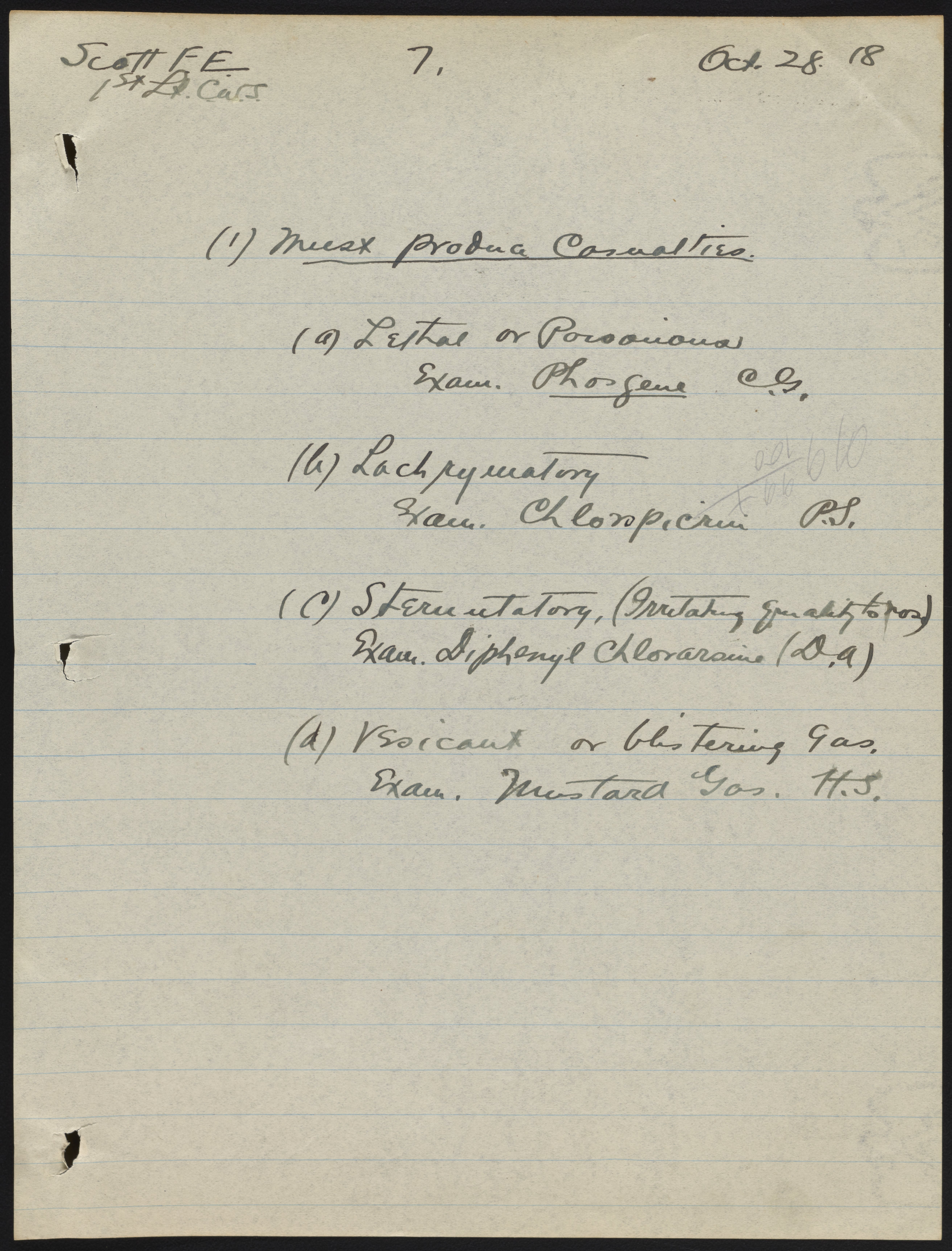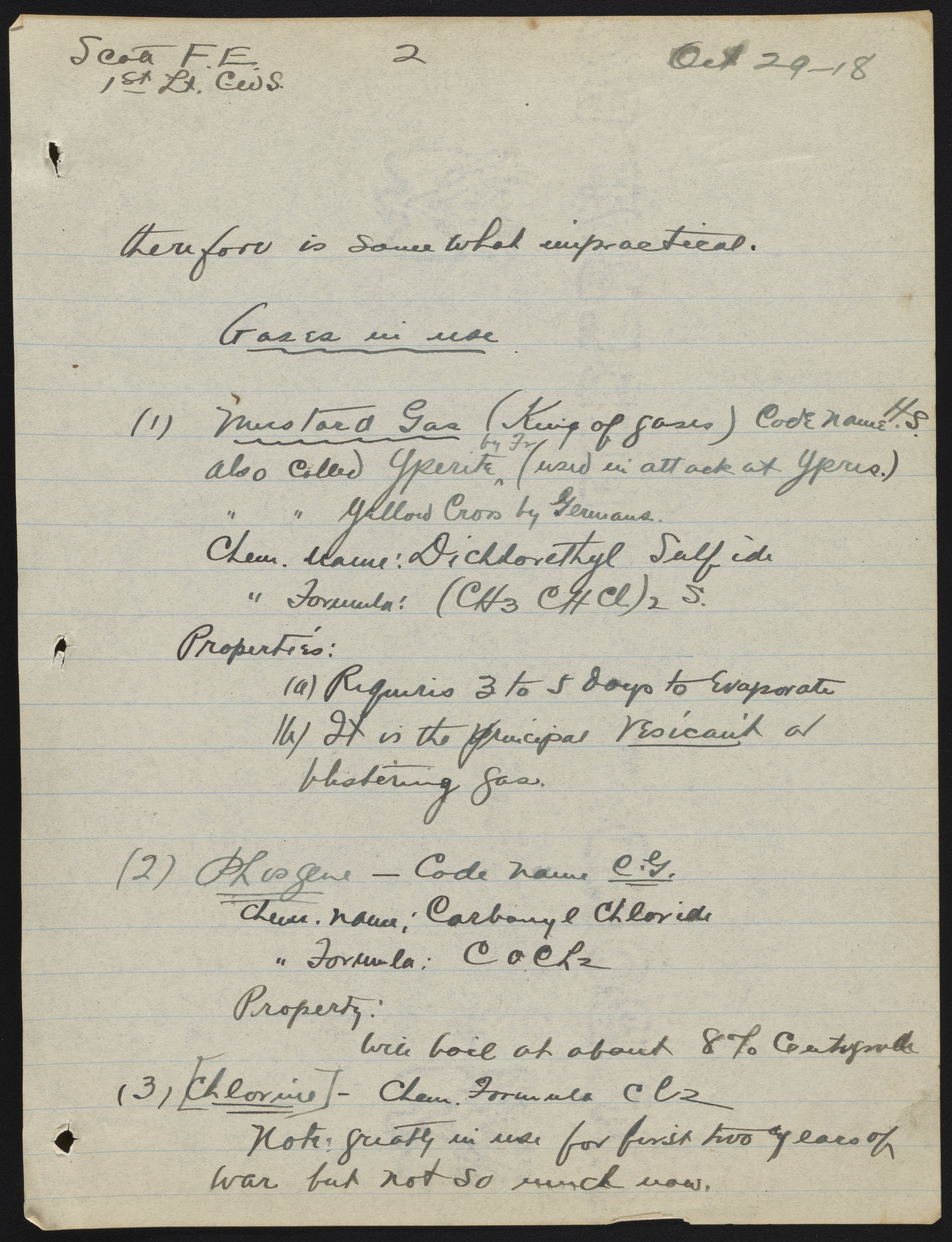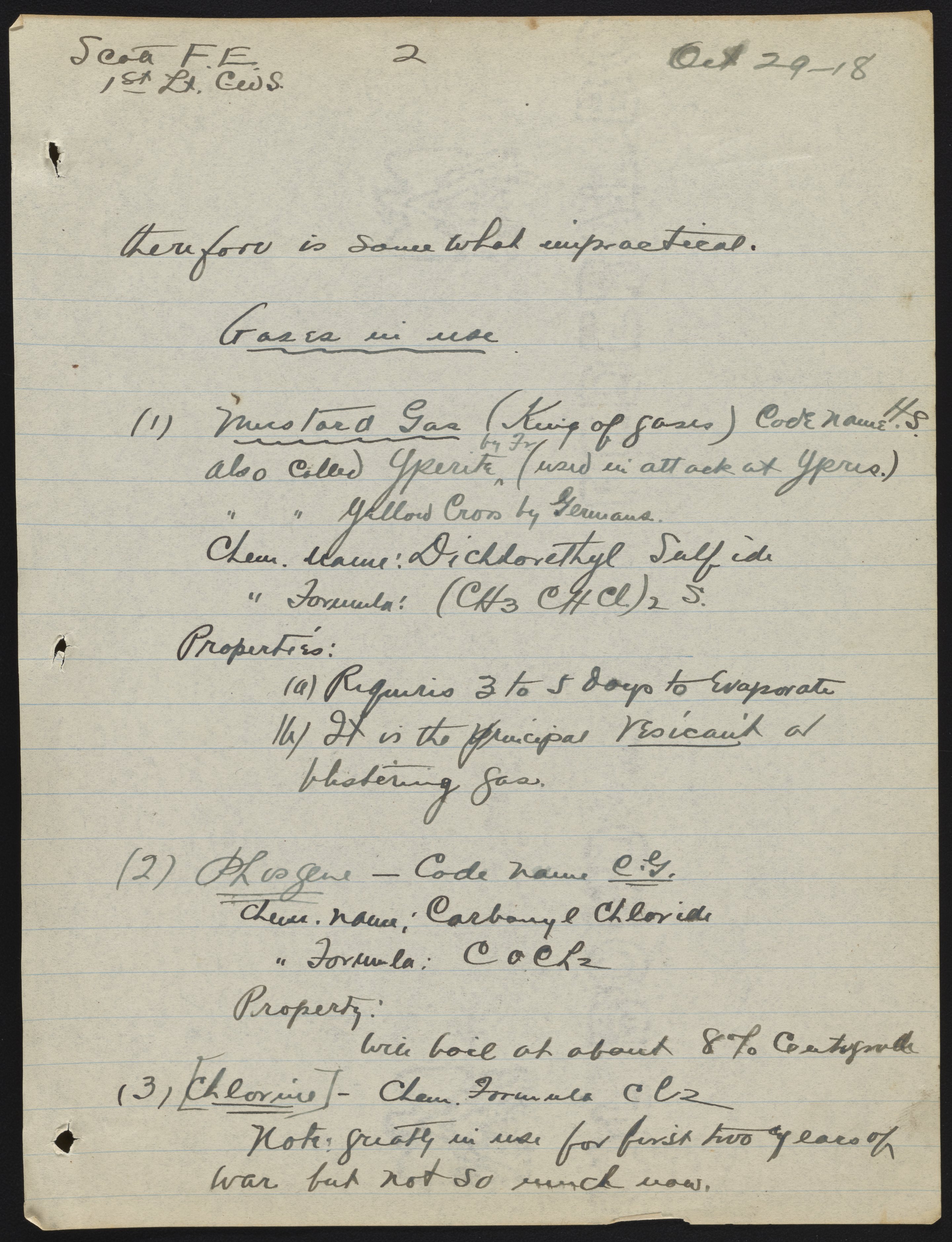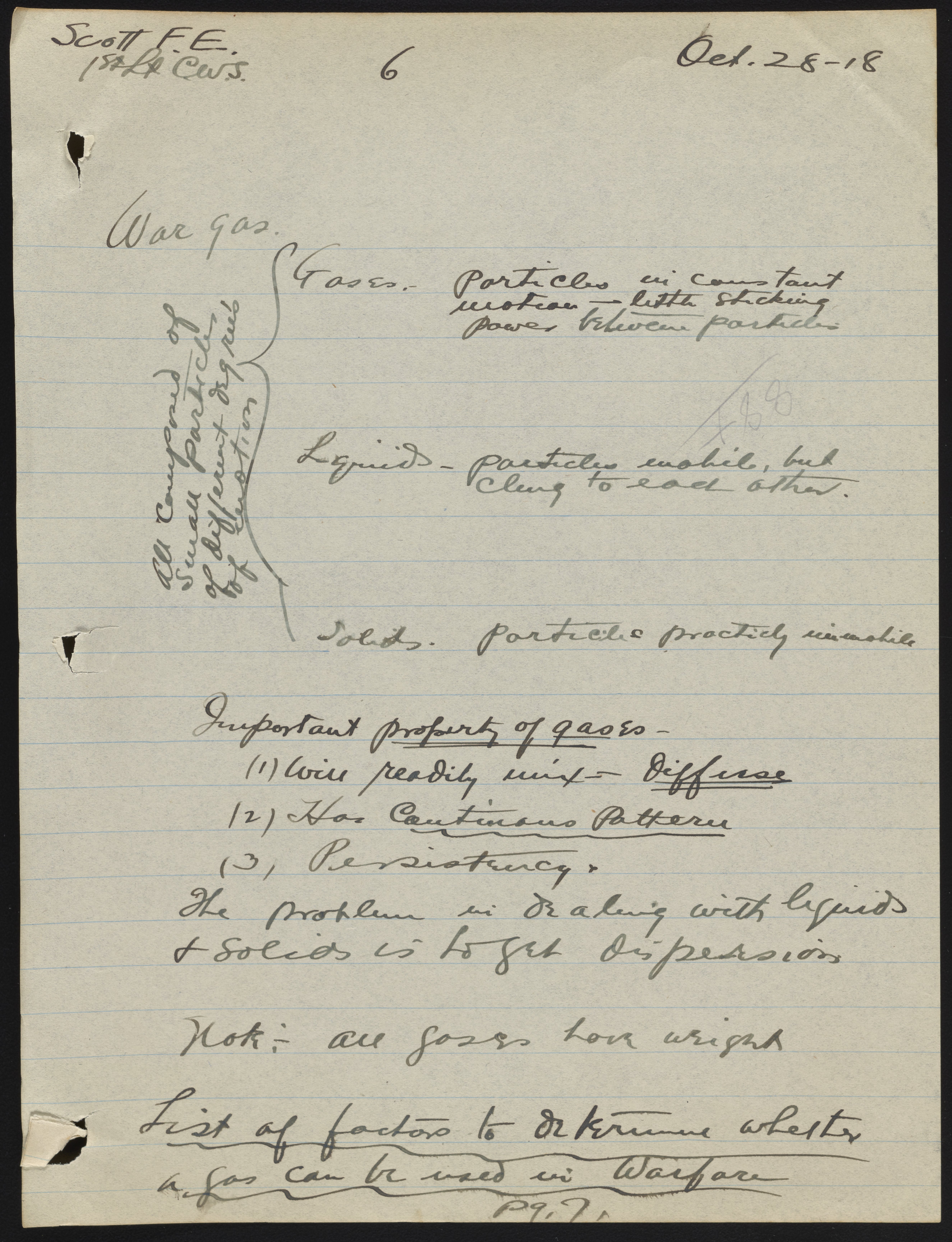 Scott, Francis E. “United States Army Gas School Course Notes,” 1918. Household and Organic Chemistry Course Notebooks. Science History Institute. Philadelphia. https://digital.sciencehistory.org/works/tx31qj045.