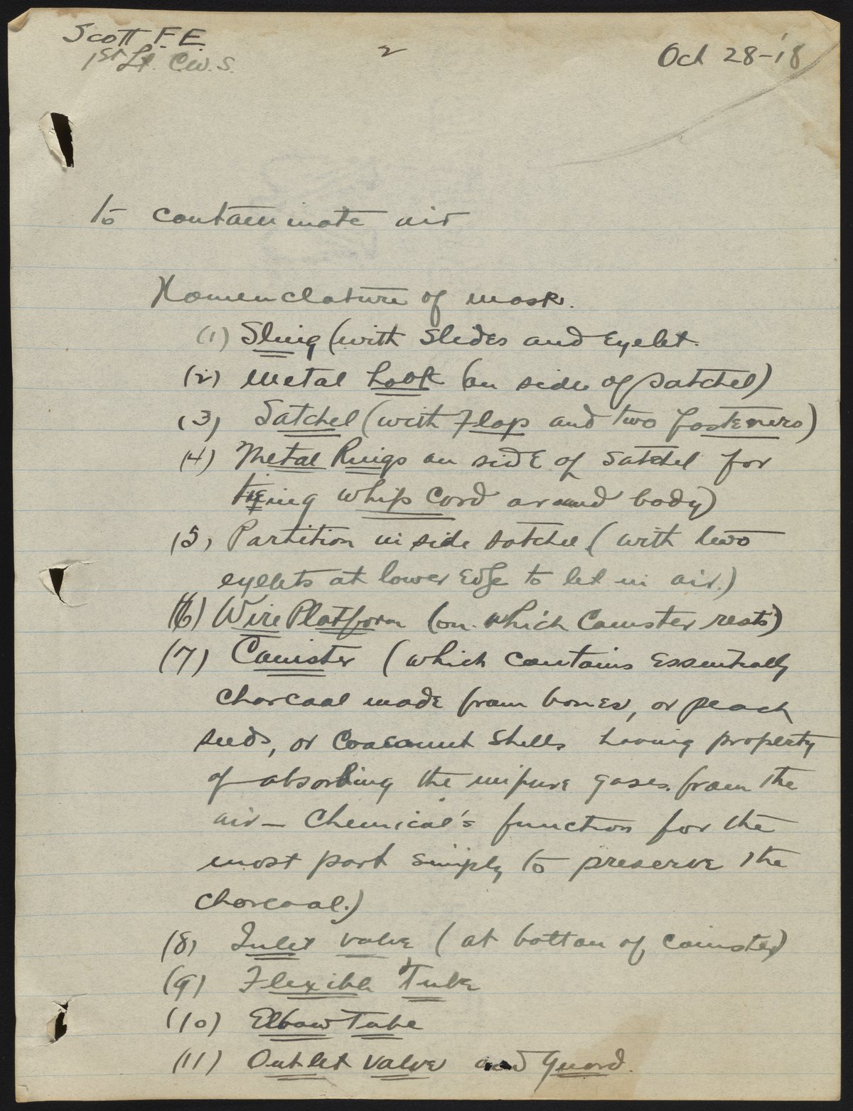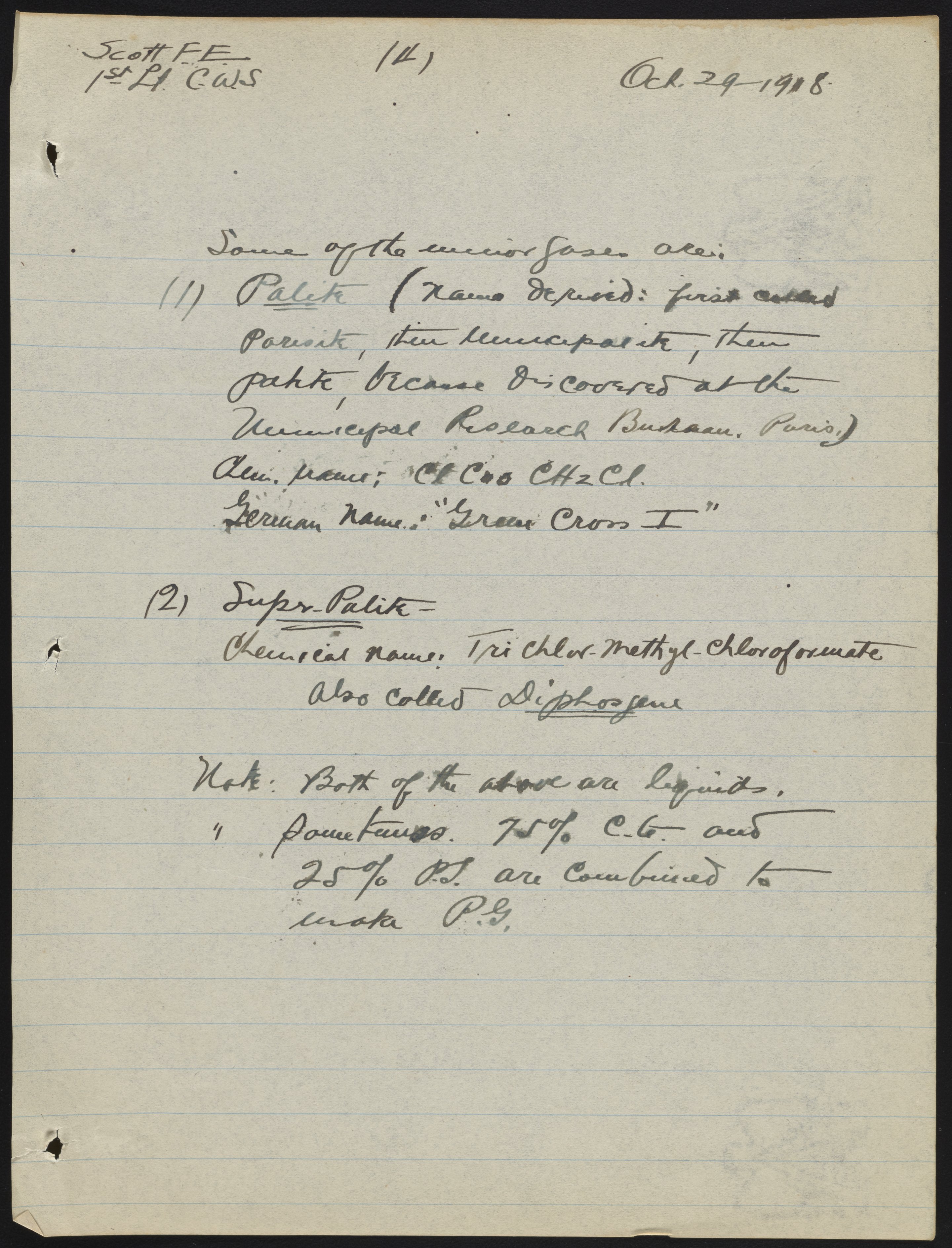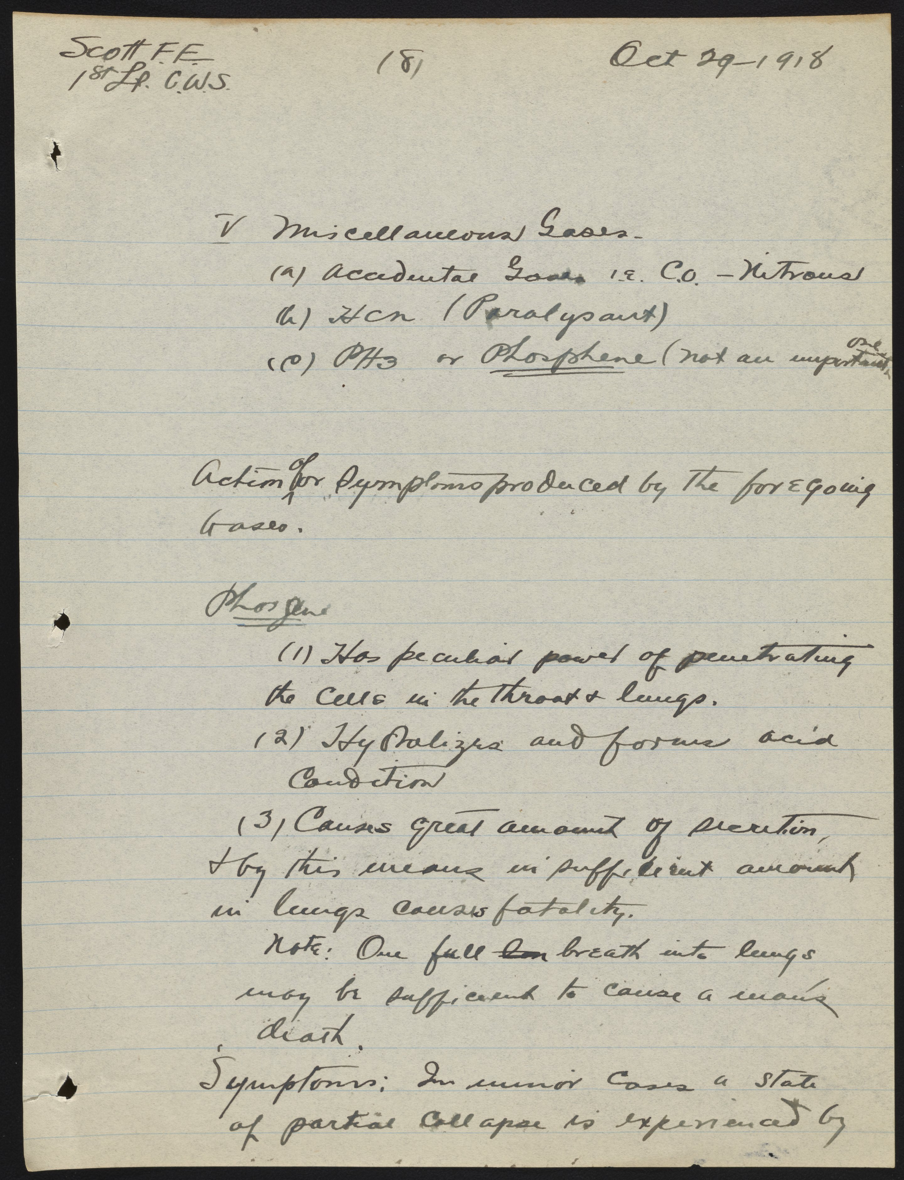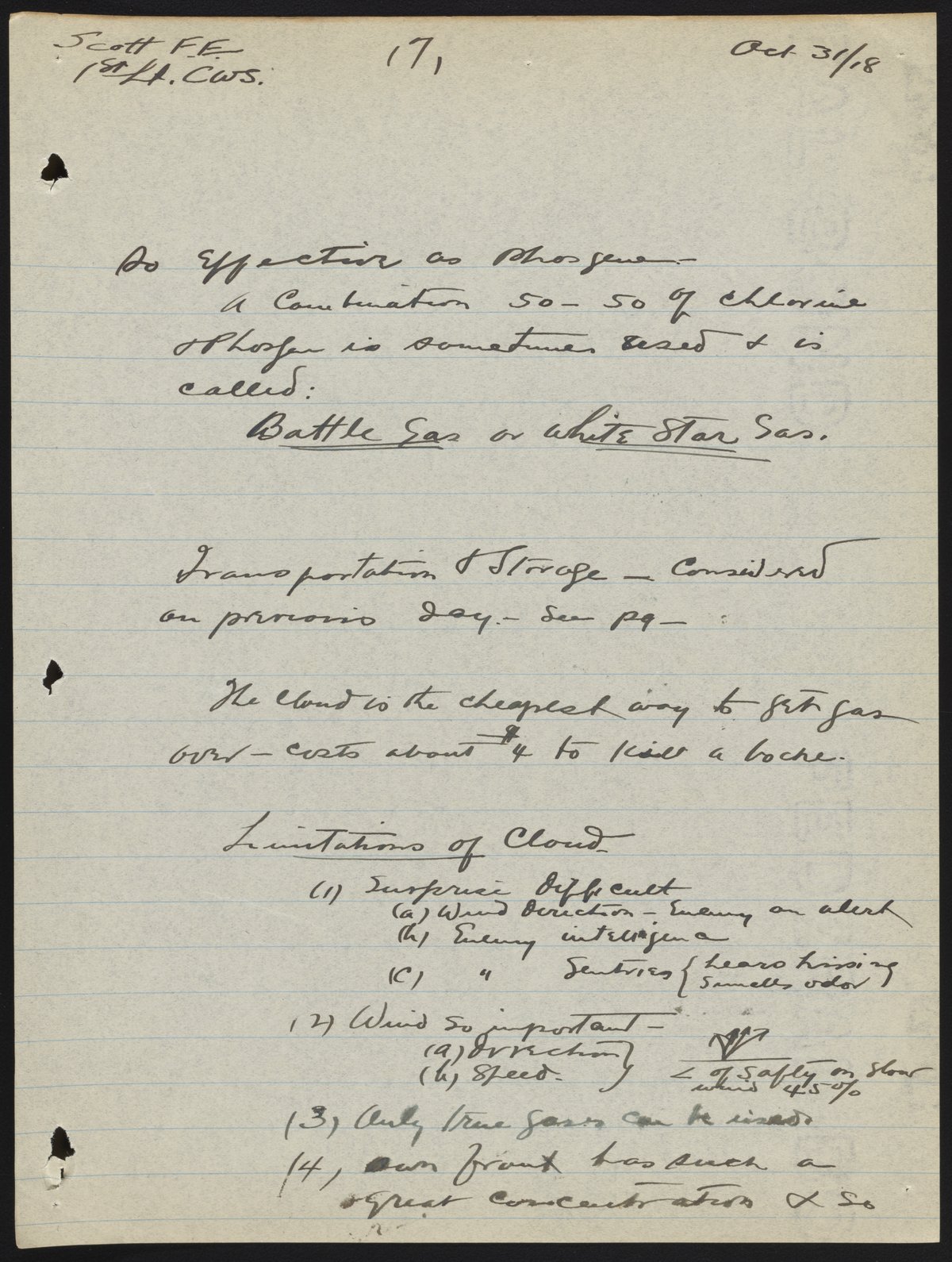 Scott, Francis E. “United States Army Gas School Course Notes,” 1918. Household and Organic Chemistry Course Notebooks. Science History Institute. Philadelphia. https://digital.sciencehistory.org/works/tx31qj045.