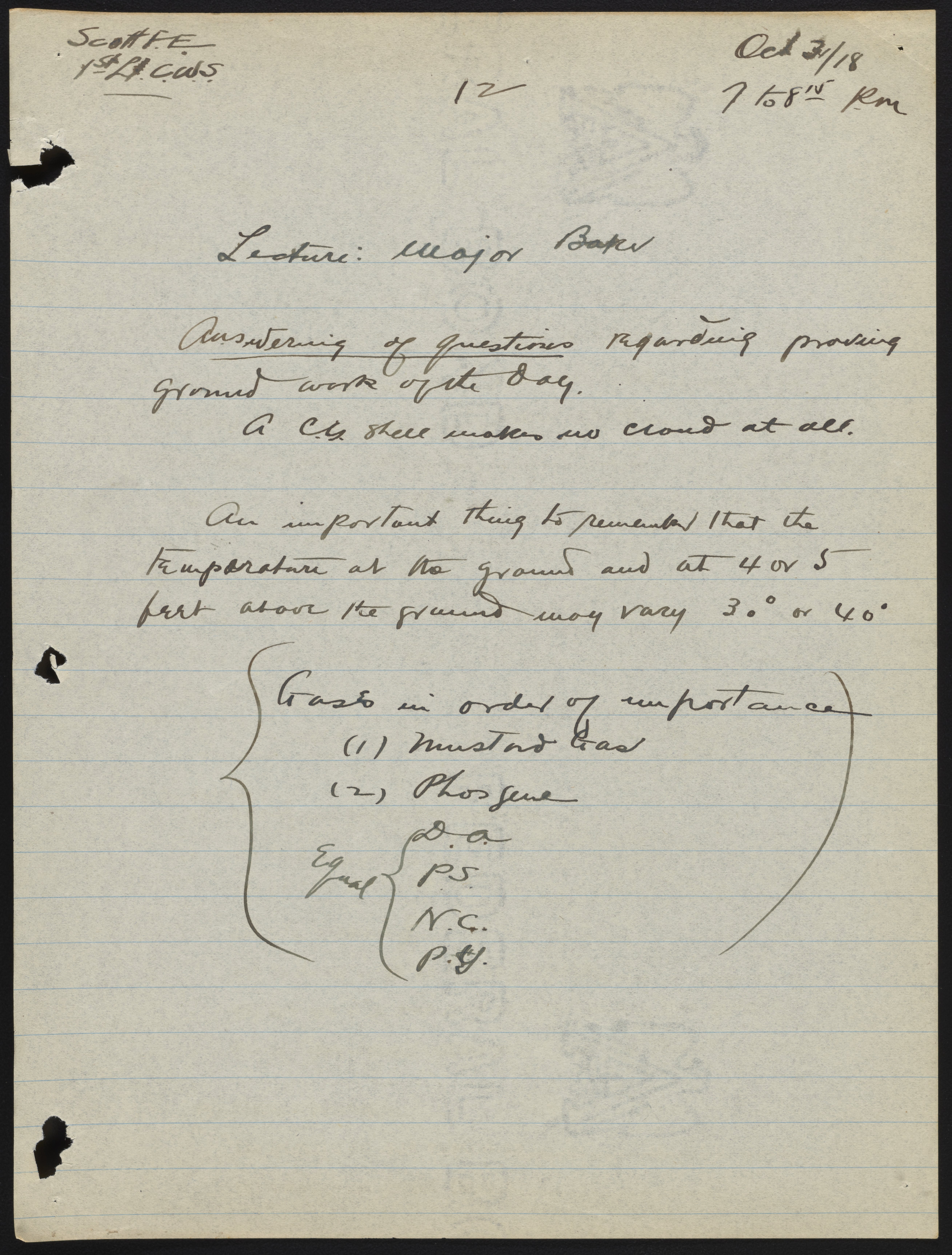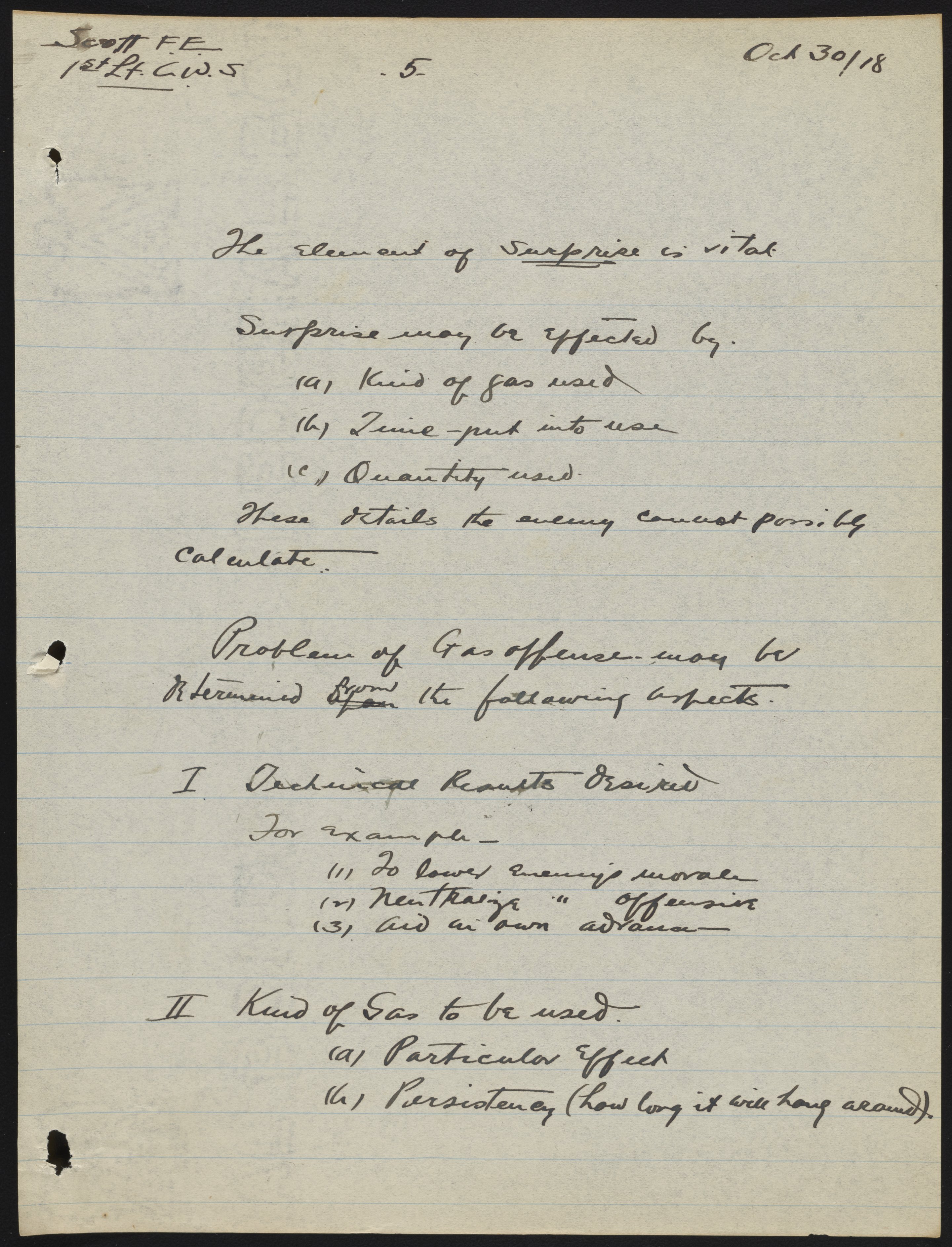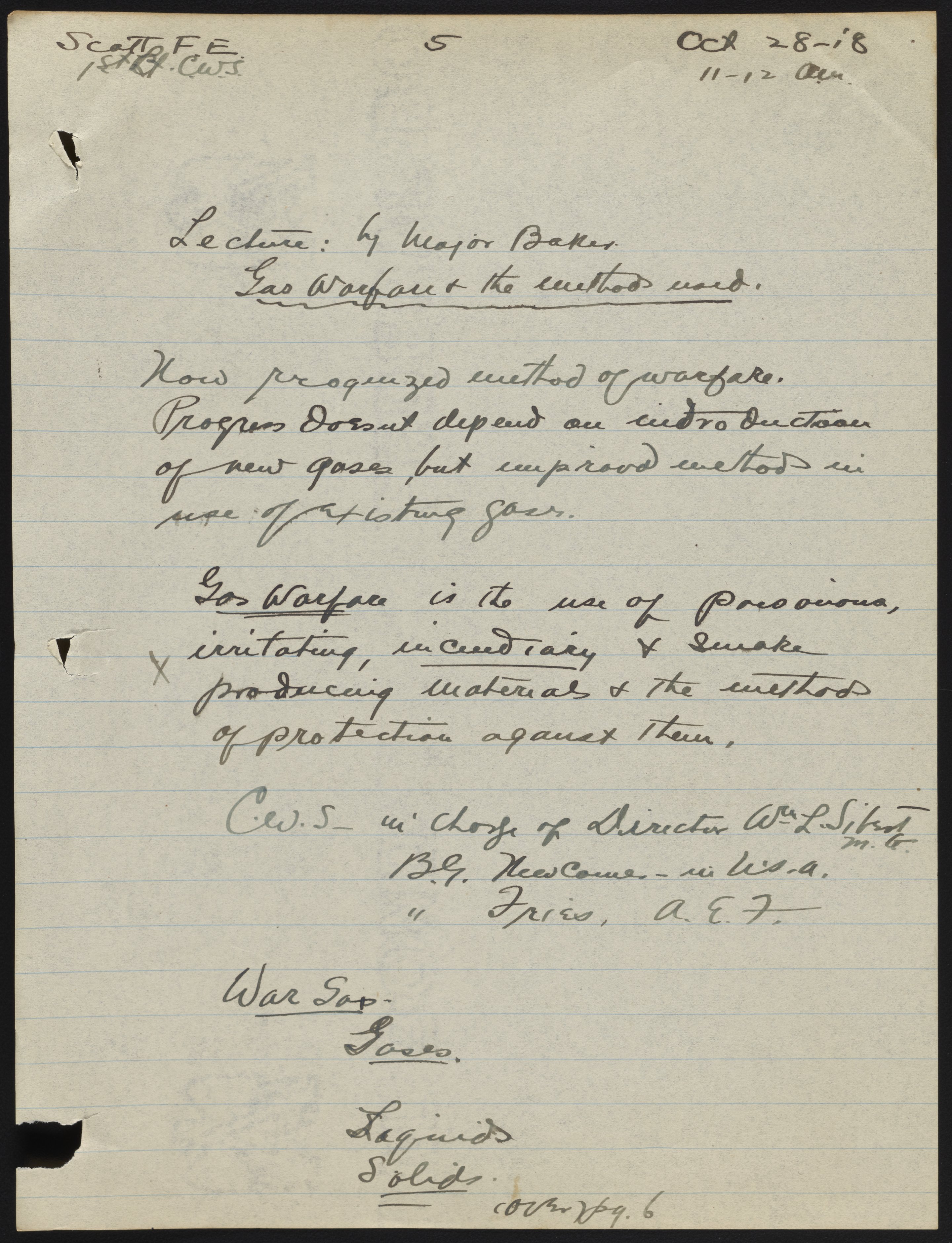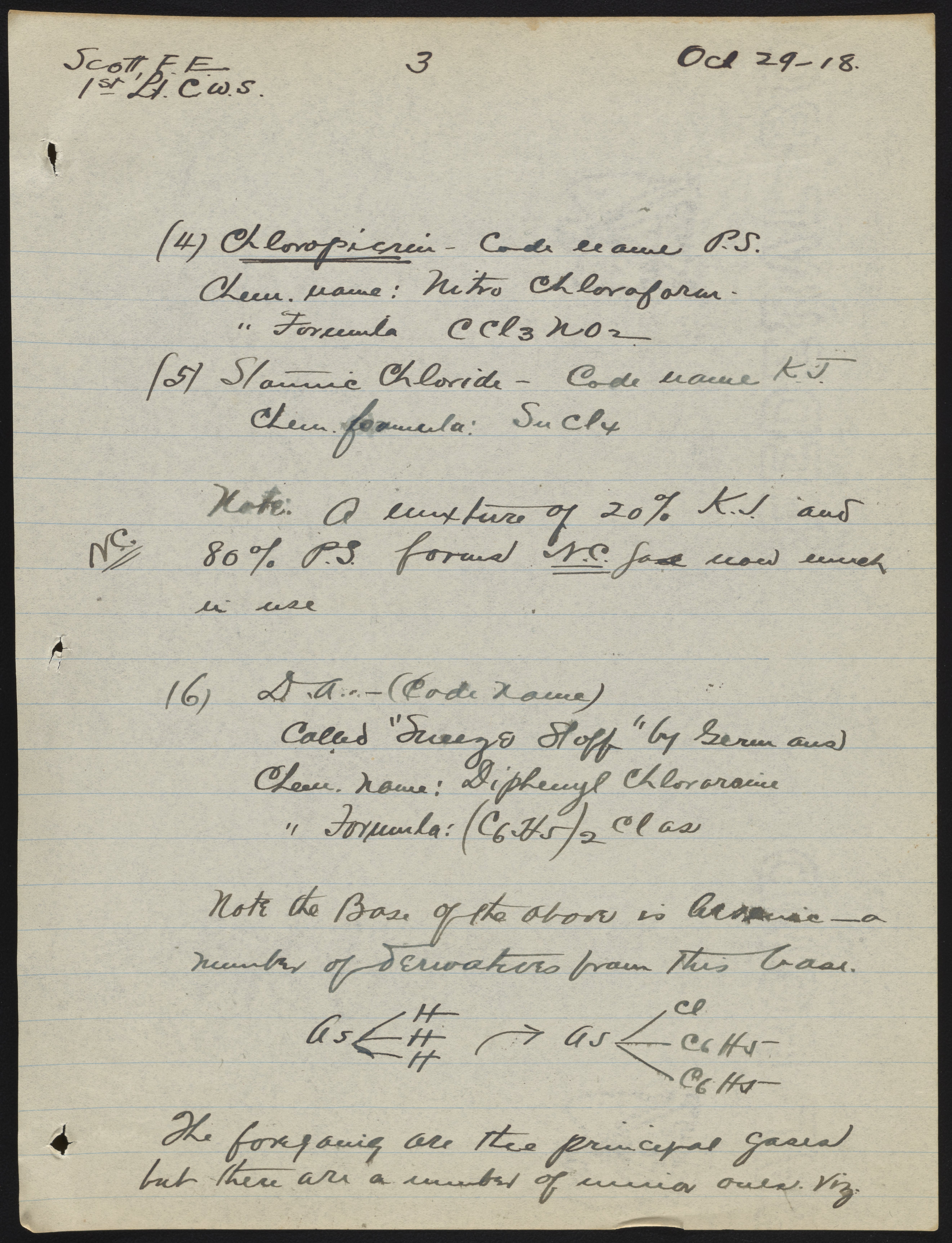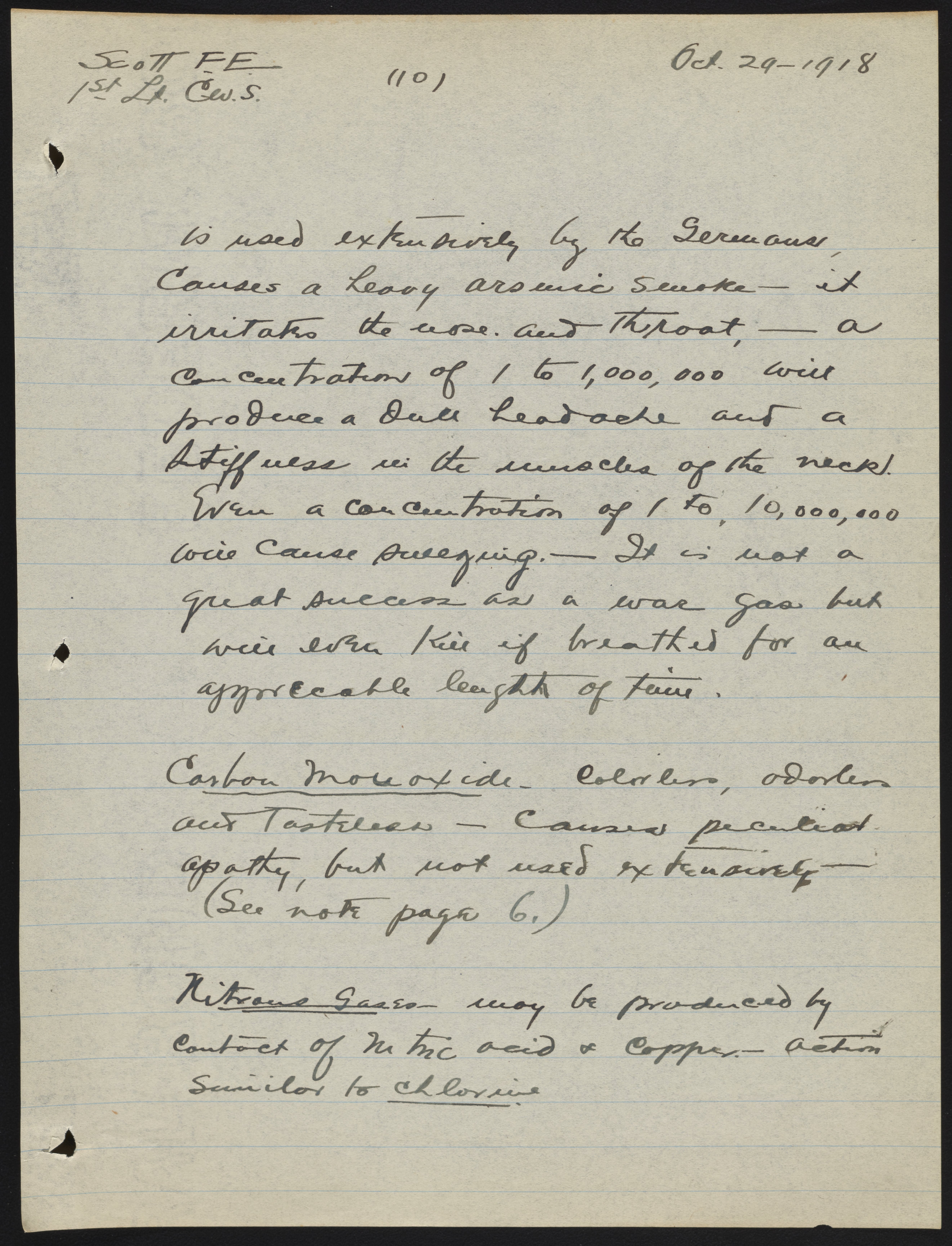 Scott, Francis E. “United States Army Gas School Course Notes,” 1918. Household and Organic Chemistry Course Notebooks. Science History Institute. Philadelphia. https://digital.sciencehistory.org/works/tx31qj045.
