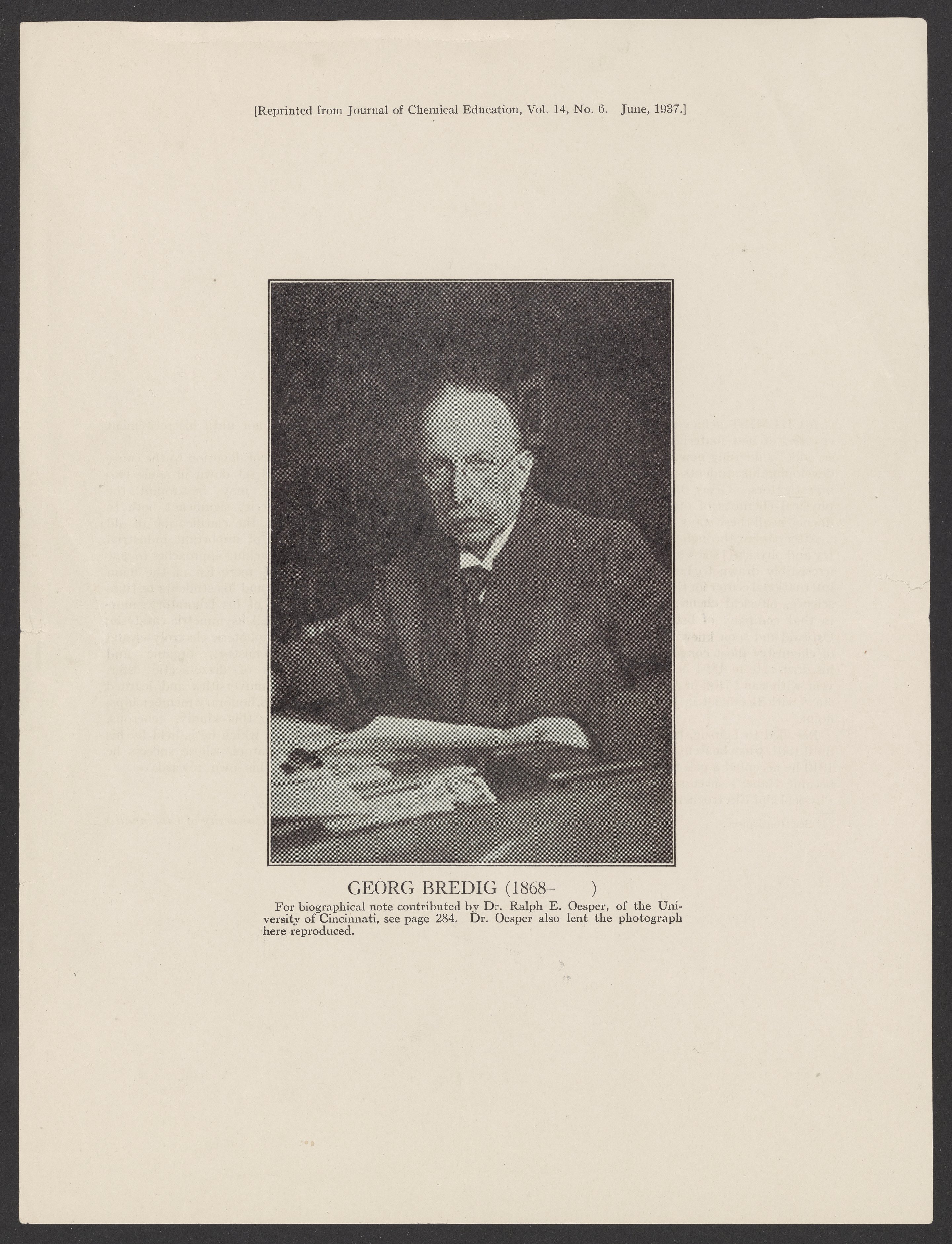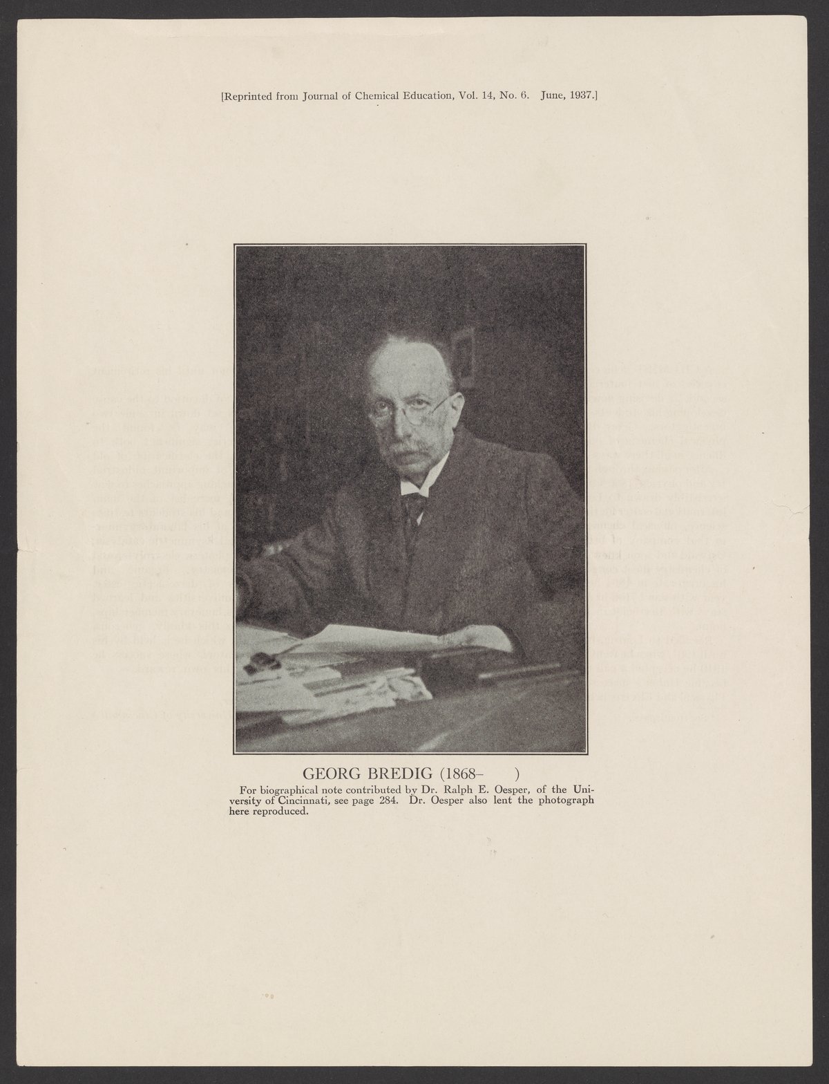 Oesper, Ralph E. (Ralph Edward). “Georg Bredig (1868- ).” American Chemical Society, June 1937. Papers of Georg and Max Bredig, Box 3, Folder 10. Science History Institute. Philadelphia. https://digital.sciencehistory.org/works/tyeplmz.