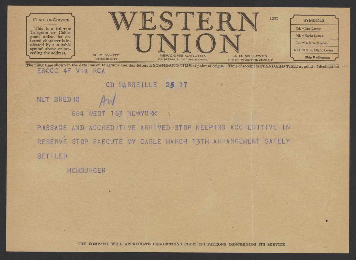 Telegram to Max Albert Bredig (1902-19770 from Marianne Homburger (1903-1986) or Viktor Homburger (1888-1968). Telegram says that passage and “accreditation” have been received.