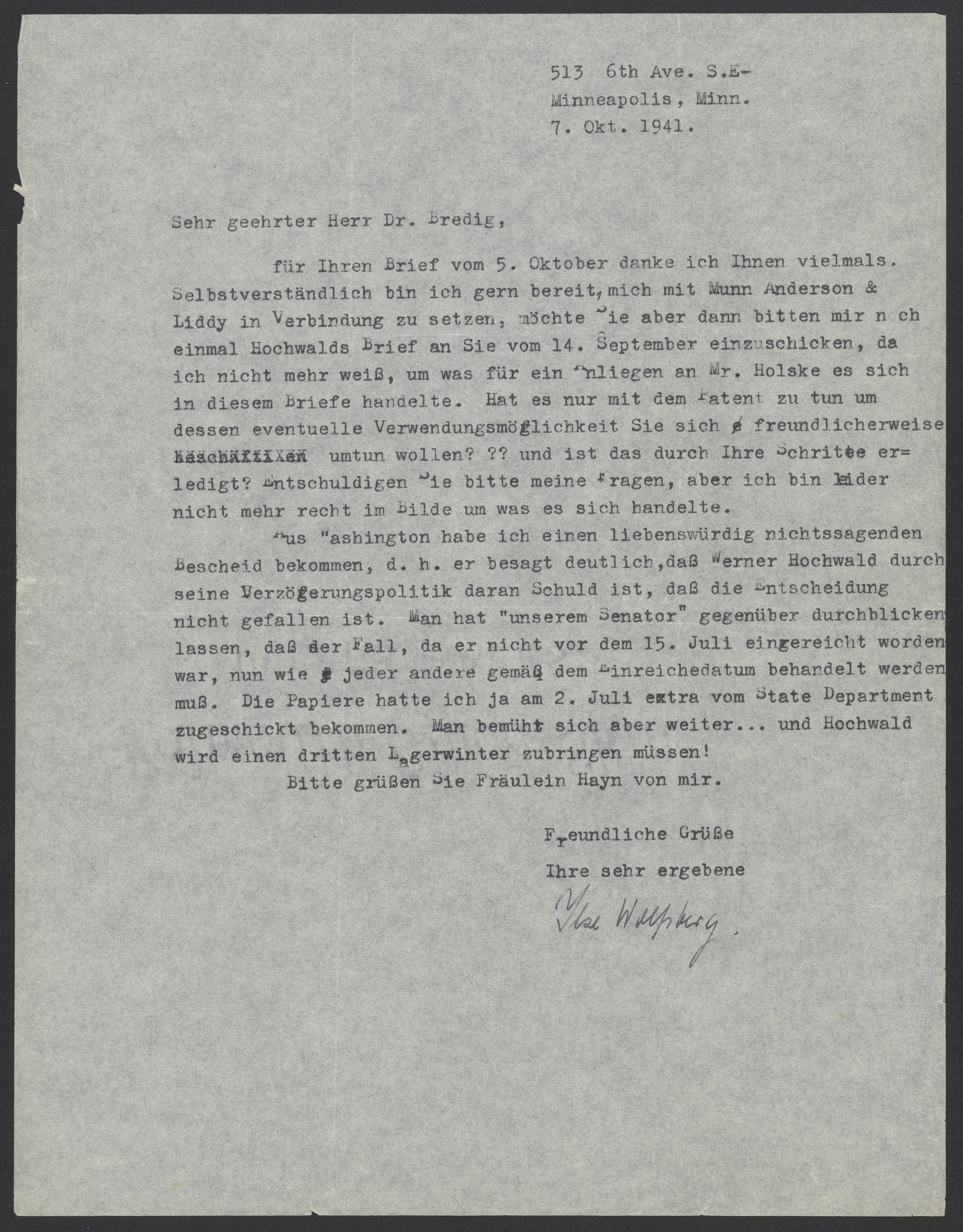für Ihren Brief vom 5. Oktober danke ich Ihnen vielmals. Selbstverständlich bin ich gern bereit, mich mit Munn Anderson & Liddy in Verbindung zu setzen; möchte Sie aber bitten, mich Hochwalds Brief an Sie vom 14. September einzuschicken, da ich nicht mehr weiß, um was für ein Anliegen an Mr. Holske es sich in diesem Briefe handelte. Hat es nur mit dem Patent zu tun um dessen eventuelle Verwendungsmöglichkeit Sie sich freundlicherweise umtun wollen?? Und ist das durch Ihre Schritte erledigt? Entschuldigen Sie bitte meine Fragen, aber ich bin leider nicht mehr recht im Bilde um was es sich handelte.