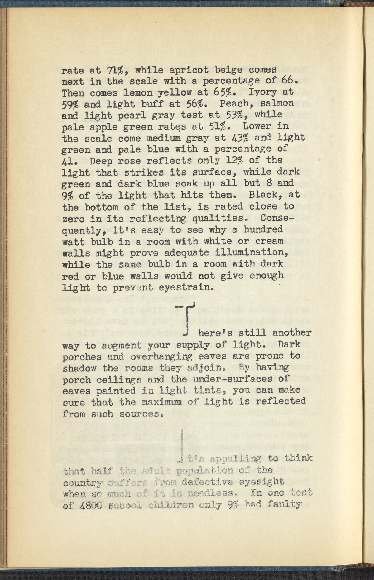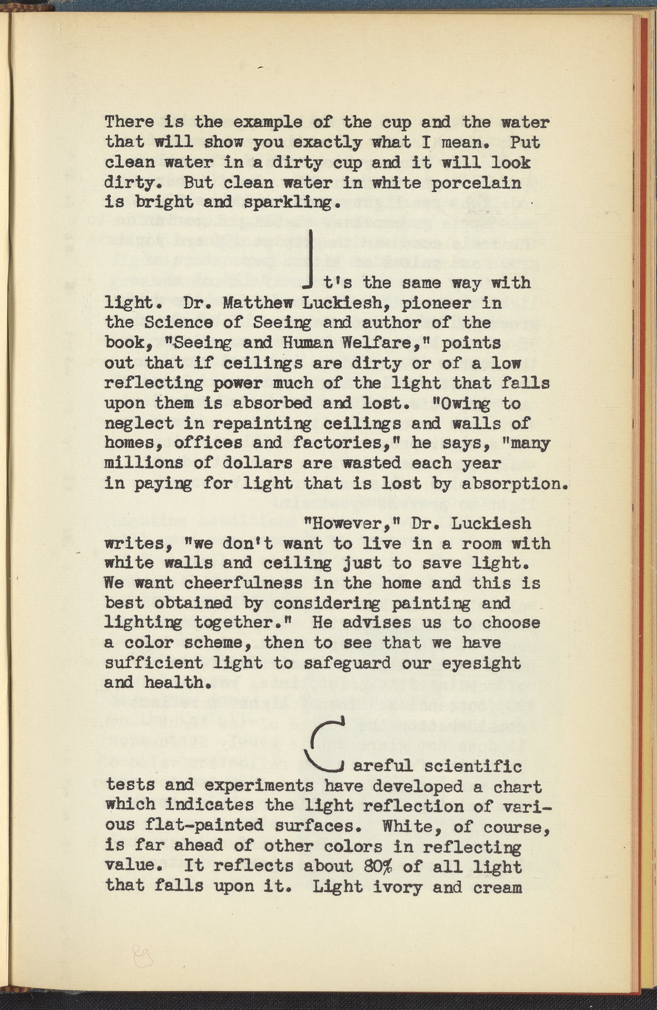 Booklet corresponding to a radio broadcast program created by the National Paint, Varnish, and Lacquer Association. The booklet describes how too much or too little light can be harmful to the eyes. Describes solutions for home lighting intended to soothe one's eyes. Encourages determining a gentle color scheme for one's home and using paint products that provide a balanced amount of light reflection. Includes small illustrations throughout and decorated covers.