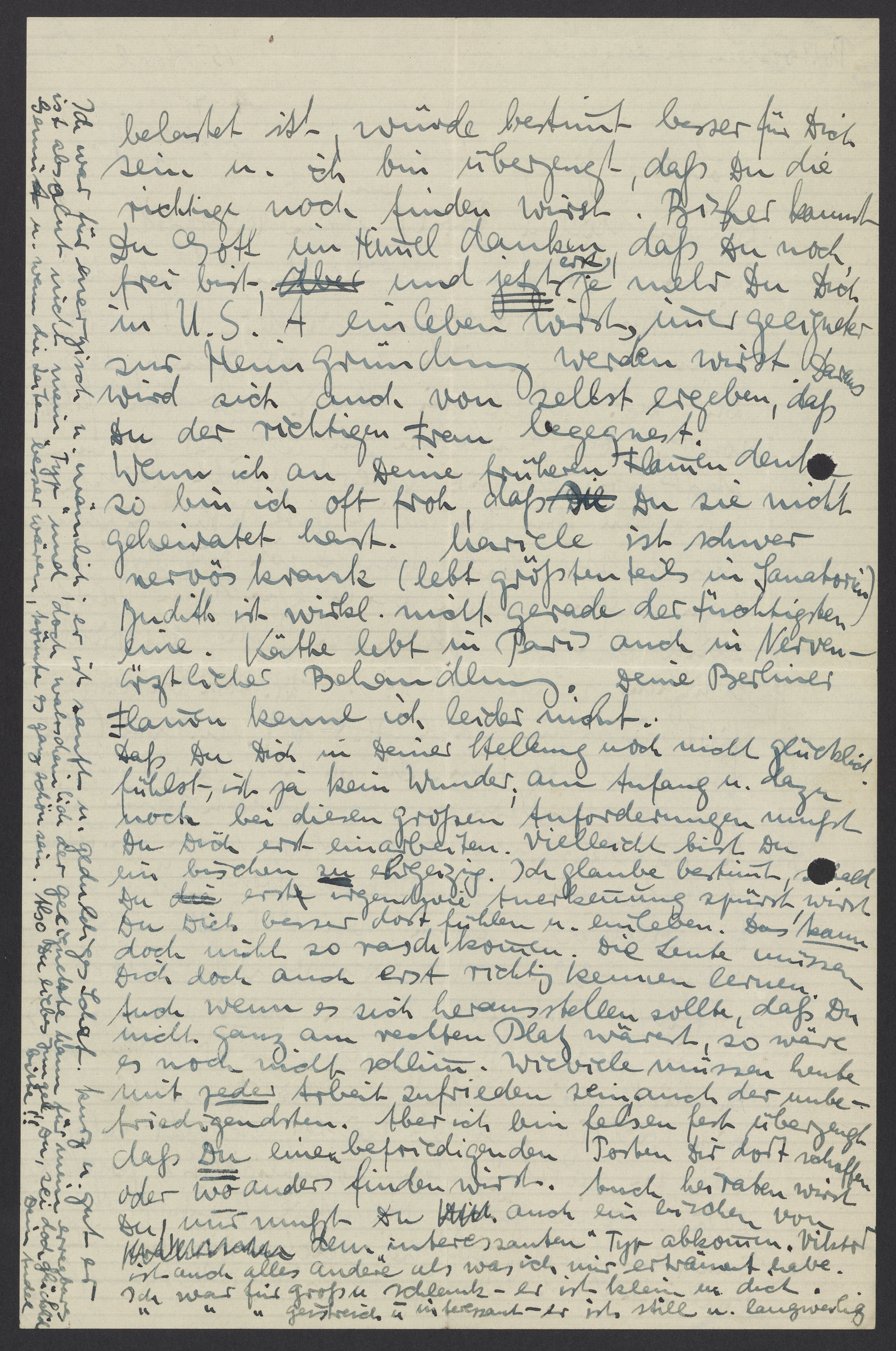 When I think of your former girlfriends, I'm often glad that you didn't marry them. Mariele is unbalanced (she mostly lives in a sanatorium). Judith isn’t really the most capable person. Käthe also lives in Paris and is being treated by a psychiatrist. Unfortunately, I don’t know any of your Berlin girlfriends.