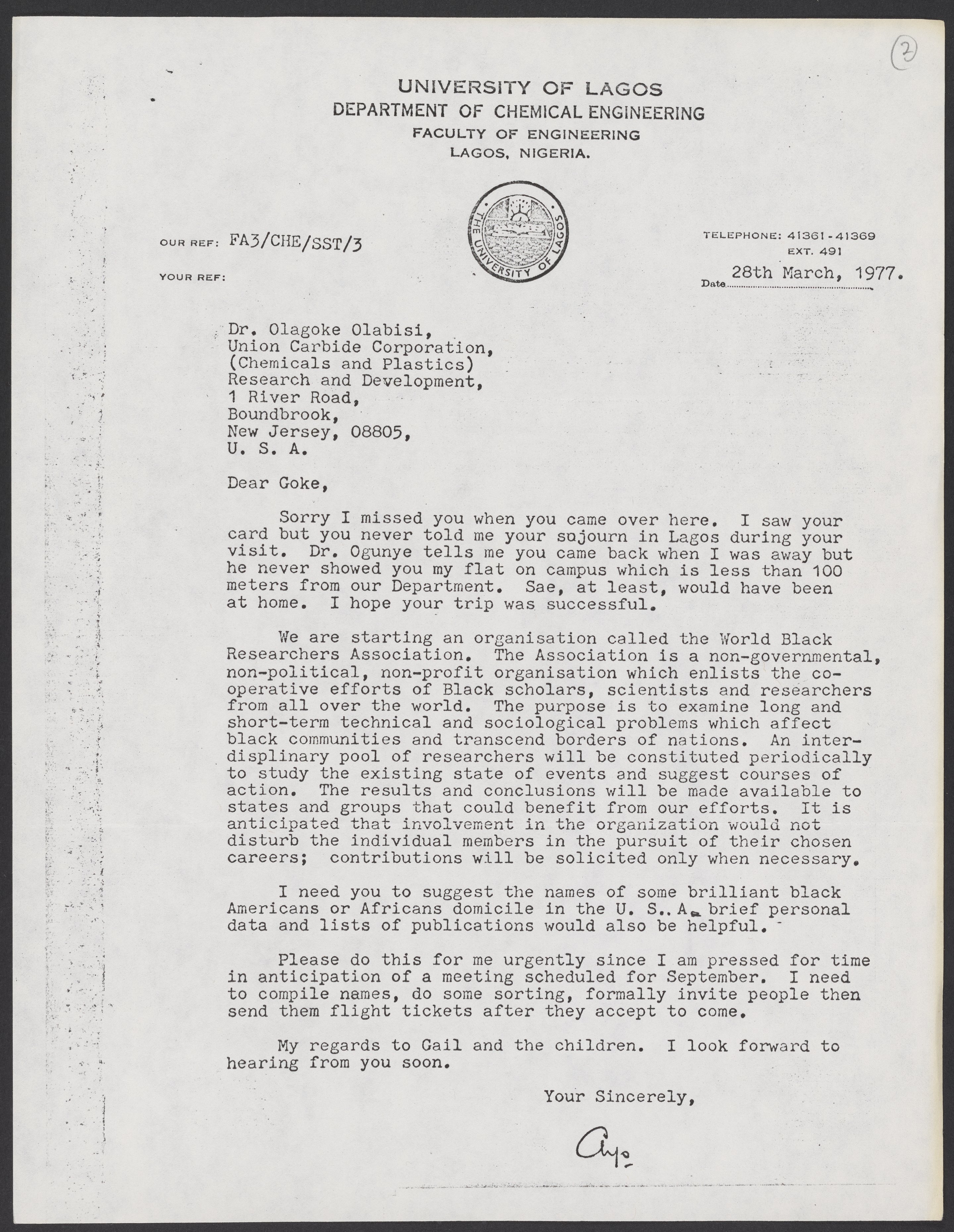 Letter from Ayodeji Jeje to Olagoke Olabisi (1943-) about starting the World Black Researchers Association (WBRA).