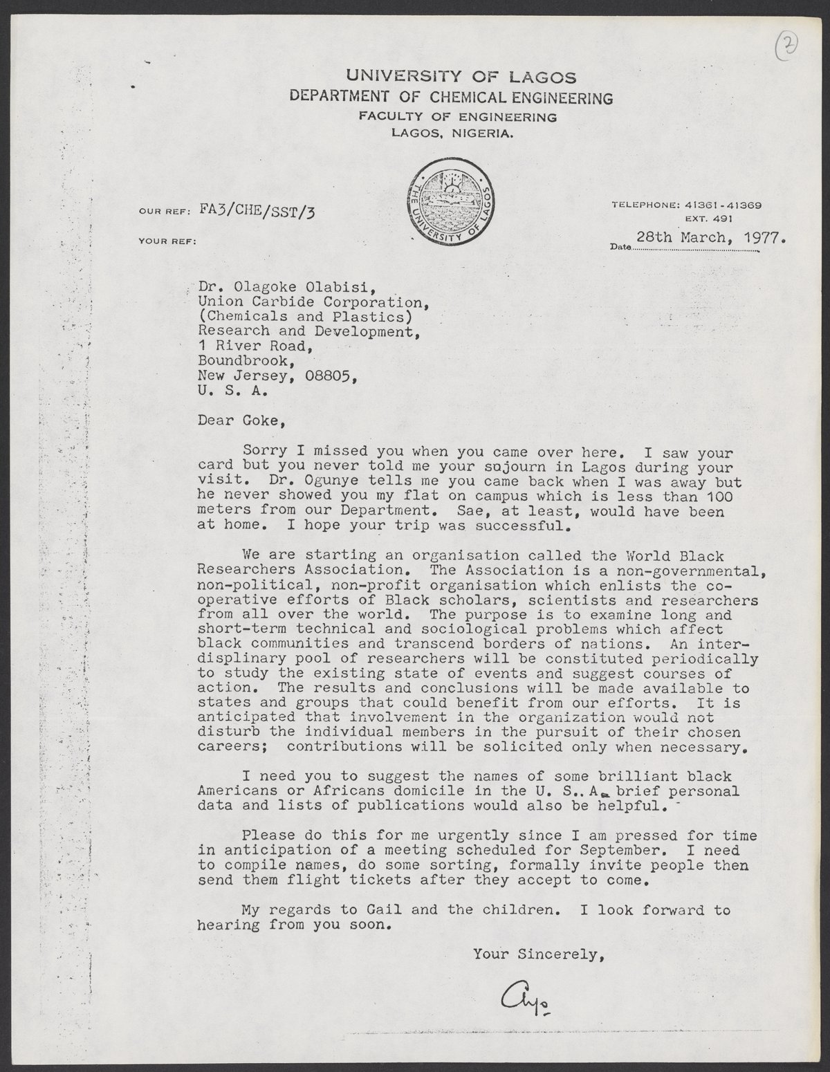 Jeje, Ayodeji. “Letter from Ayodeji Jeje to Olagoke Olabisi, March 28, 1977,” March 28, 1977. William A. Lester, Jr. Papers, Box 5, Folder 9. Science History Institute. Philadelphia. https://digital.sciencehistory.org/works/u6bycm8.