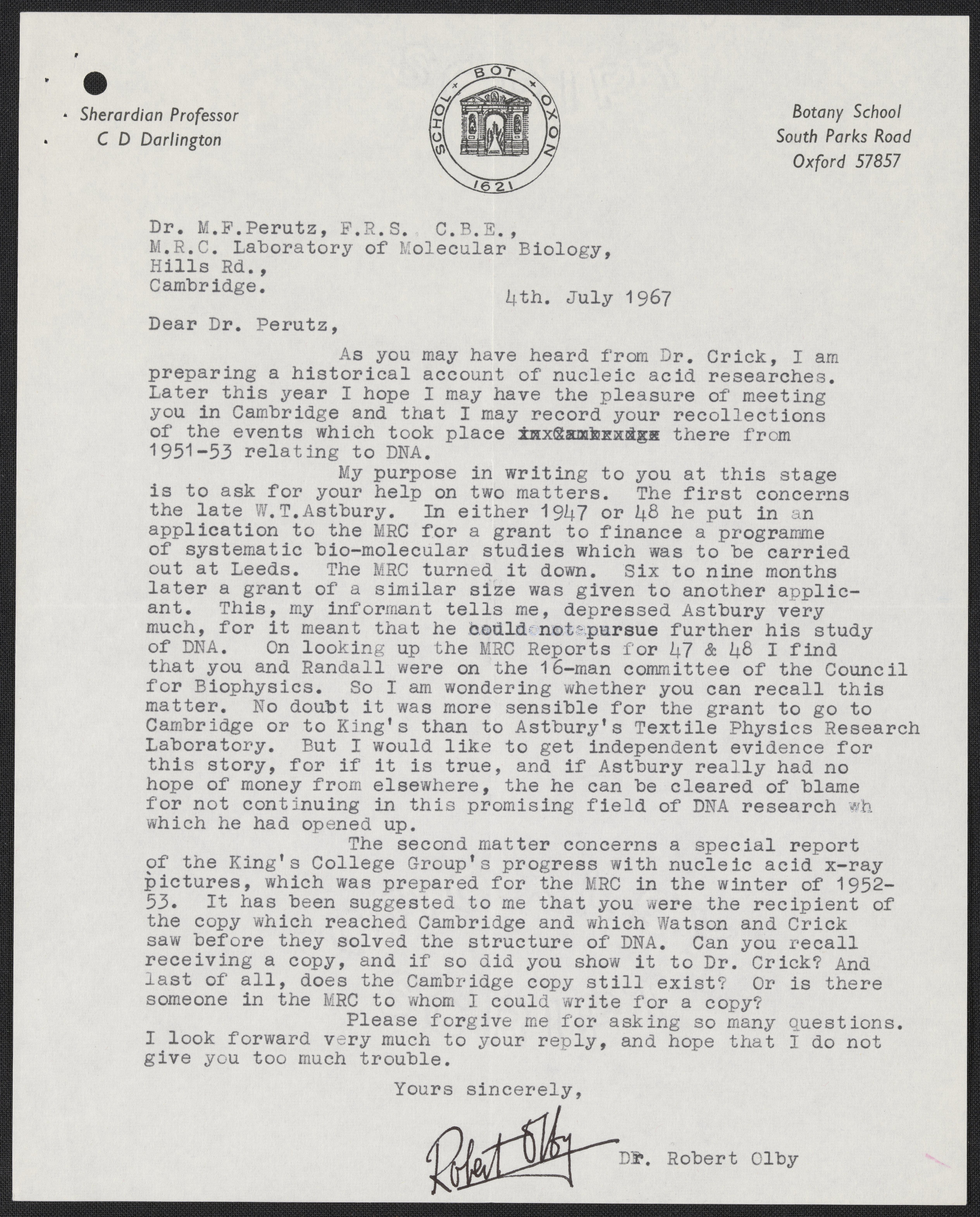 Letter from Robert Olby to Max Perutz, July 4, 1967