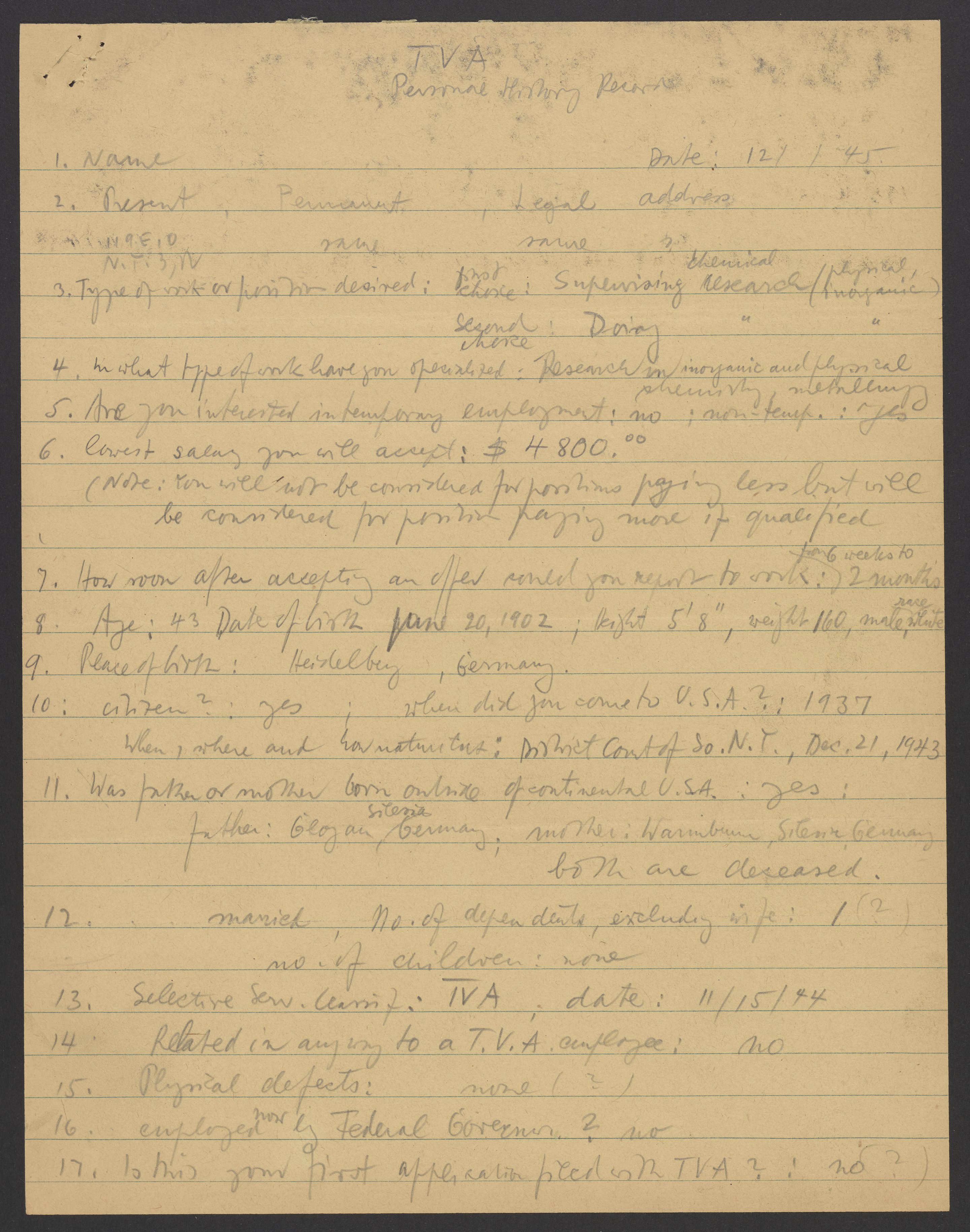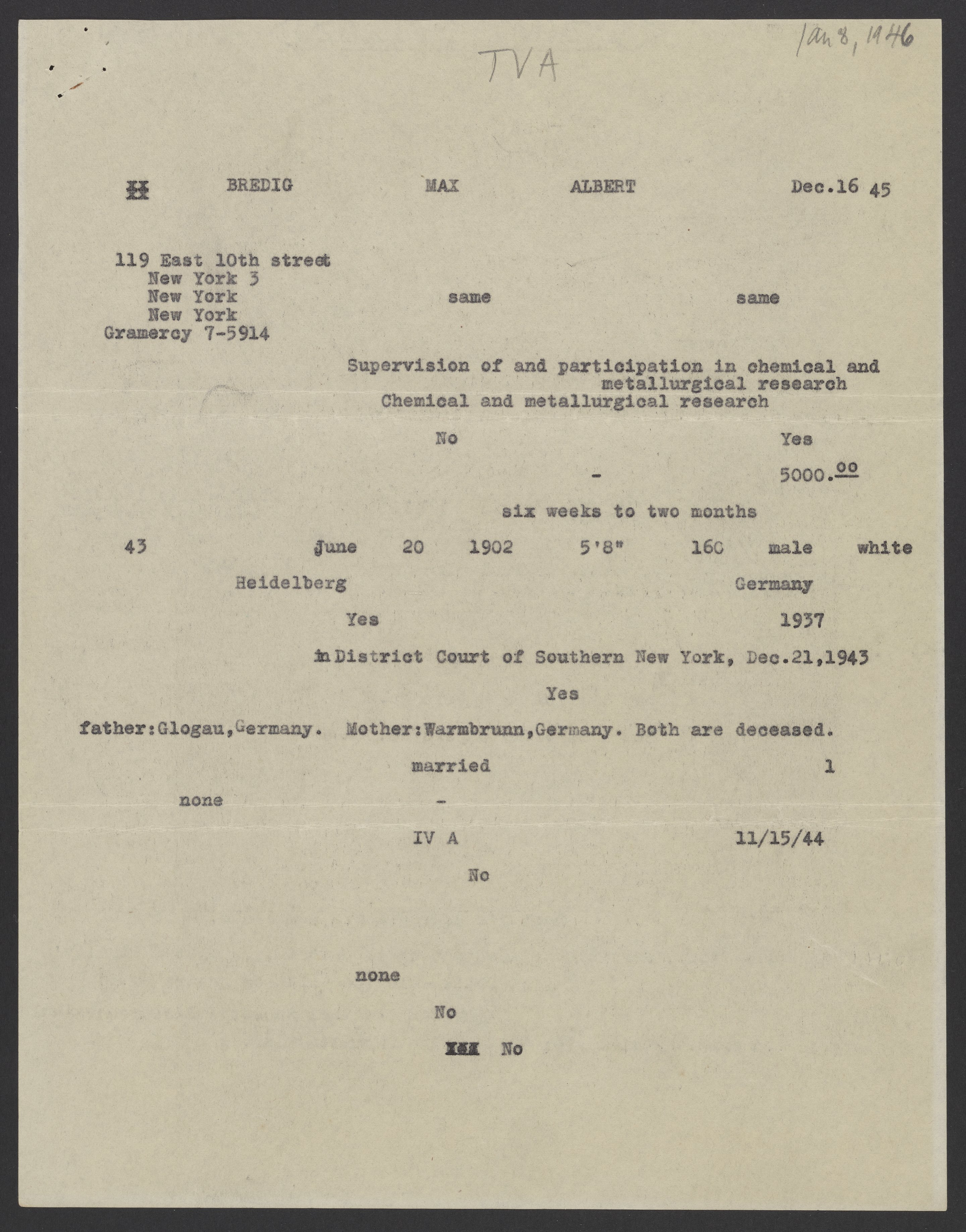 Bredig, Max Albert. “Notes about the Tennessee Valley Authority by Max Bredig,” circa 1945. Papers of Georg and Max Bredig, Box 10, Folder 34. Science History Institute. Philadelphia. https://digital.sciencehistory.org/works/u905qvb.