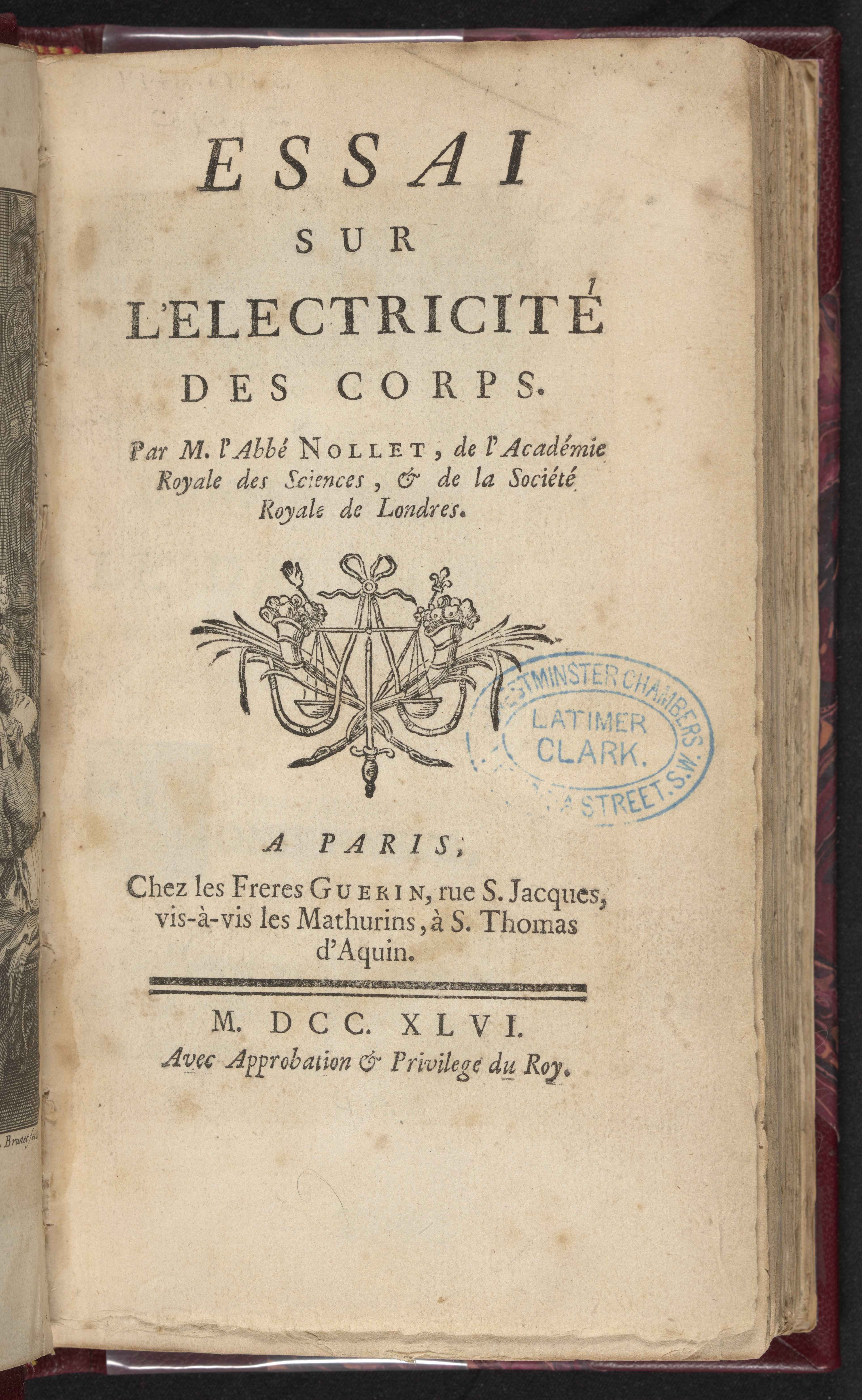 Nollet, abbé (Jean Antoine). Essai Sur l'Electricité Des Corps. Paris, France, 1746. https://digital.sciencehistory.org/works/ub8q81b.