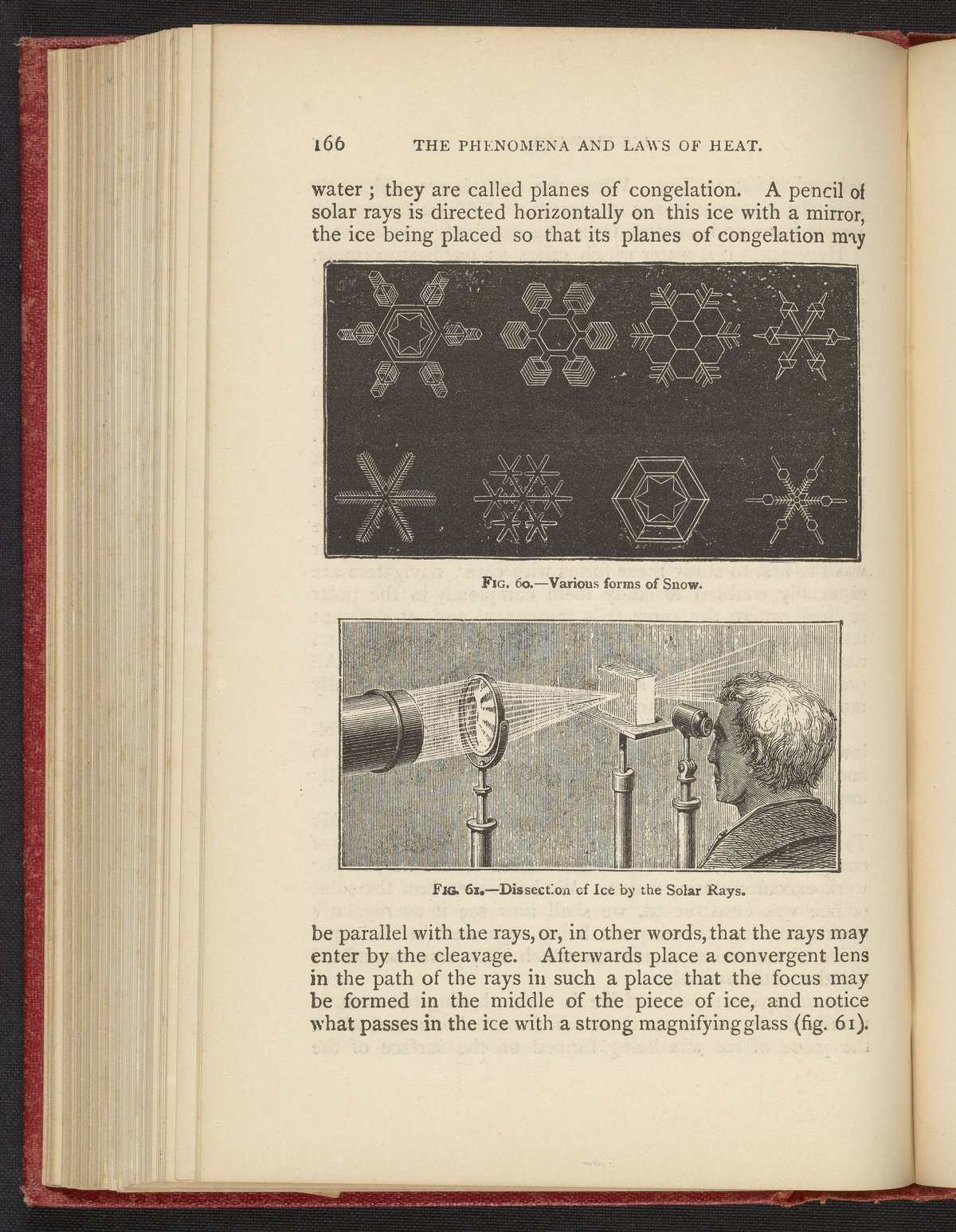 Two illustrations from page 166 of the 1869 volume The Phenomena and Laws of Heat by Achille Cazin. Figure 60 depicts a magnified view of various forms of snow. Figure 61 depicts the dissection of ice by solar rays.