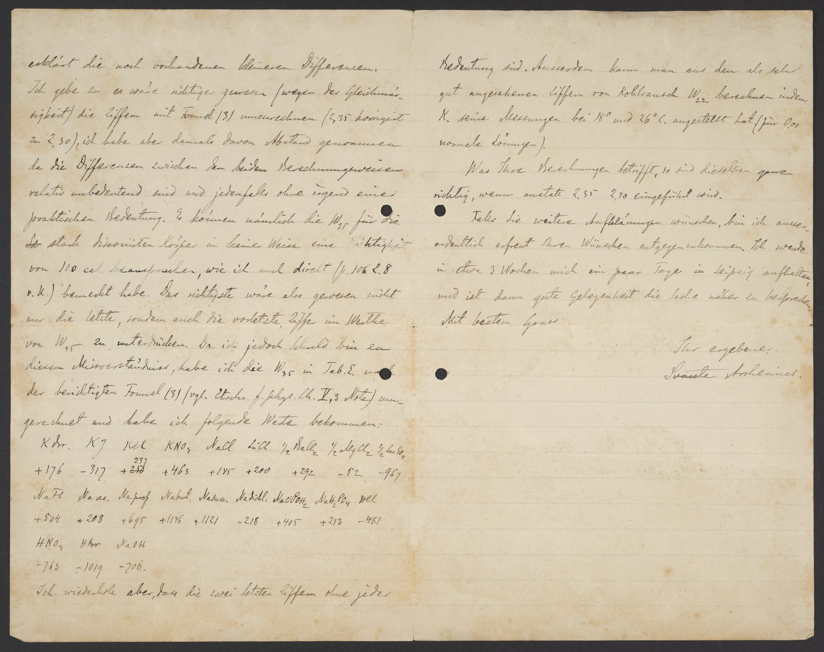 erklärt die noch vorhandenen kleinen Differenzen. Ich gebe zu es wäre wichtiger gewesen (wegen der Gleichmässigkeit) die Ziffern mit Formel (3) umzurechnen (2,35 korrigiert zu 2,30). Ich habe aber damals davon Abstand genommen, da die Differenzen zwischen den beiden Berechnungsweisen relativ unbedeutend sind und jedenfalls ohne irgend einer praktischen Bedeutung. Es können nämlich die W35 für die stark dissoziierten Körper in kleiner Weise eine Richtigkeit von 110 cal. beanspruchen, wie ich auch direkt (p. 106 2.8 v.k.) bemerkt habe. Das richtigste wäre also gewesen nicht nur die letzte, sondern auch die vorletzte Ziffer im Werte von W35 zu unterschieden. Da ich jedoch Schuld bin zu diesem Missverständnis, habe ich die W35 in Tab. E und die berichtigten Formel (3) (vgl. Zeitschrift für physikalische Chemie. V, 3 Note) umgerechnet und habe ich folgende Werte bekommen: