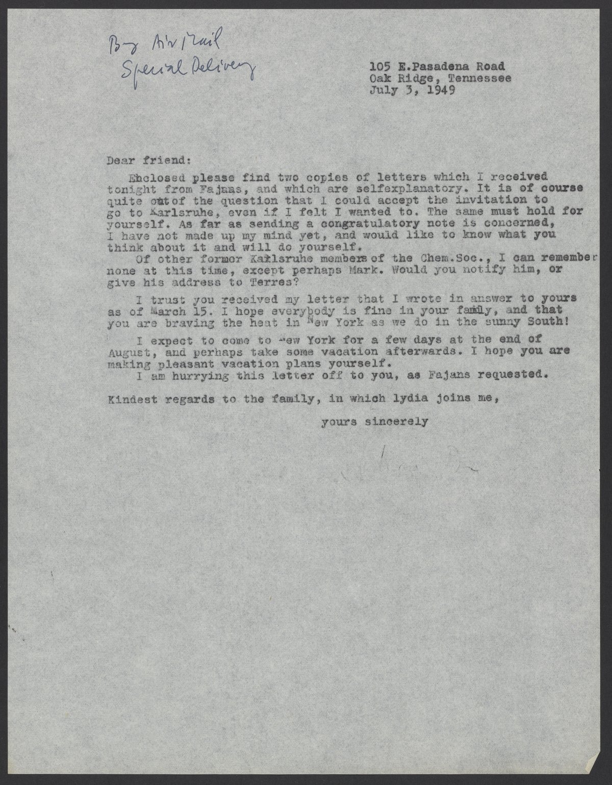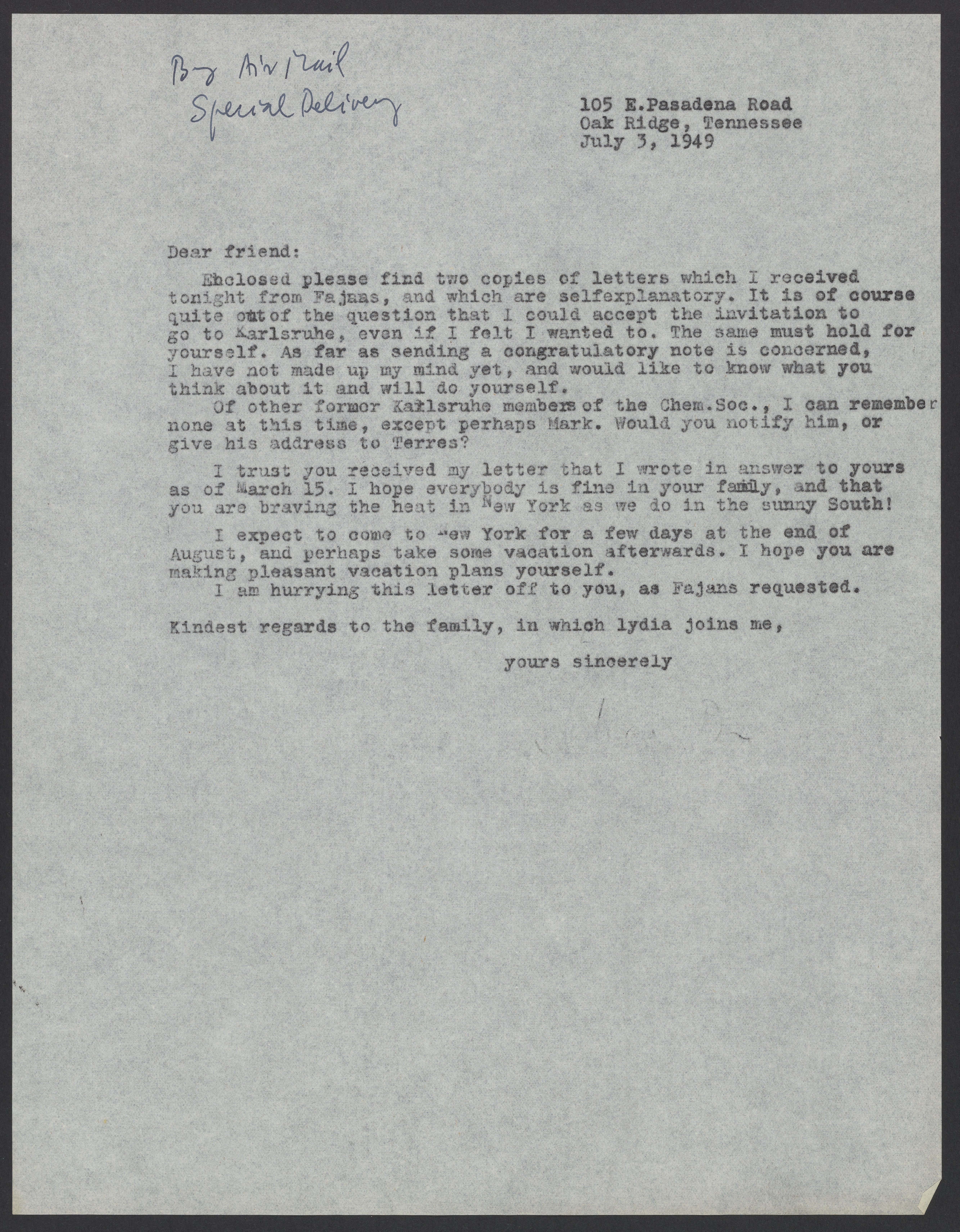 Max Bredig (1902-1977) forwards two letters from Kasimir Fajans (1887-1975) to Paul Mangold, and declines a visit to Karlsruhe, Germany.