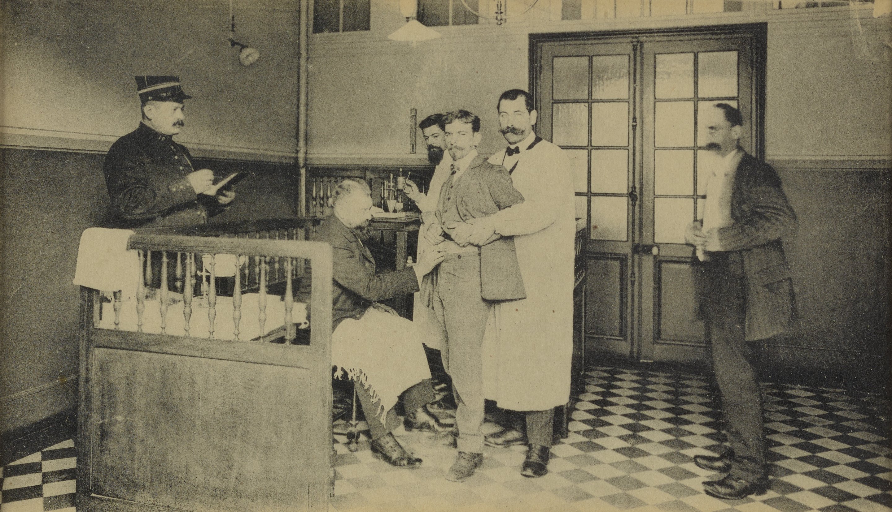 Interior photograph depicts a man standing next to a laboratory table with a man standing behind the subject holding what appears to be a needle or a medical device. Another man stands behind the subject holding up his shirt and vest as a seated man pulls at the man's pants to prepare the injection site. An onlooker in a uniform holds open a log book.