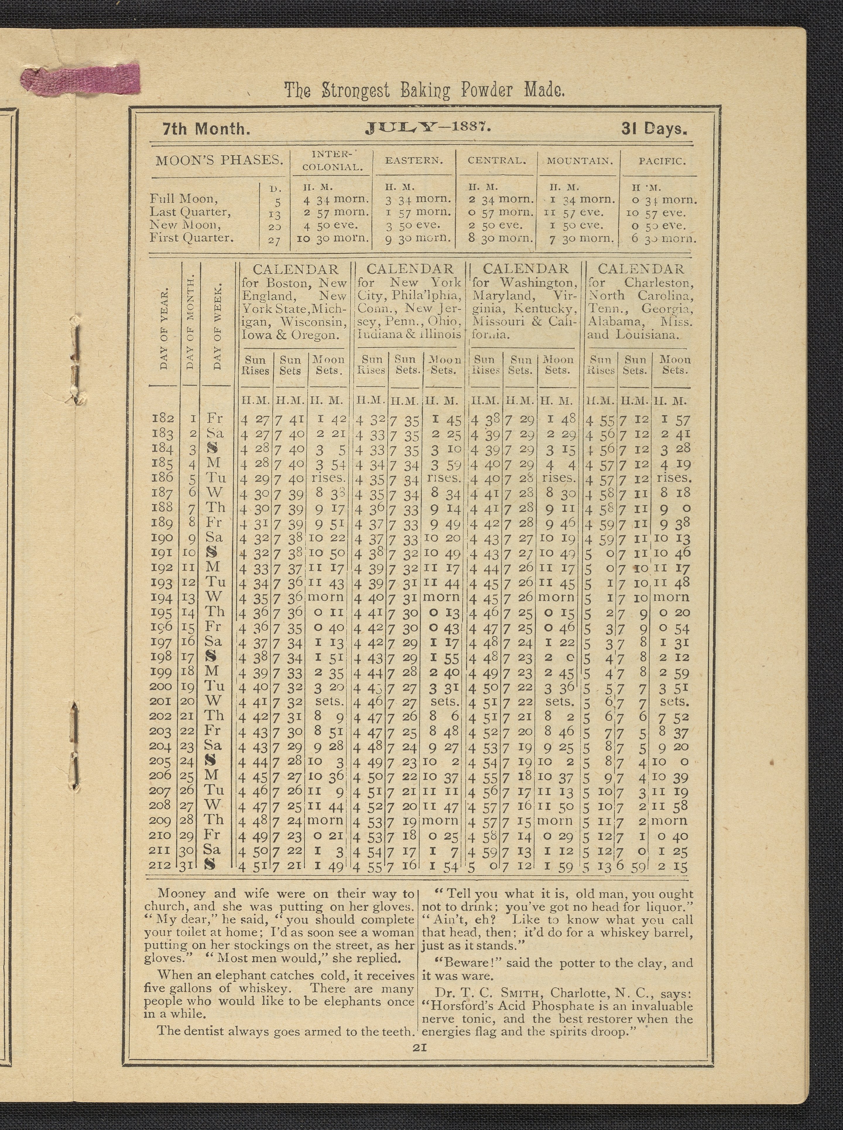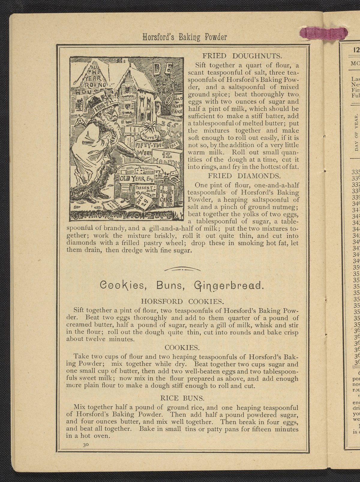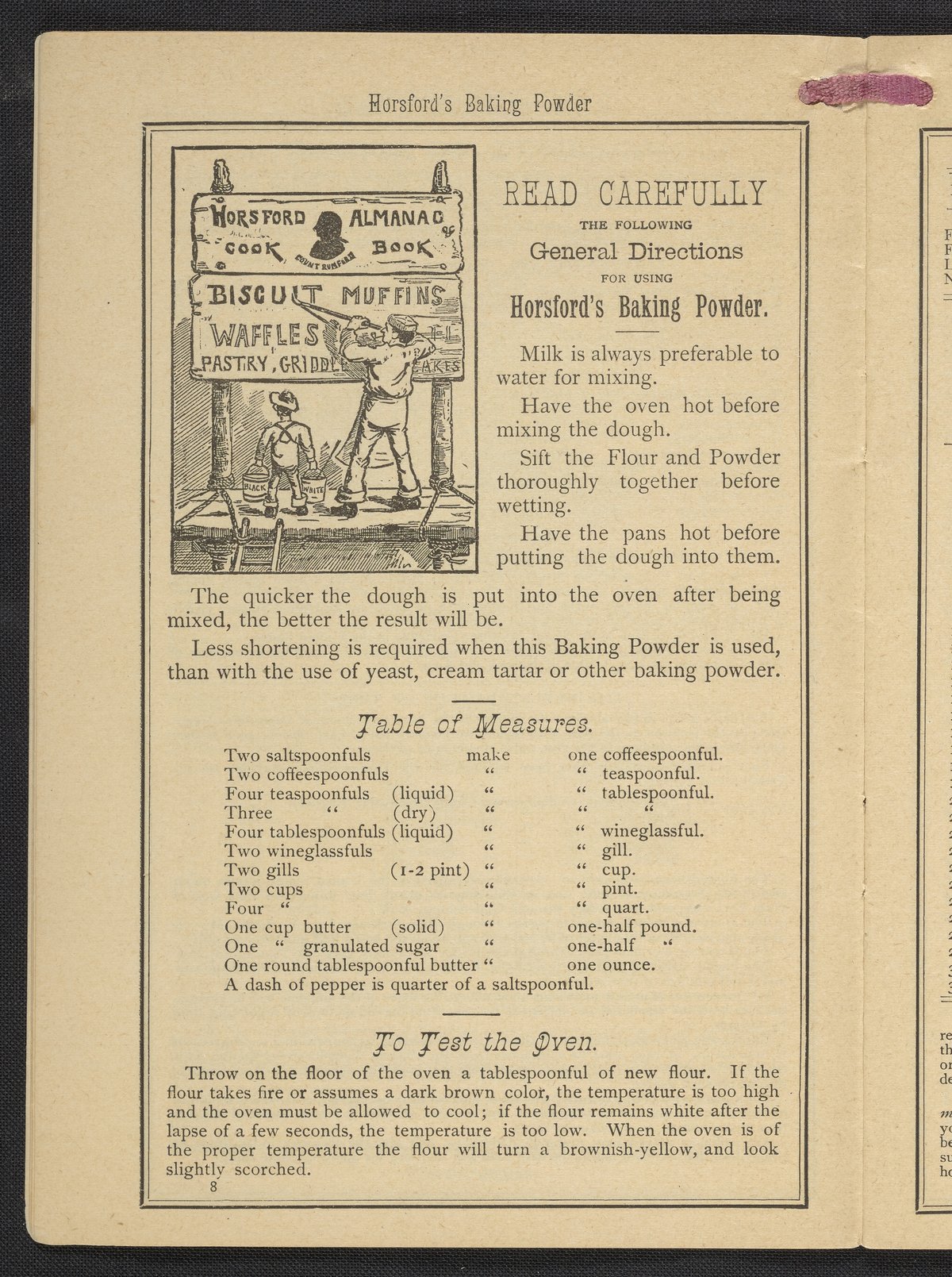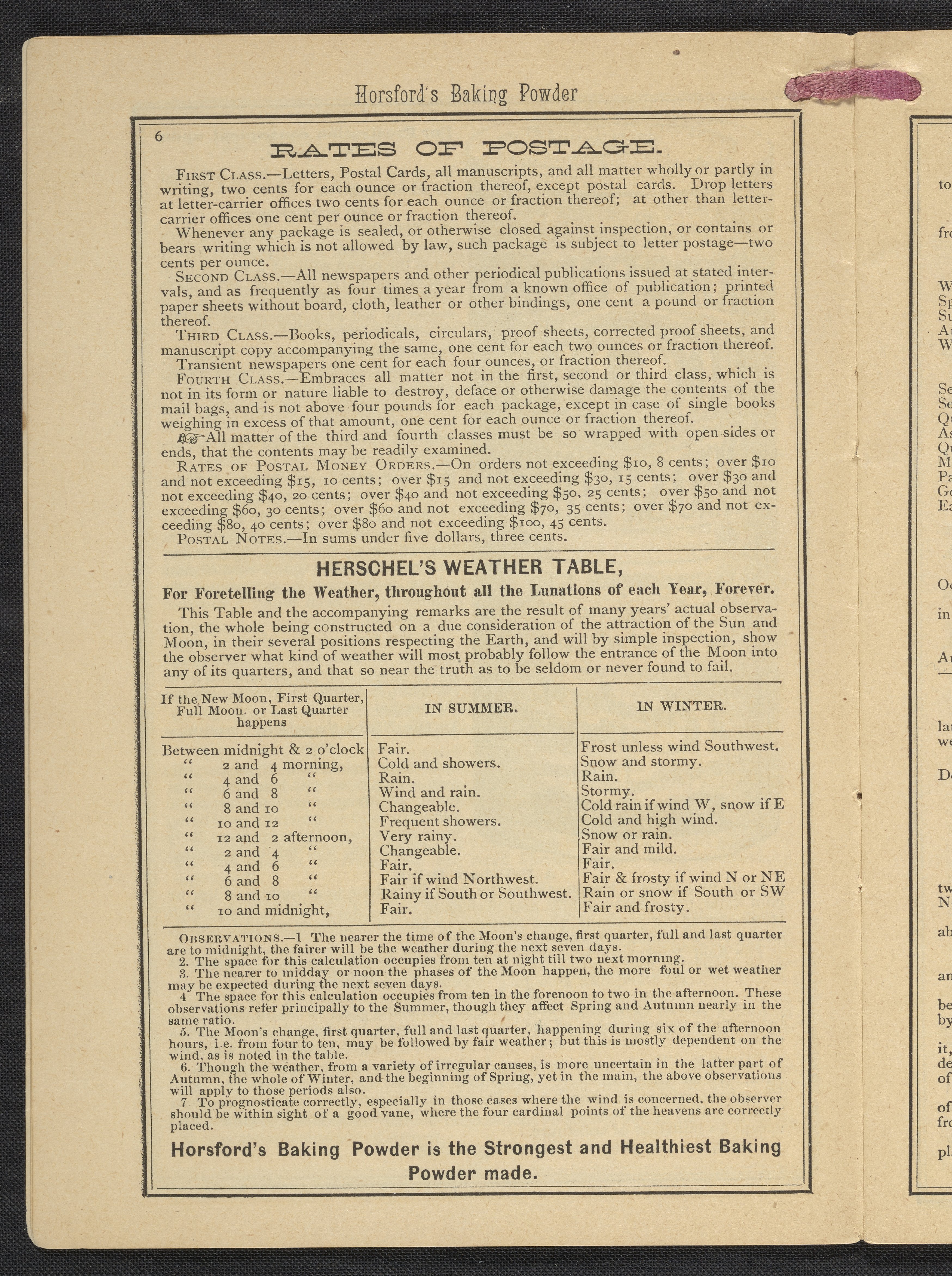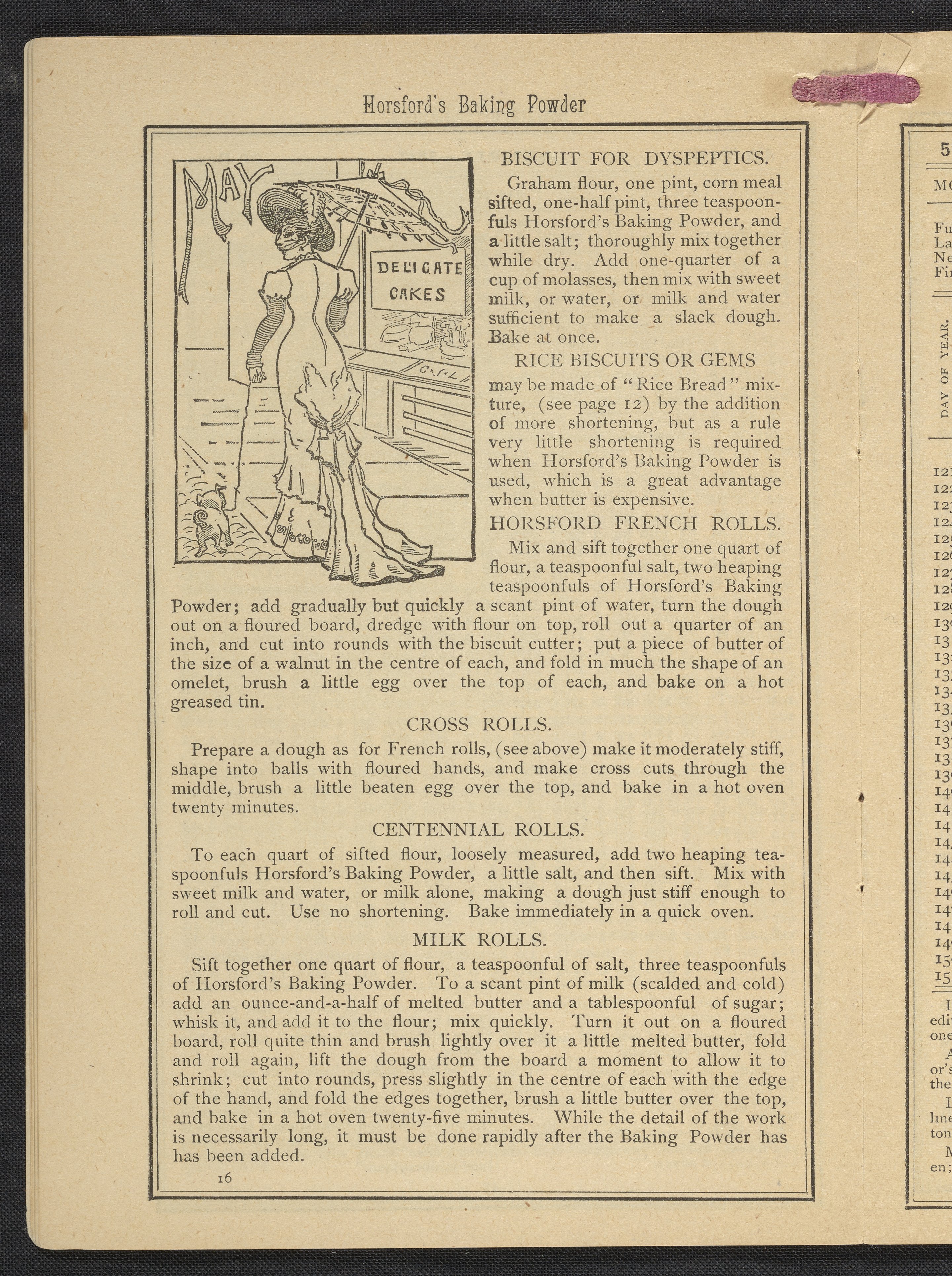Small JPG1200 x 1669px — 634 KBLarge JPG2880 x 4005px — 3.2 MBFull-sized JPG3483 x 4843px — 4.4 MBOriginal fileTIFF — 3483 x 4843px — 48.3 MBPublished by Rumford Chemical Works, this almanac features advertisements for Professor Horsford's baking powder and acid phosphate along with other products manufactured by Rumford Chemical Works. Also includes "Herschel's Weather Table" for predicting the weather. Each month features recipes and/or household hints along with seasonal illustrations focusing on farming, baking, gathering fruit and baked goods.