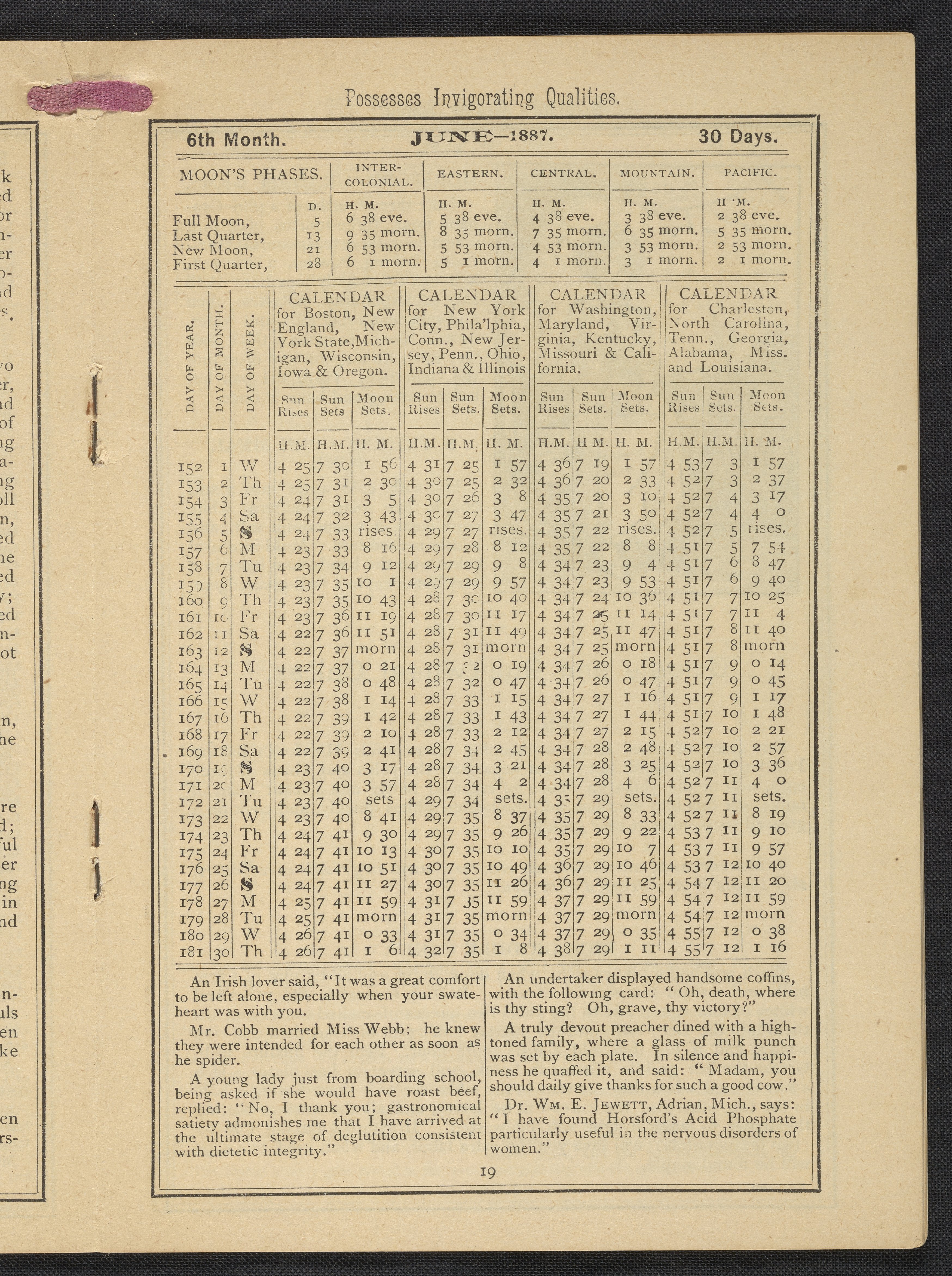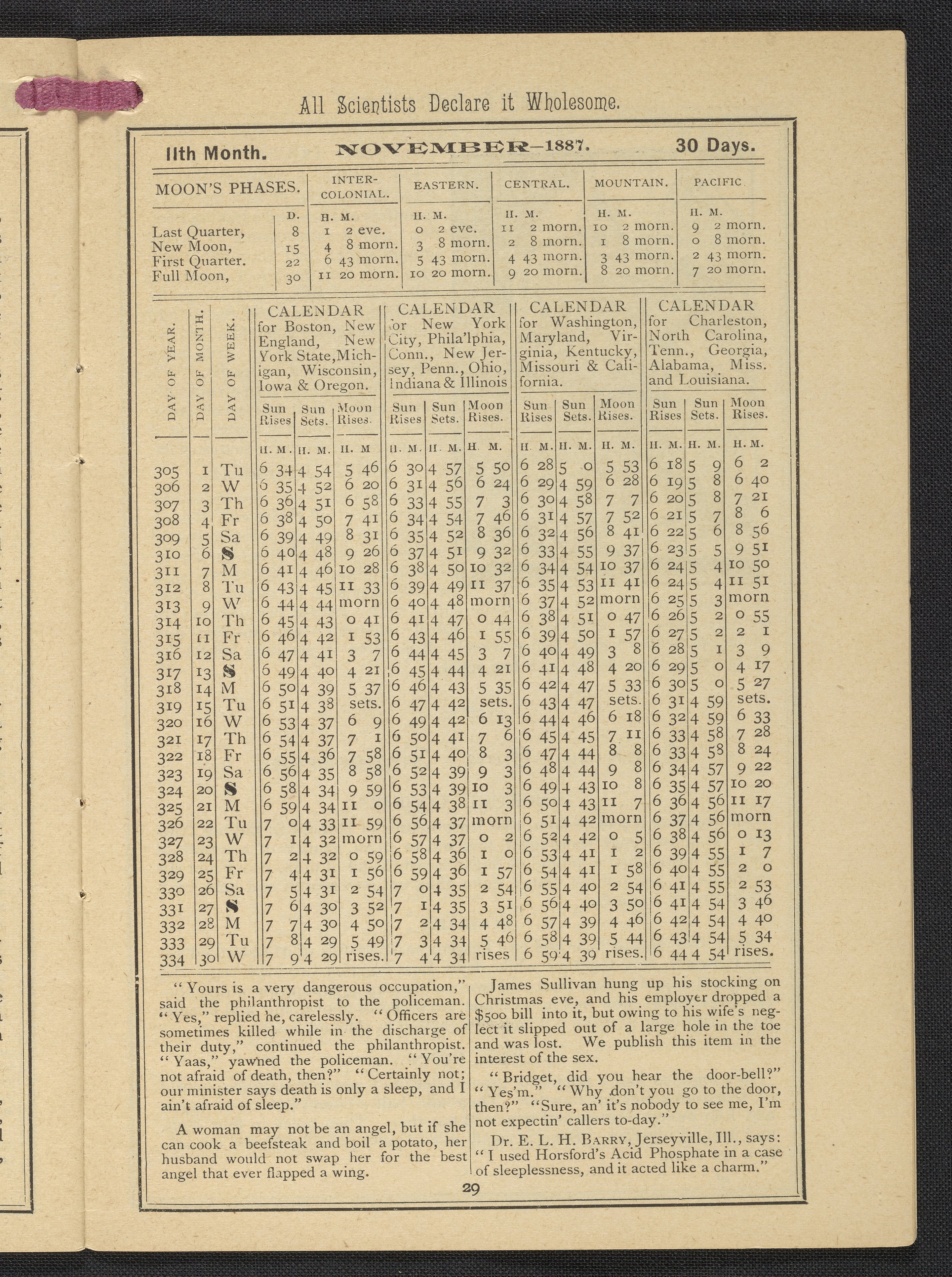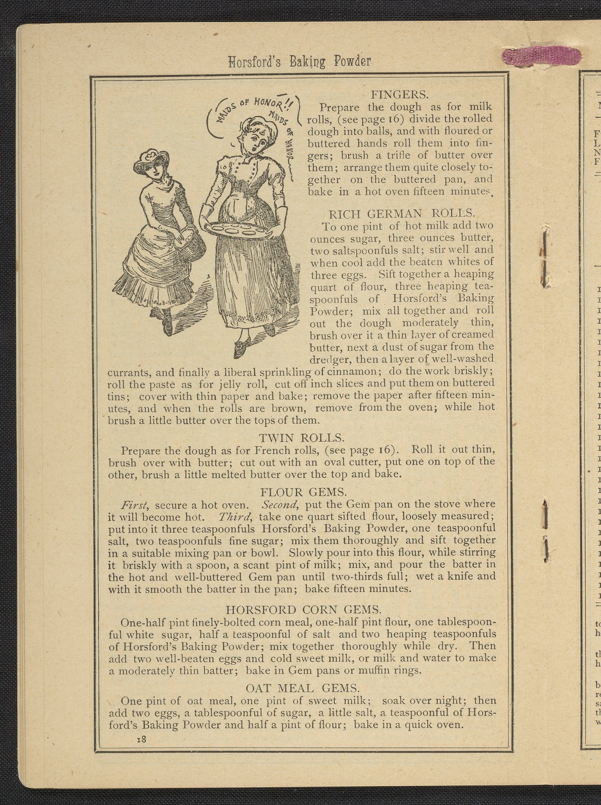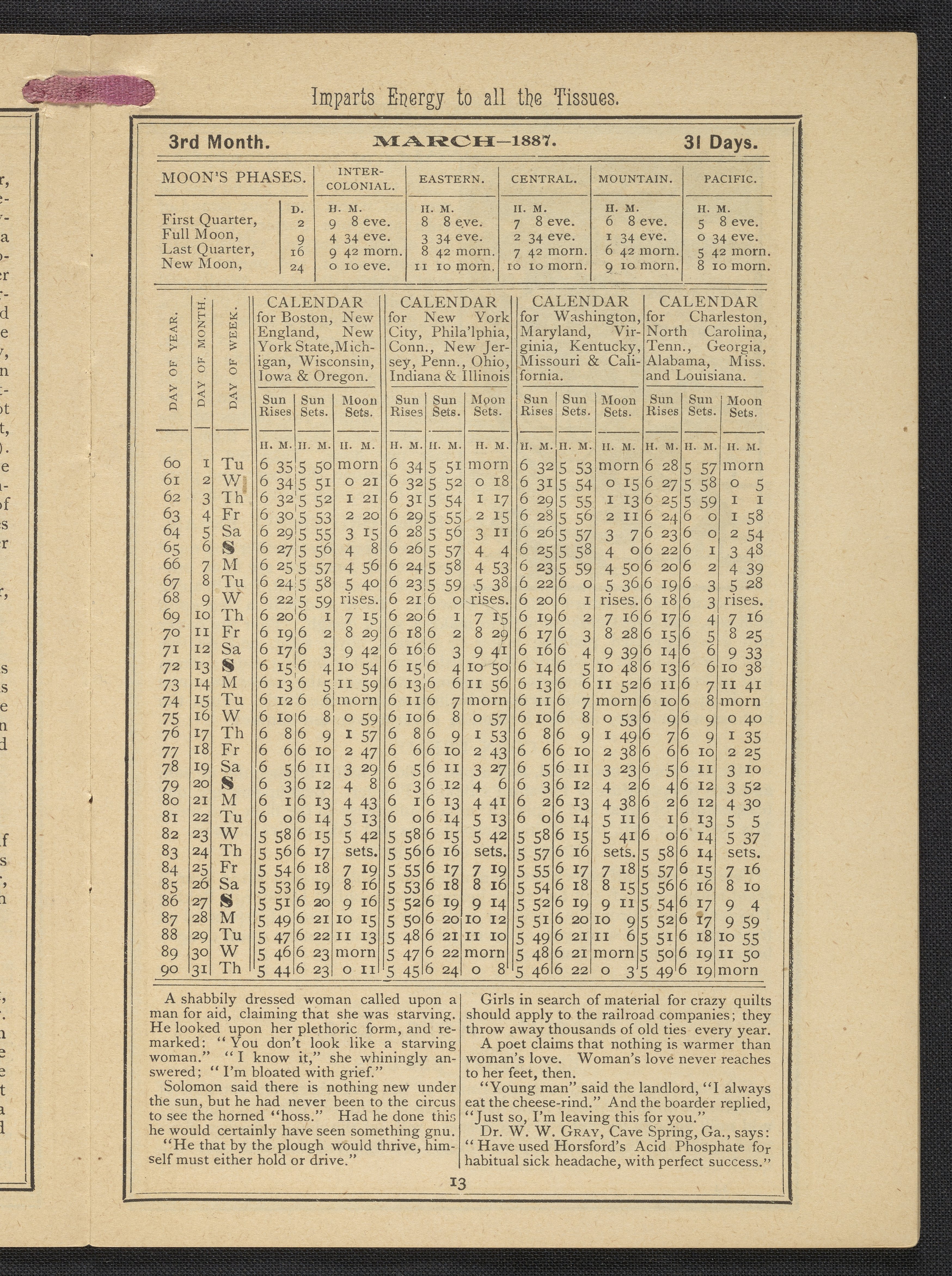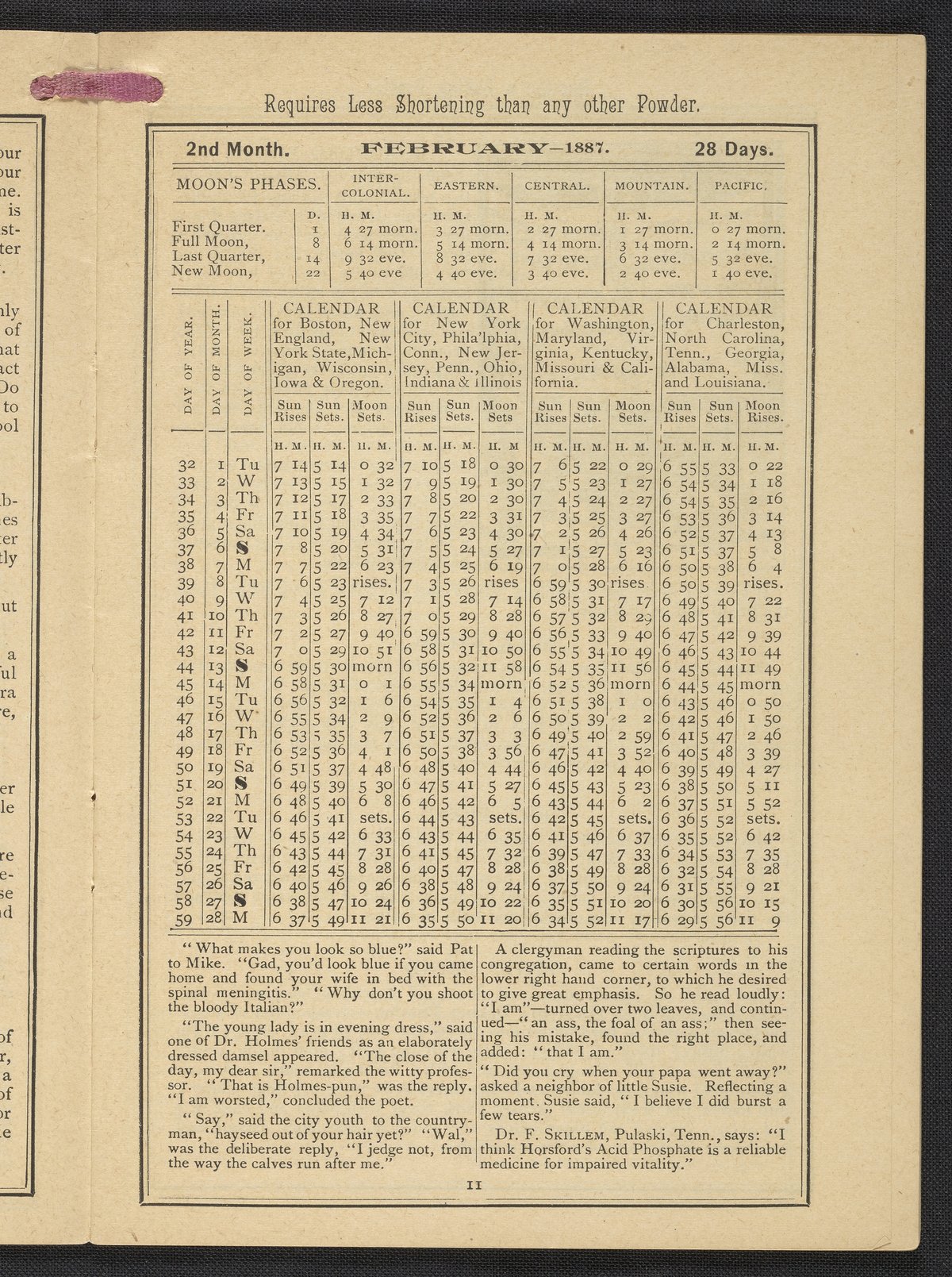Small JPG1200 x 1669px — 634 KBLarge JPG2880 x 4005px — 3.2 MBFull-sized JPG3483 x 4843px — 4.4 MBOriginal fileTIFF — 3483 x 4843px — 48.3 MBPublished by Rumford Chemical Works, this almanac features advertisements for Professor Horsford's baking powder and acid phosphate along with other products manufactured by Rumford Chemical Works. Also includes "Herschel's Weather Table" for predicting the weather. Each month features recipes and/or household hints along with seasonal illustrations focusing on farming, baking, gathering fruit and baked goods.