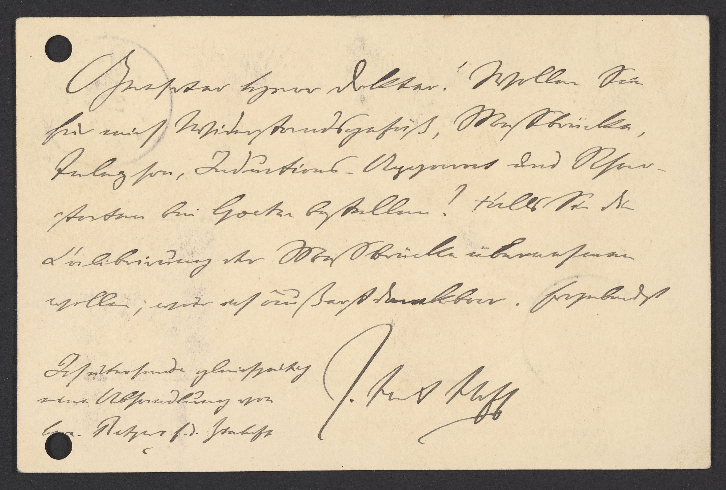 Geehrter Herr Doktor! Wollen Sie für mich Widerstandsgefäß, Meßbrücke, Telephon, Induktions-Apparat und Rheostaten bei Goetze bestellen? Falls Sie die Kalibrierung der Meßbrücke übernehmen wollen, wäre ich äußerst dankbar. Herzlichst