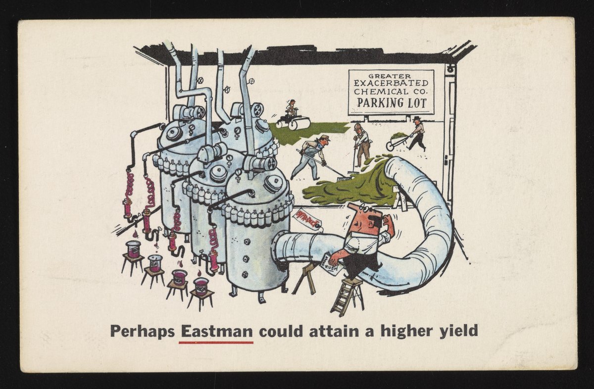 Front and back of an illustrated color postcard advertising the products and services of the Eastman Organic Chemicals Department (Division of the Eastman Kodak Company). The postcard features a humorous depiction of "Exacerbated Chemical Company" employees using a complicated scientific apparatus to brew their own chemicals. Postmarked from Rochester, New York, the postcard also includes a brief summary of the products and services of Eastman’s Distillation Products Industries division.