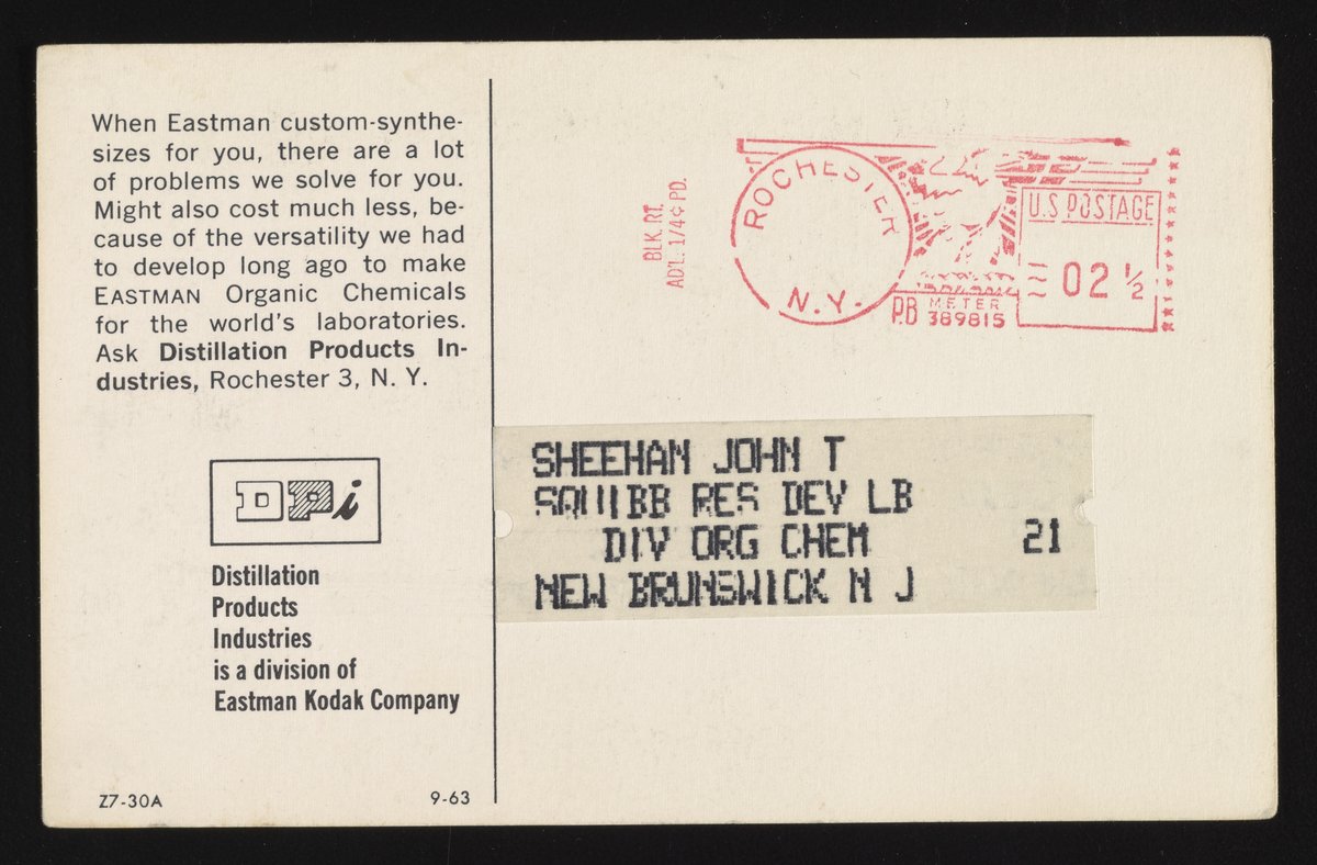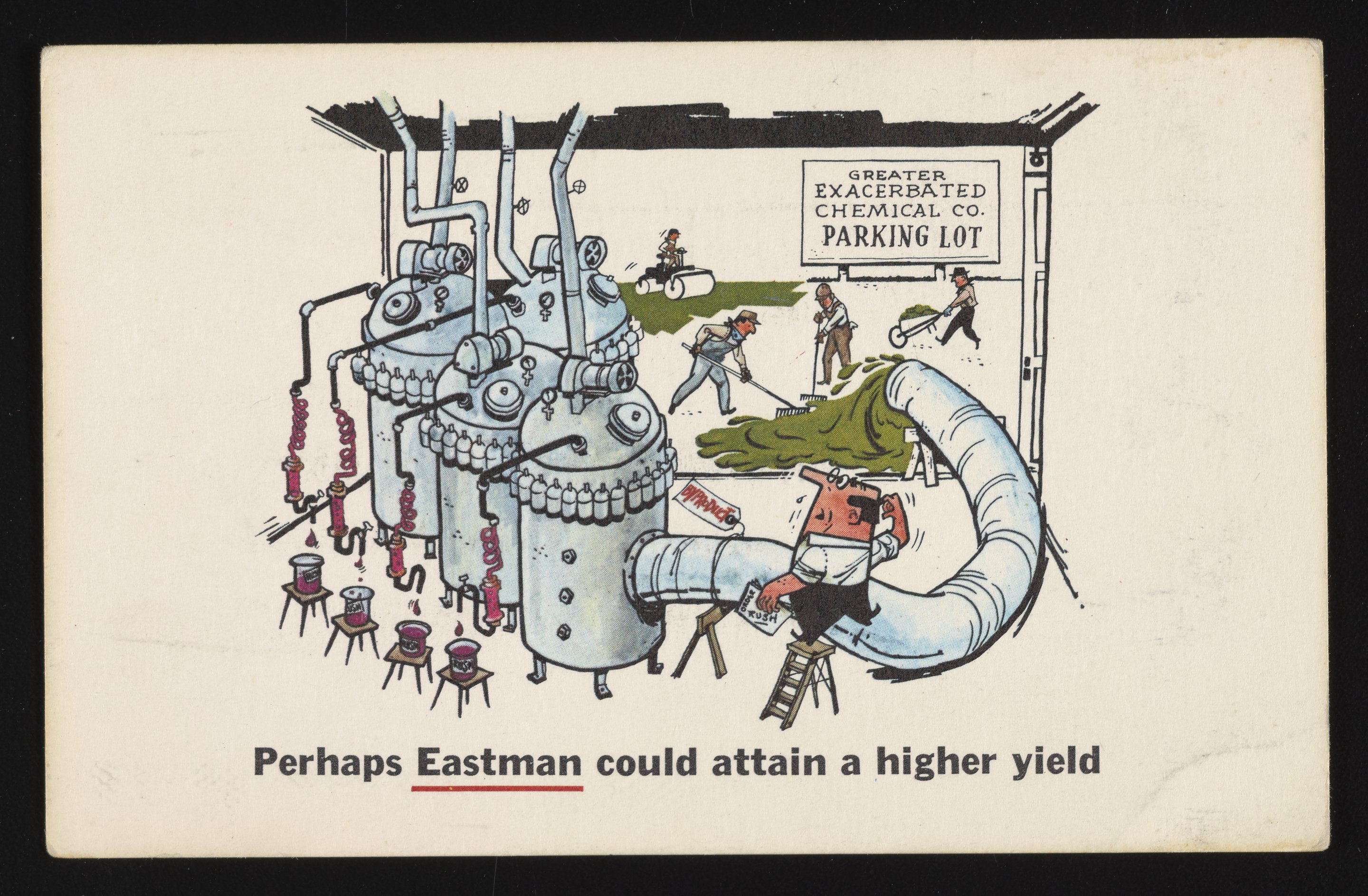 Front and back of an illustrated color postcard advertising the products and services of the Eastman Organic Chemicals Department (Division of the Eastman Kodak Company). The postcard features a humorous depiction of "Exacerbated Chemical Company" employees using a complicated scientific apparatus to brew their own chemicals. Postmarked from Rochester, New York, the postcard also includes a brief summary of the products and services of Eastman’s Distillation Products Industries division.