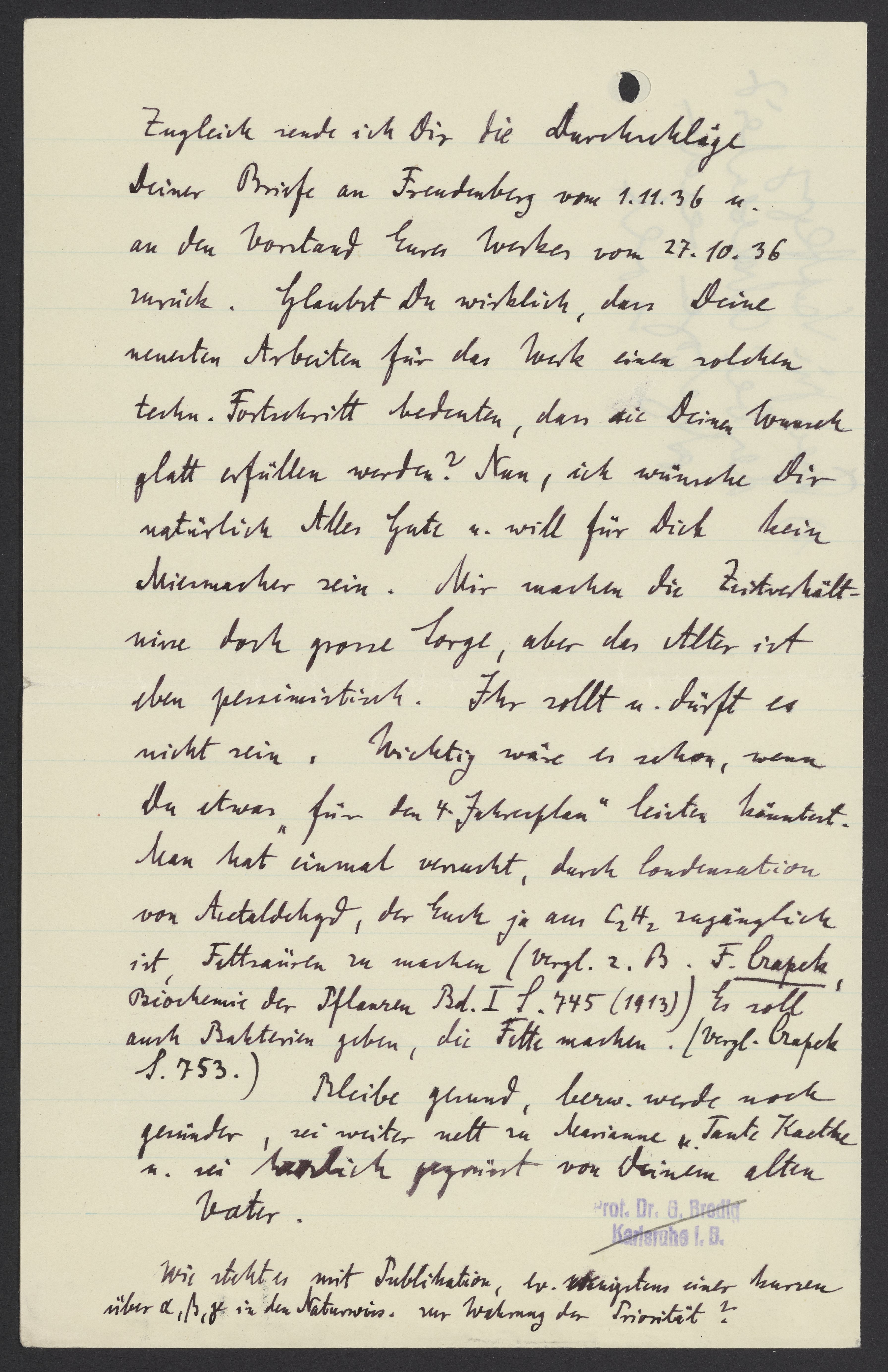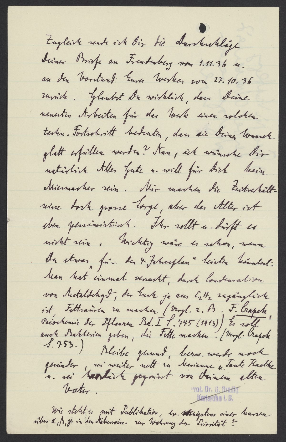 Zugleich sende ich Dir die Durchläge Deiner Briefe an Freudenberg vom 1.11.36 u. an den Vorstand Eures Werkes vom 27.10.36 zurück. Glaubst Du wirklich, dass Deine neuesten Arbeiten für das Werk einen solchen techn. Fortschritt bedeuten, dass die Deinen Wunsch glatt erfüllen werden? Nun, ich wünsche Dir natürlich Alles Gute u. will für Dich kein Miesmacher sein. Mir machen die Zeitverhältnisse doch grosse Sorge, aber das Alter ist, eben pessimistisch. Ihr sollt u. dürft es nicht sein, Wichtig wäre es schon, wenn Du etwas „für den 4 Jahresplan“ leisten könntest. Man hat einmal versucht, durch Condensation von Acetaldehyd, der Euch ja am C2H2 zugänglich ist, Fettsäuren zu machen (Vergl. z.B. F. Czapek, Biochemie der Pflanzen Bd. I S. 745 (1913)) Es soll auch Bakterien geben, die Fette machen. [Vergl. Czapek S. 753.]