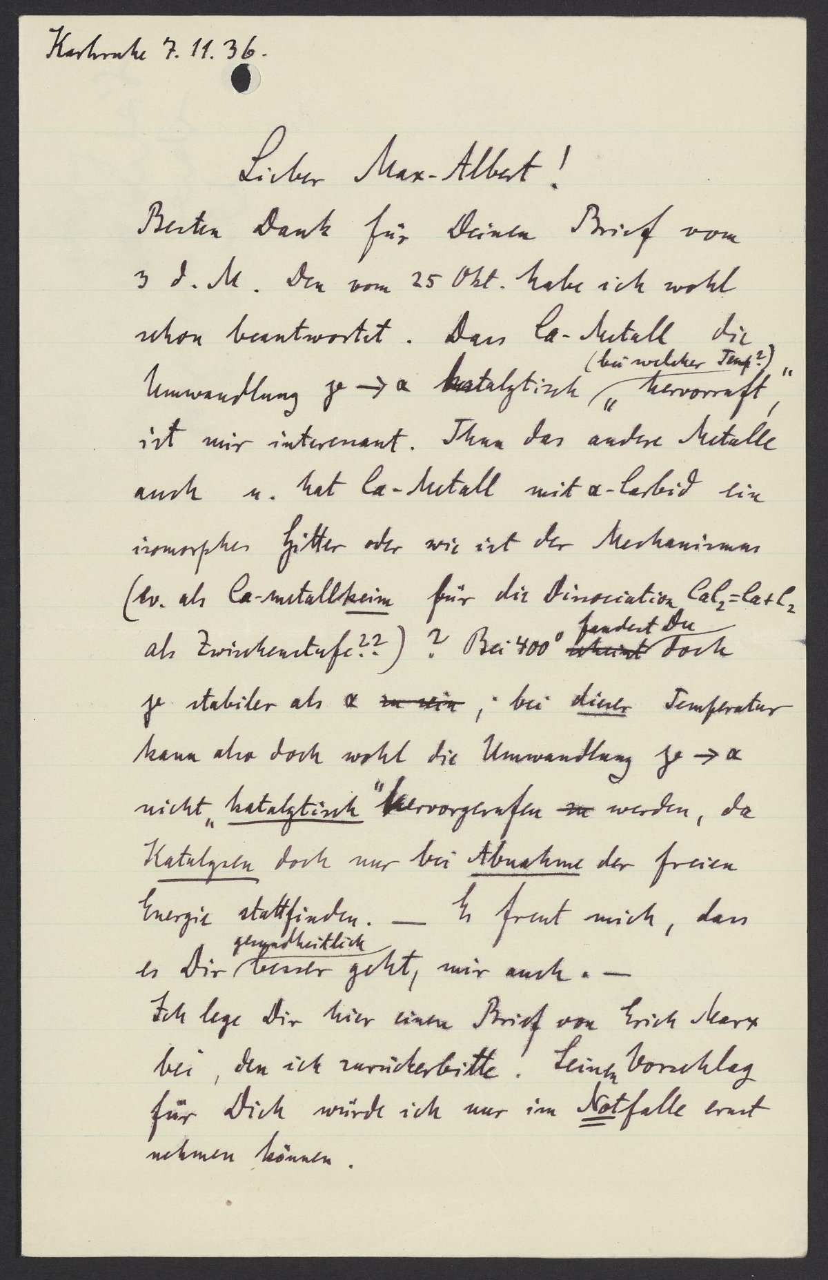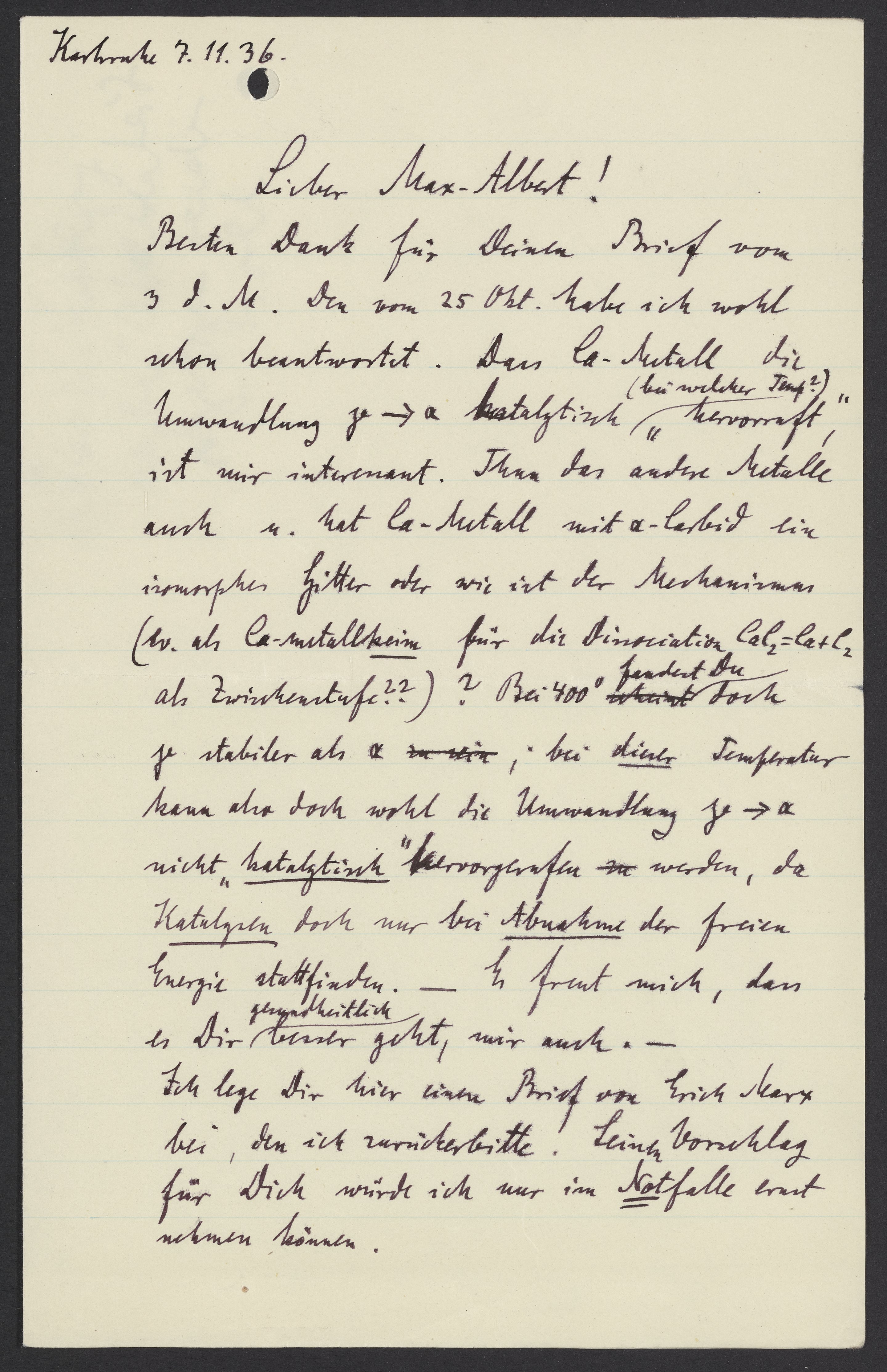 Besten Dank für Deinen Brief von 3. d. M. Den vom 25. Okt. habe ich wohl schon beantwortet. Dass Ca-Metall die Umwandlung γ --> α katalytisch (bei welcher Temp.?) „hervorruft“, ist mir interessant. Thun das andere Metalle auch u. hat Ca-Metall mit α – Carbid ein isomorphes Gitter oder wie ist der Mechanismus? (ev. als Ca-Metallkeim für die Dissoziation CaC2 = Ca + C2 als Zwischenstufe??)? Bei 400° fandest Du doch ja stabiler als α, bei dieser Temperatur kann also doch wohl die Umwandlung γ --> α nicht „katalytisch“ hervorgerufen werden, da Katalysen doch nur bei Abnahme der freien Energie stattfinden. – Es freut mich, dass es Dir gelegentlich besser geht, mir auch. –