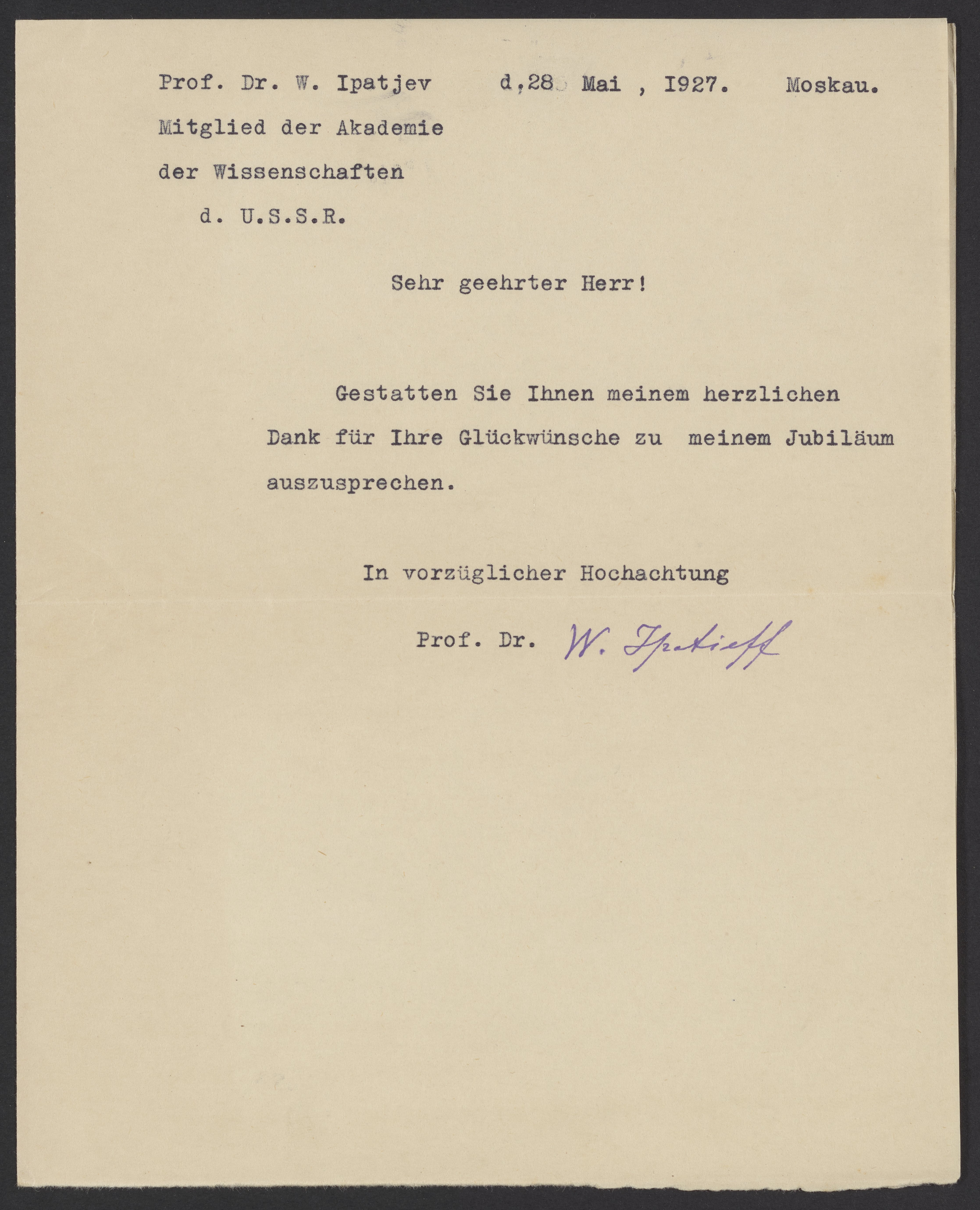 Thank you letter from Vladimir Ipatieff (1867-1952) to Georg Bredig (1868-1944). Ipatieff, also spelled Iptyev, was a Russian chemist who made contributions in the field of petroleum chemistry and catalysts. In 1930, he fled Russia and immigrated to the United States where he became a chemistry professor at Northwestern University.