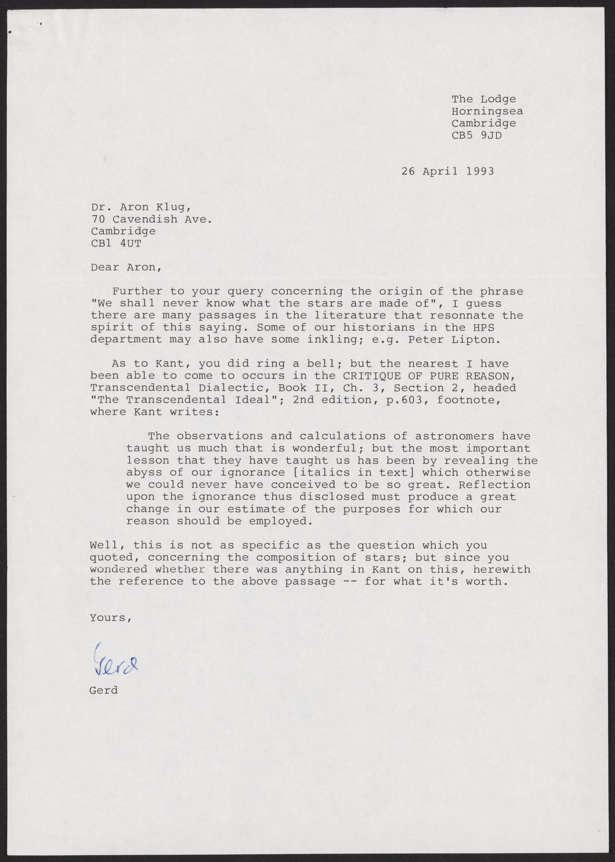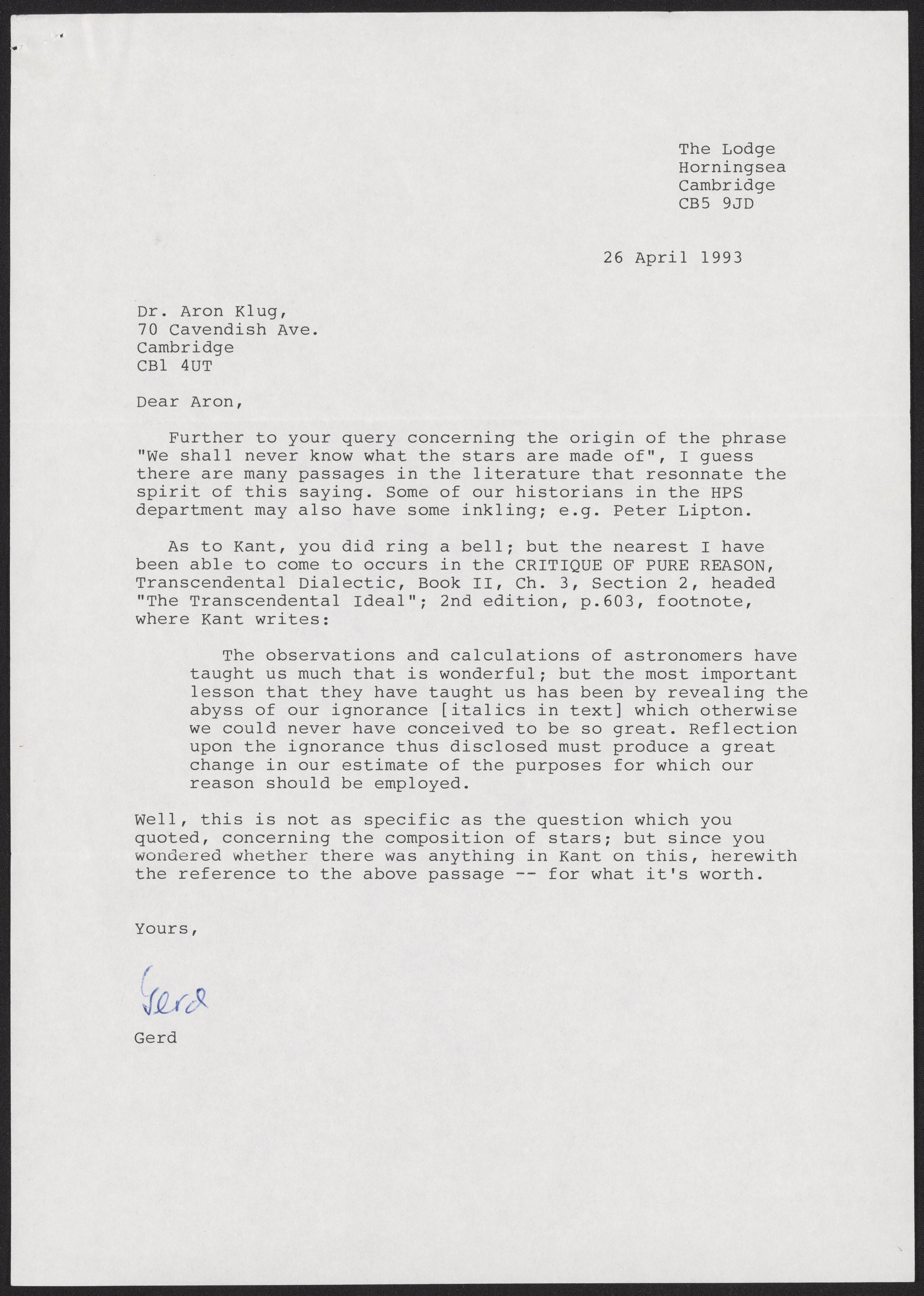 Letter from Gerd Buchdahl to Aaron Klug, April 26, 1993